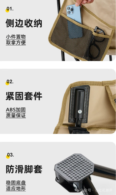 4、细节设计贴心:侧袋收纳,紧固套件,防滑脚套;