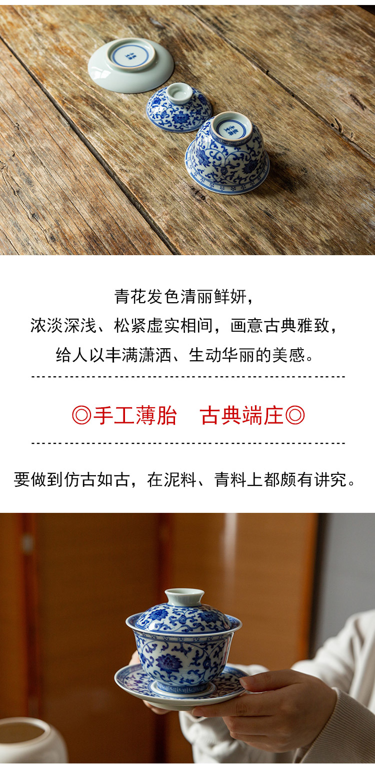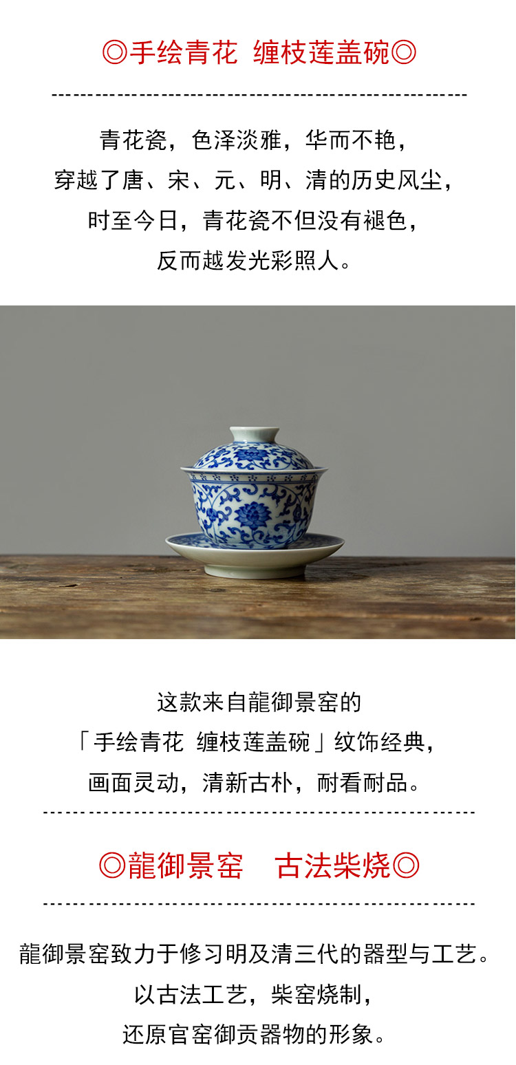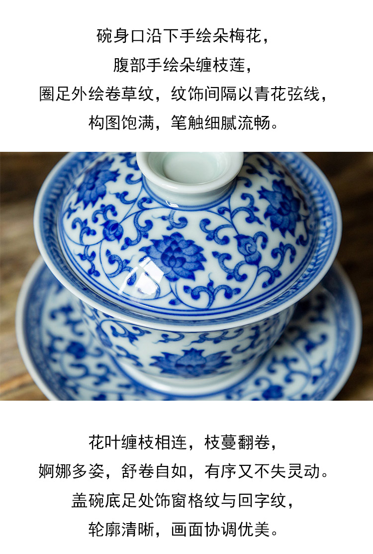 茶香记 手绘青花 缠枝莲盖碗 龍御景窑 古法柴烧 古典雅致 端庄大气