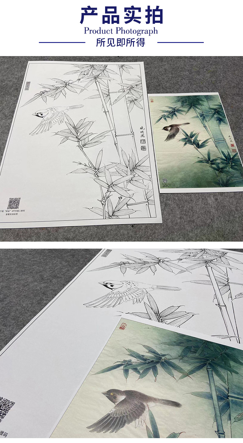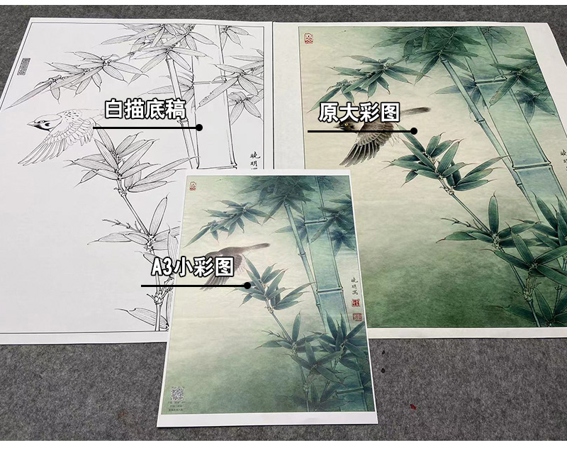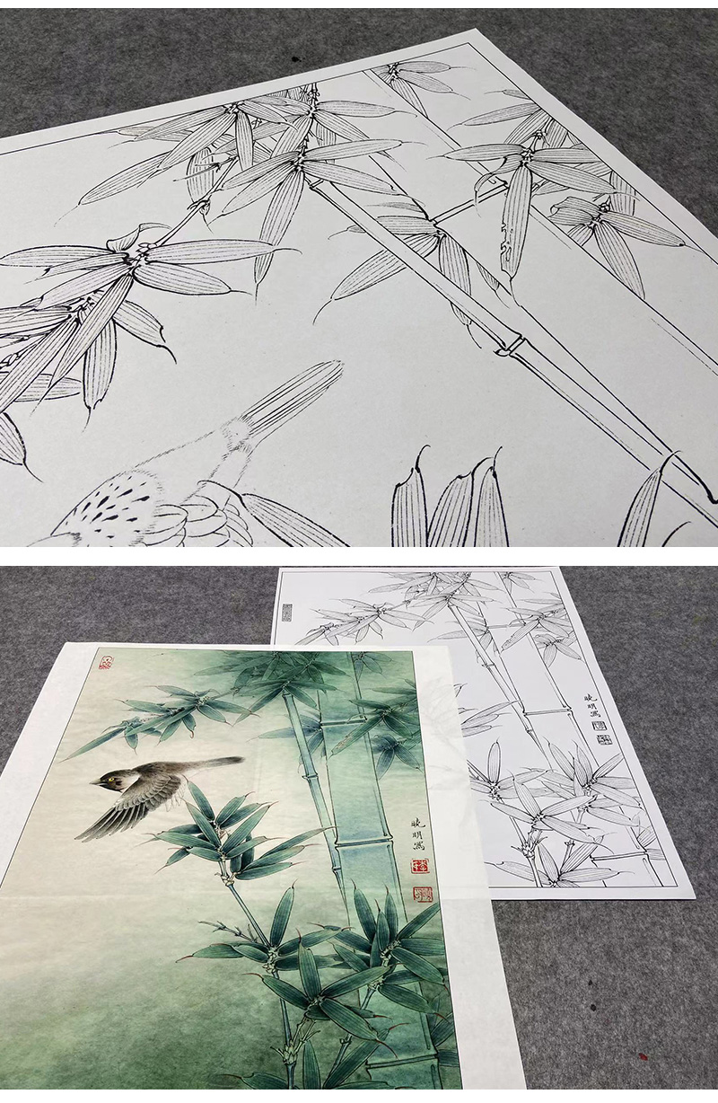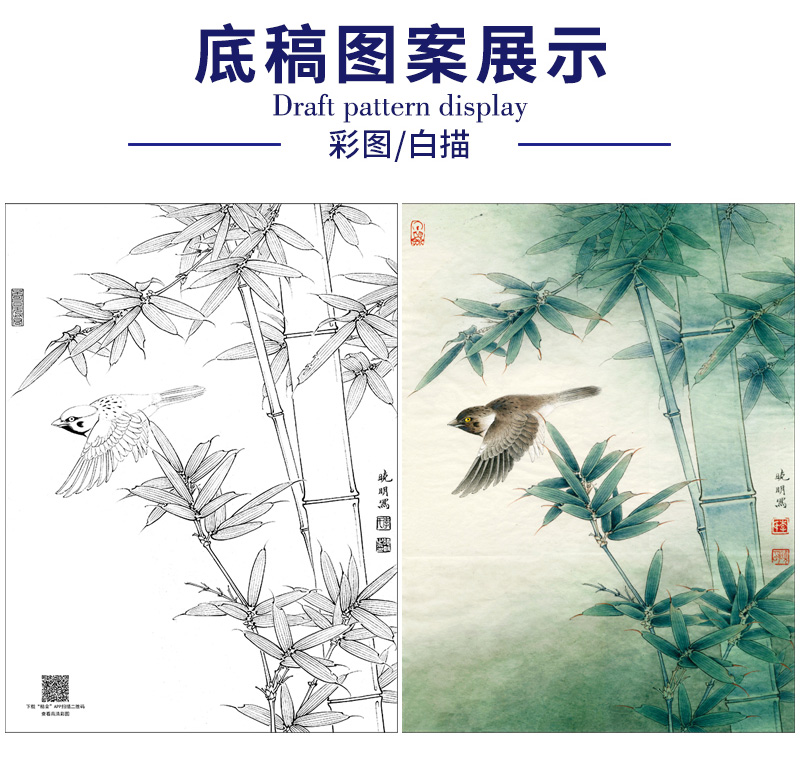 【大彩图】李晓明工笔画白描底稿小品《麻雀翠竹图》临摹勾线花鸟线稿K112