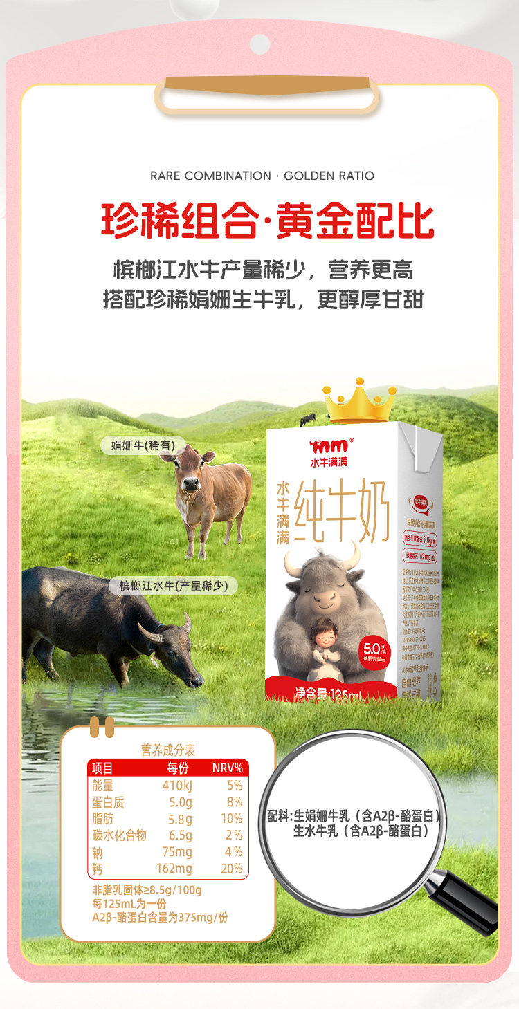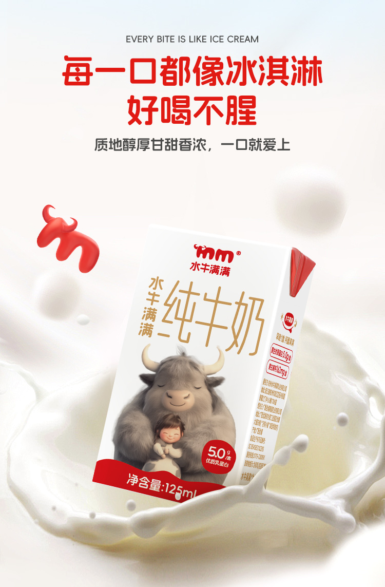 水牛满满5.0水牛纯牛奶」珍贵的娟姗牛奶奶源+槟榔江水牛奶源 高钙高蛋白,温和易吸收,吃菠萝和甘蔗的水牛产的奶,自然甘甜,口感醇厚,就像融化的冰淇淋。
