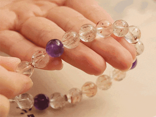 紫水晶颜色饱满、超七水晶发丝丰富,本就已经罕有,尤其是用到10mm的大直径,戴在手上有种富养的千金感!