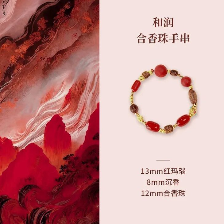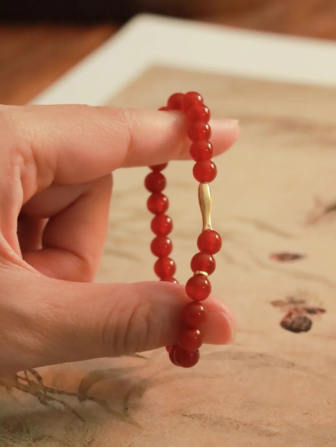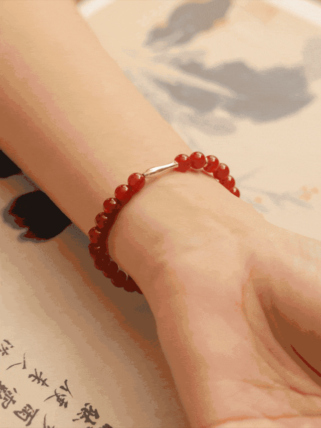 玛瑙的通透光泽为不偏不倚的朱红增加了一点灵动,戴在手腕衬托肤色白皙、气血感十足。
