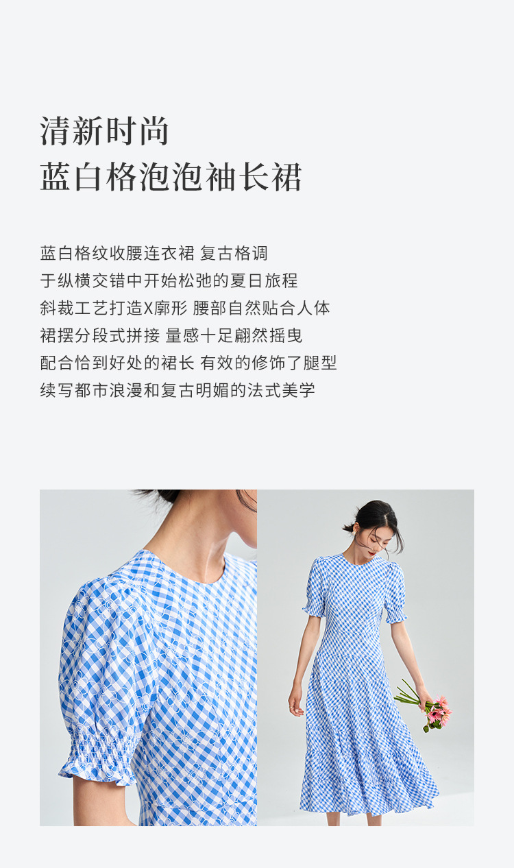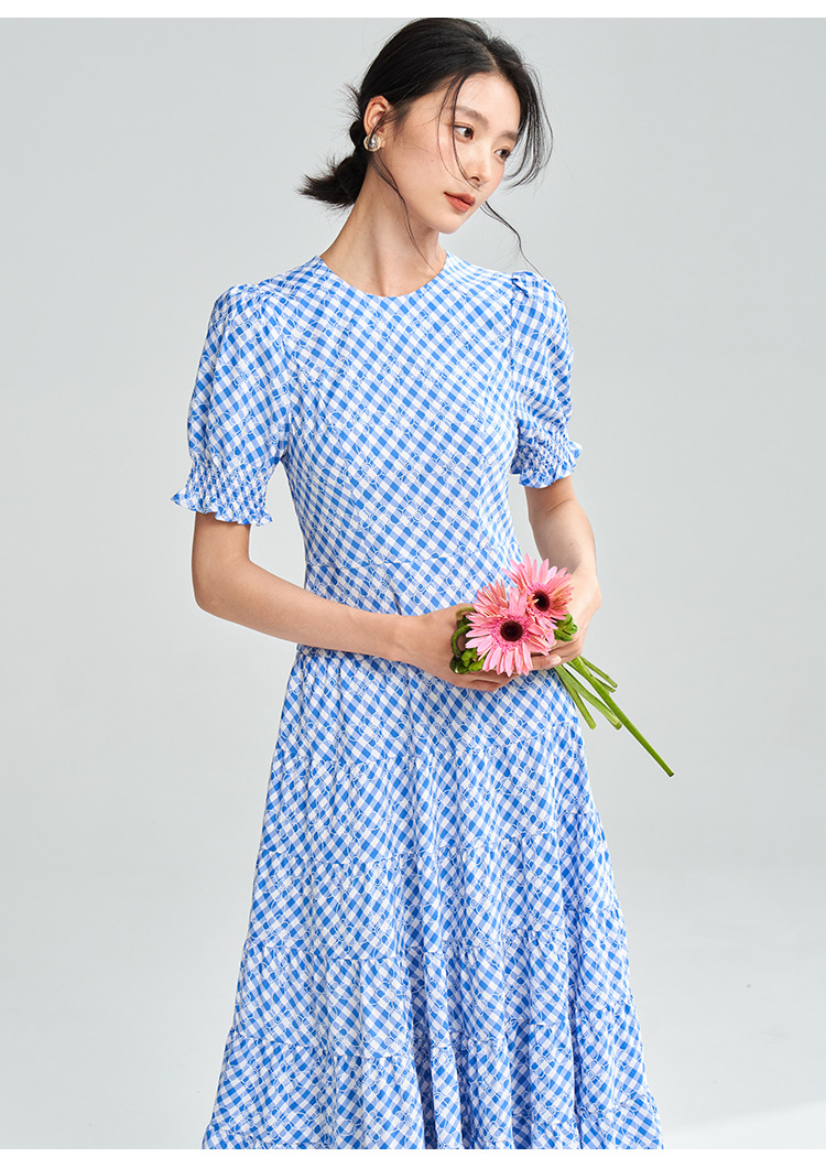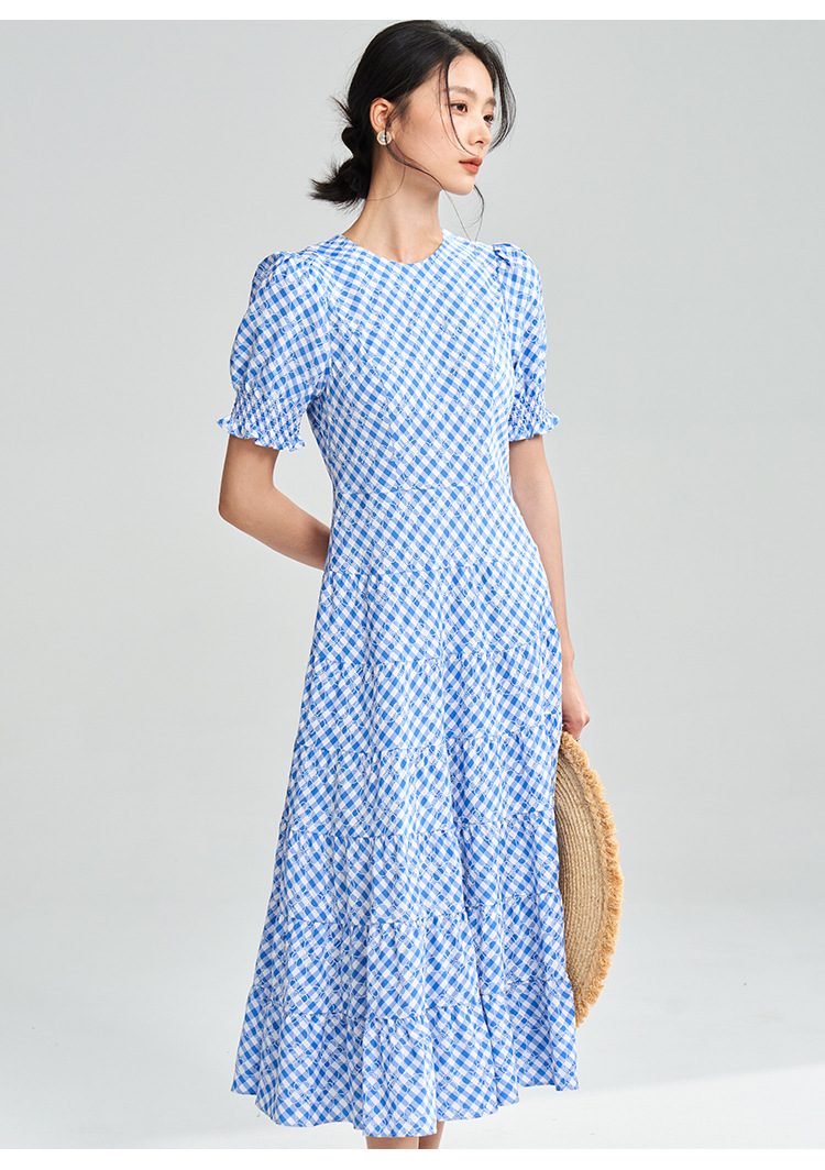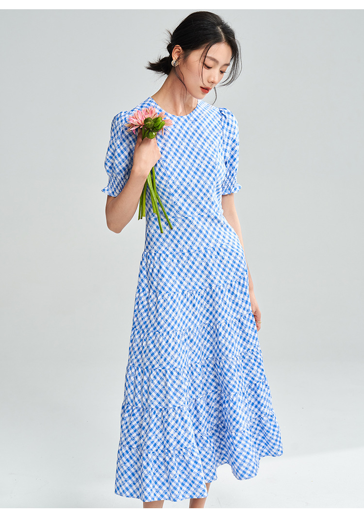 丁摩 夏季新款蓝白格子气质收腰连衣裙女短袖长裙5ZF-18280