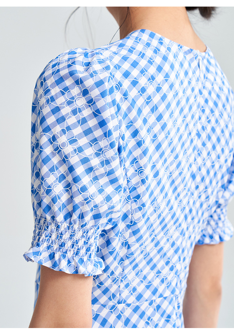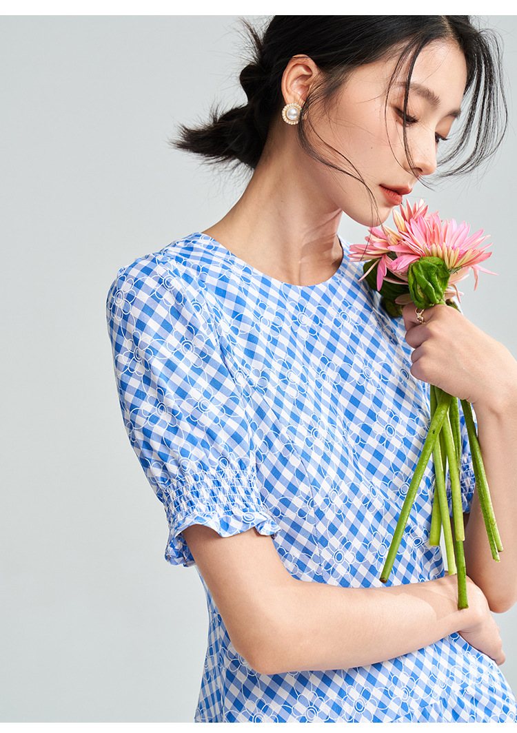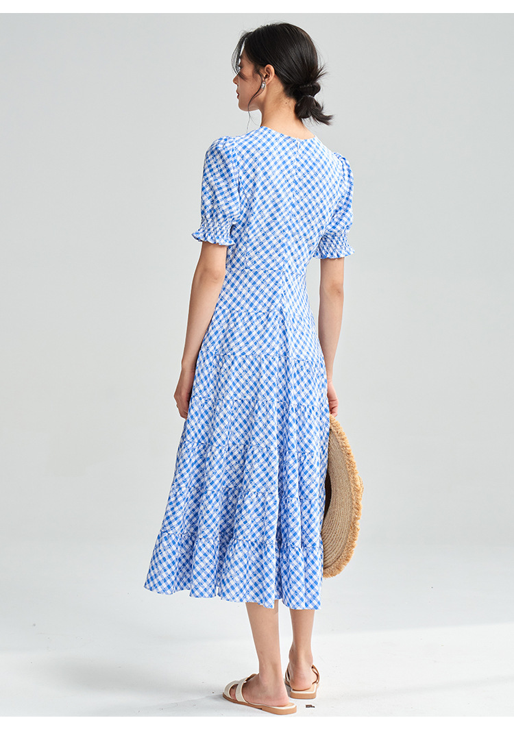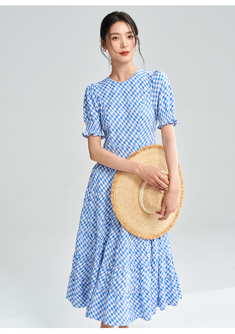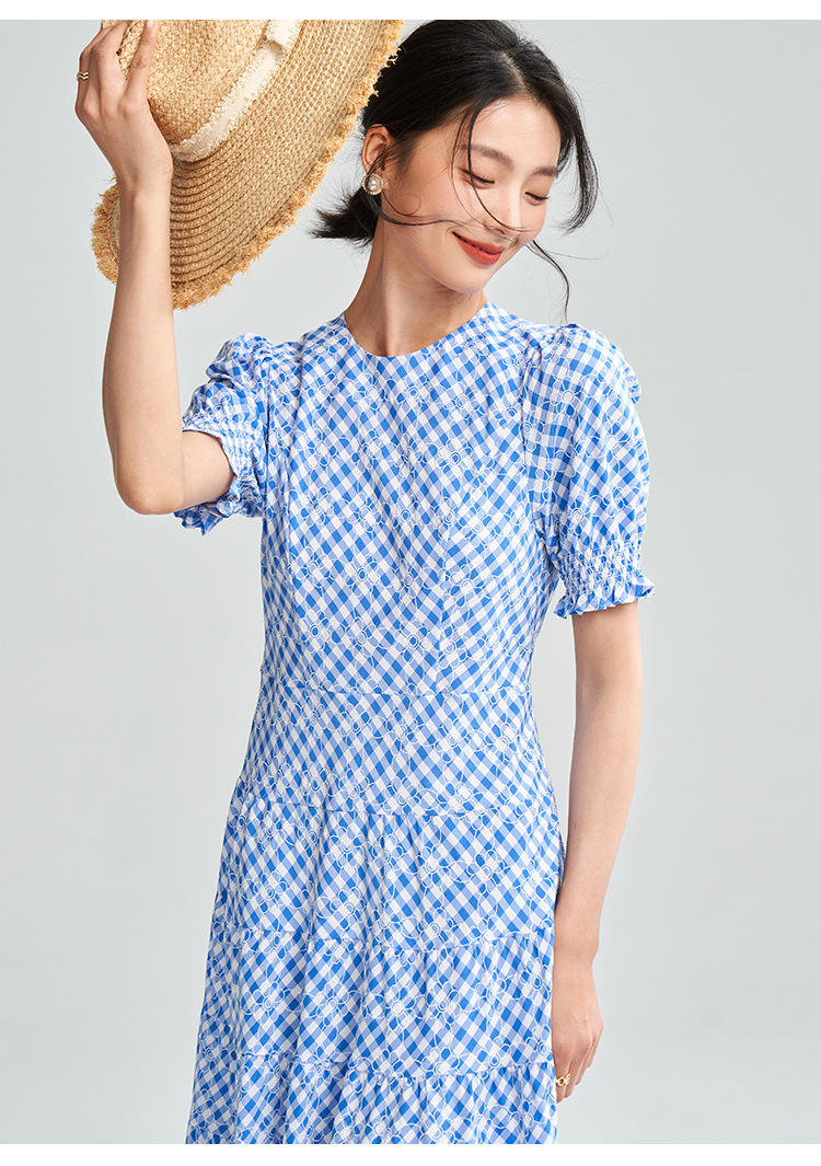 丁摩 夏季新款蓝白格子气质收腰连衣裙女短袖长裙5ZF-18280