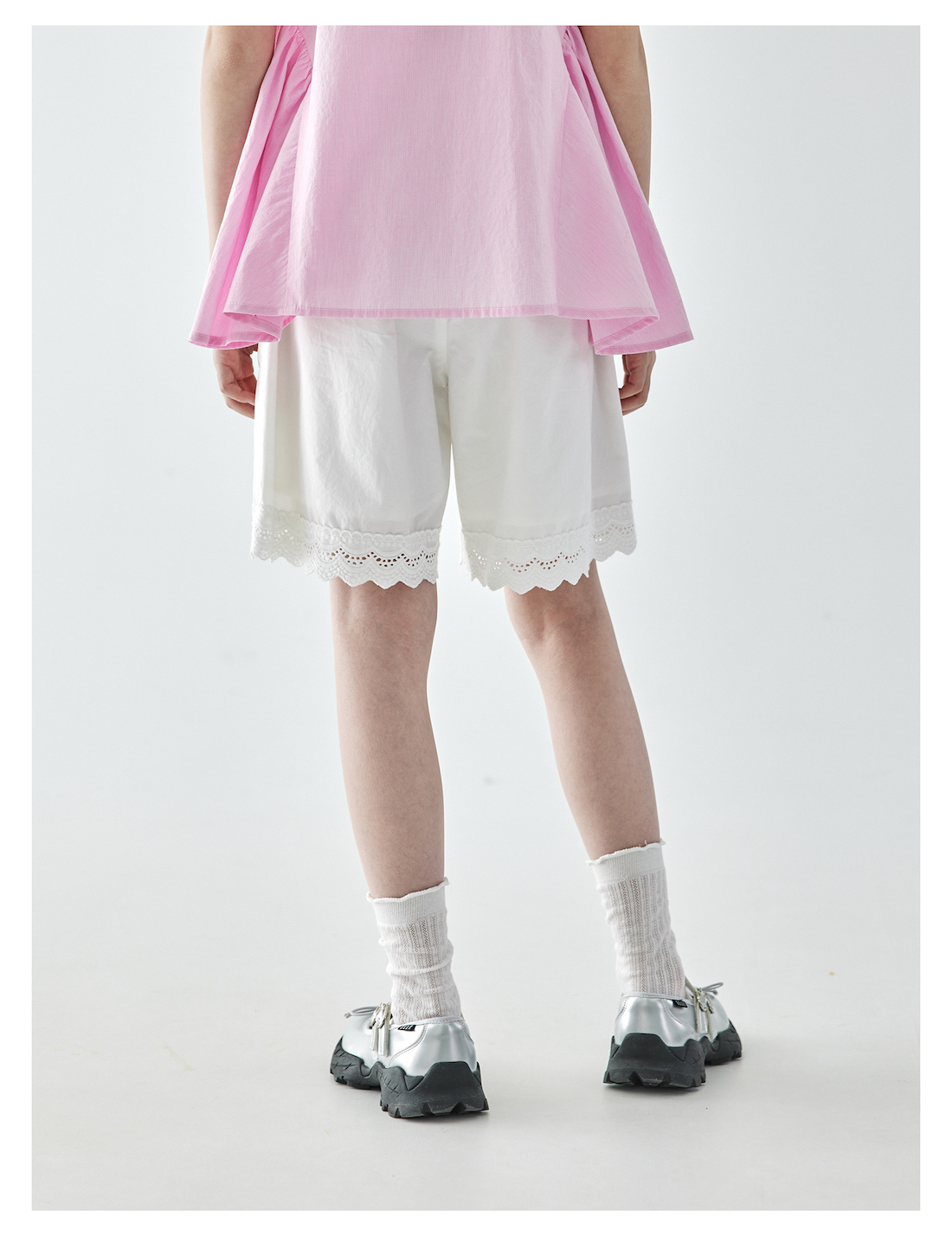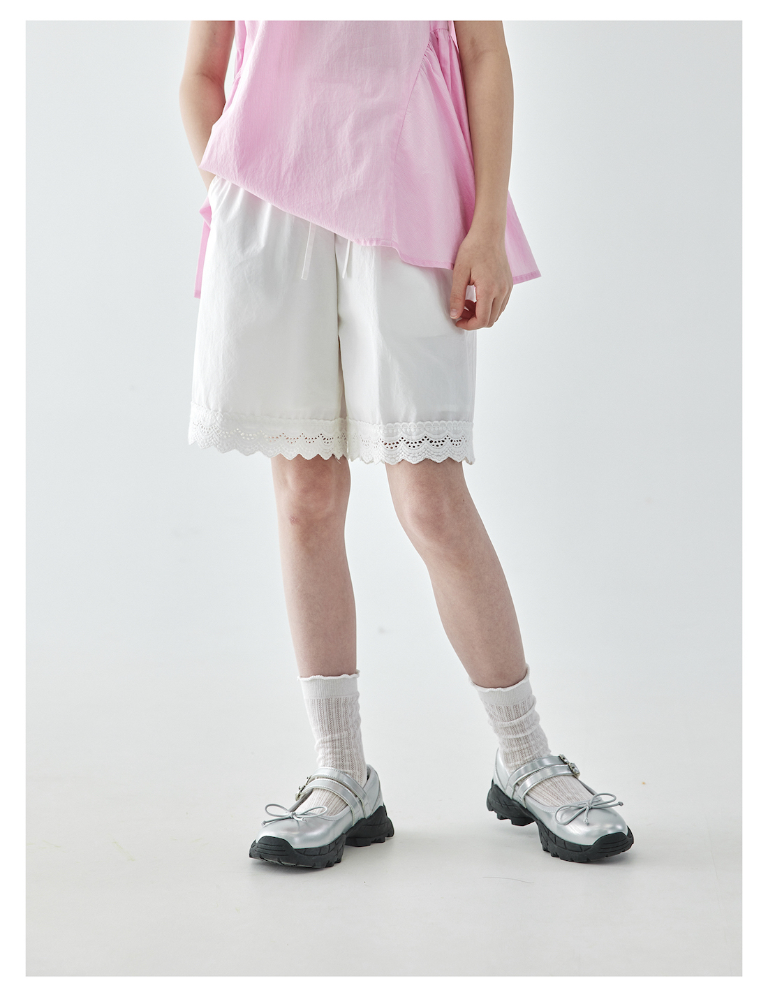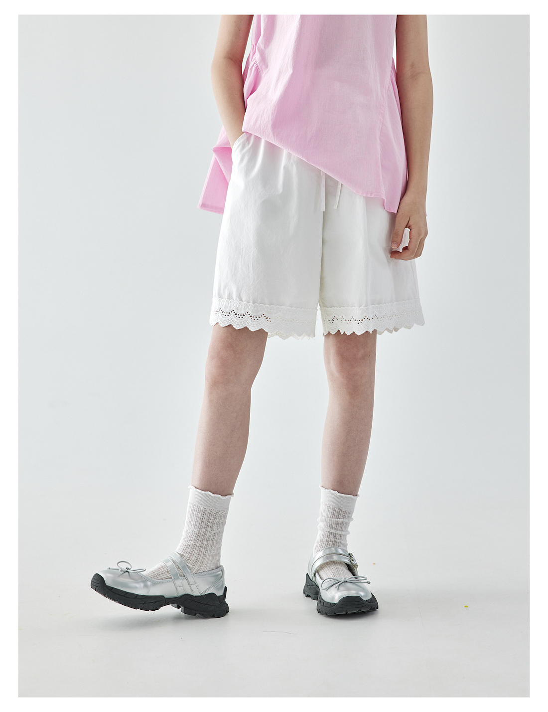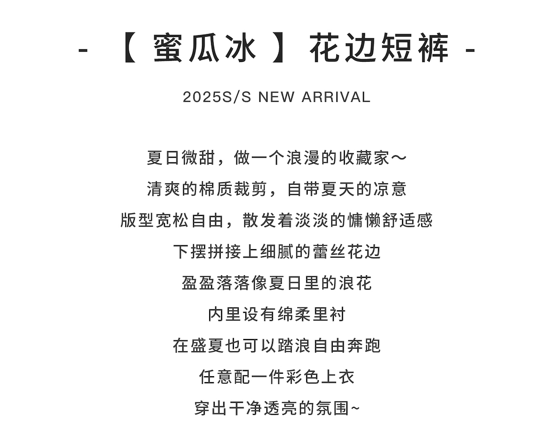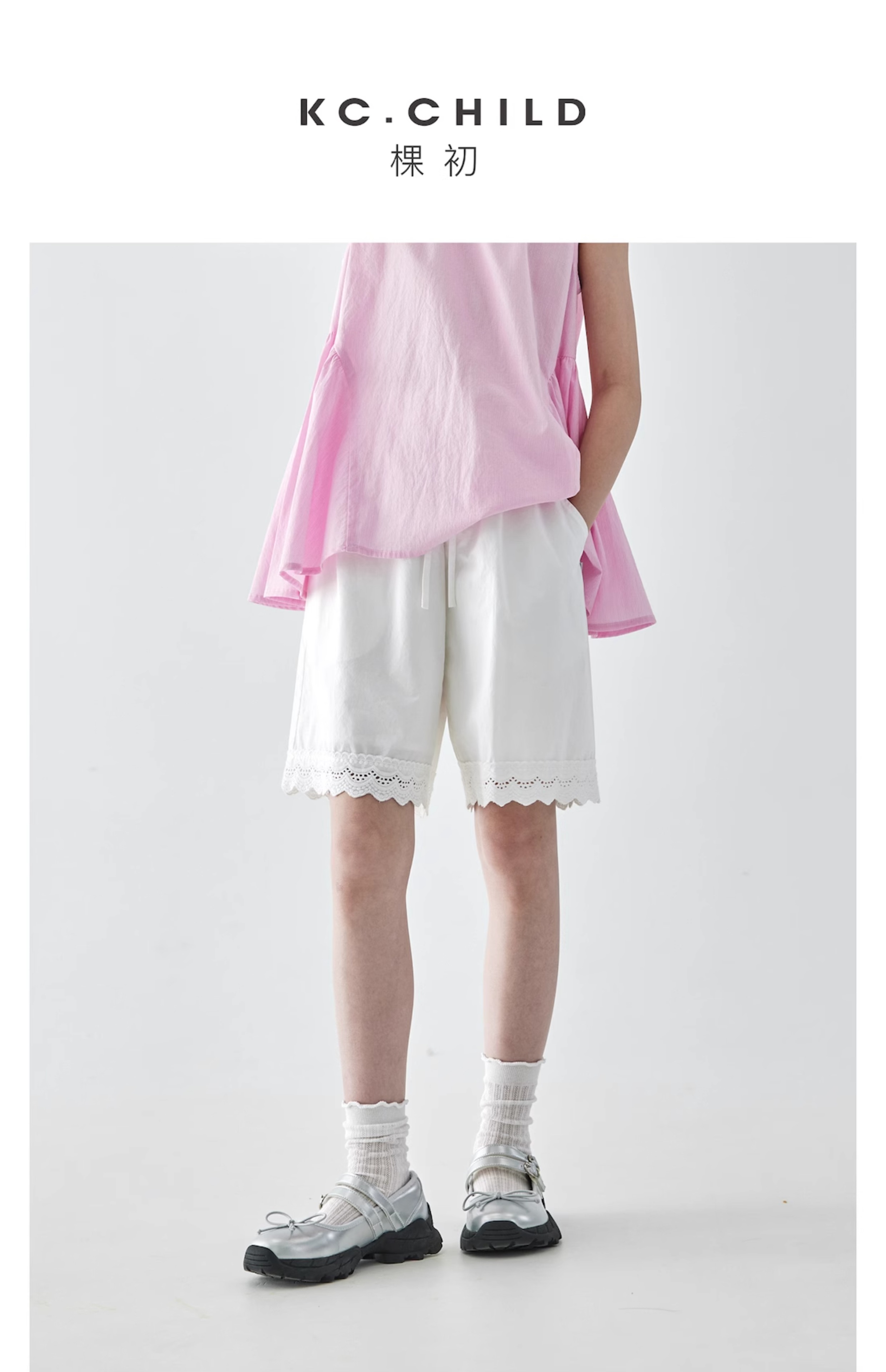 棵初2025夏季新款亲子中大女童白色花边短裤蕾丝拼接宽松裤子