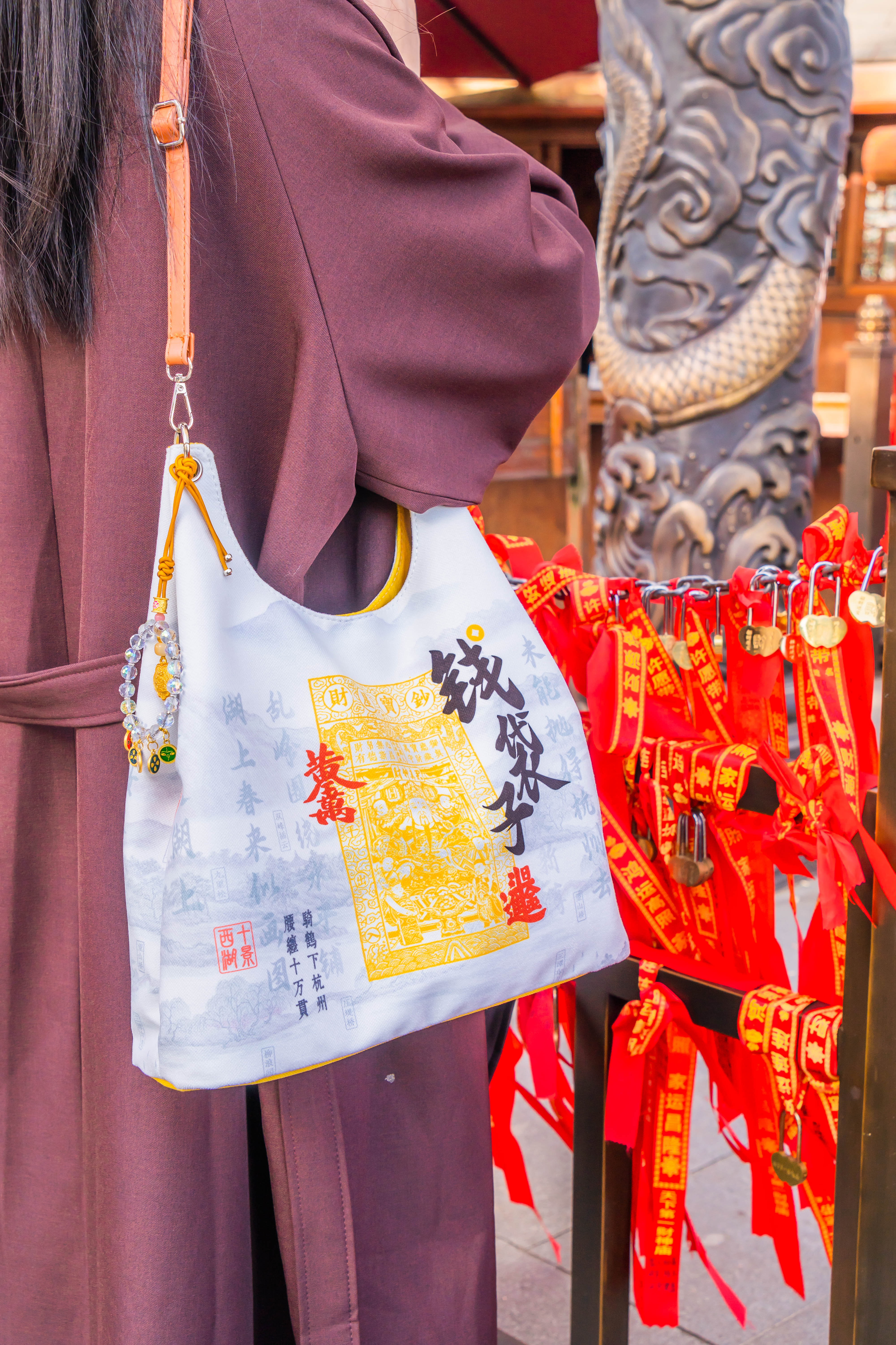 1.背景图形采用了清代画家董邦达的《西湖十景图》,描绘了绝美的西湖十景,该画曾被乾隆皇帝收藏。寓意把西湖美景和财神的祝福随身携带