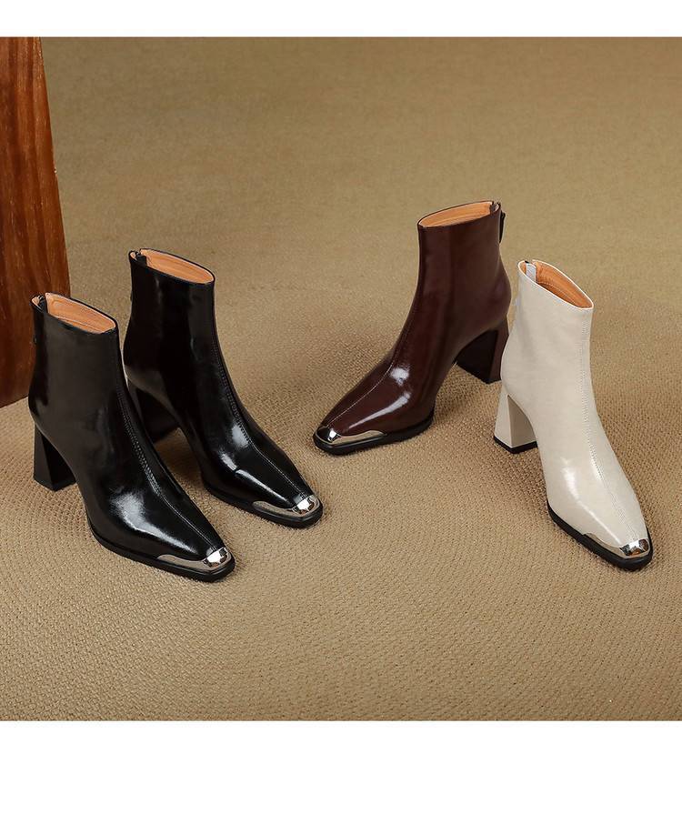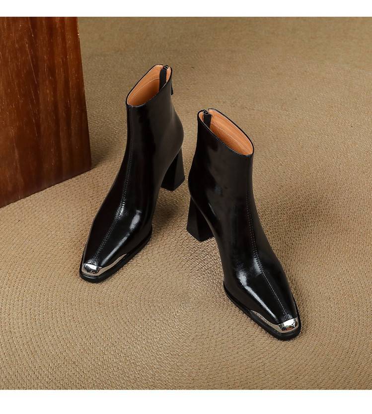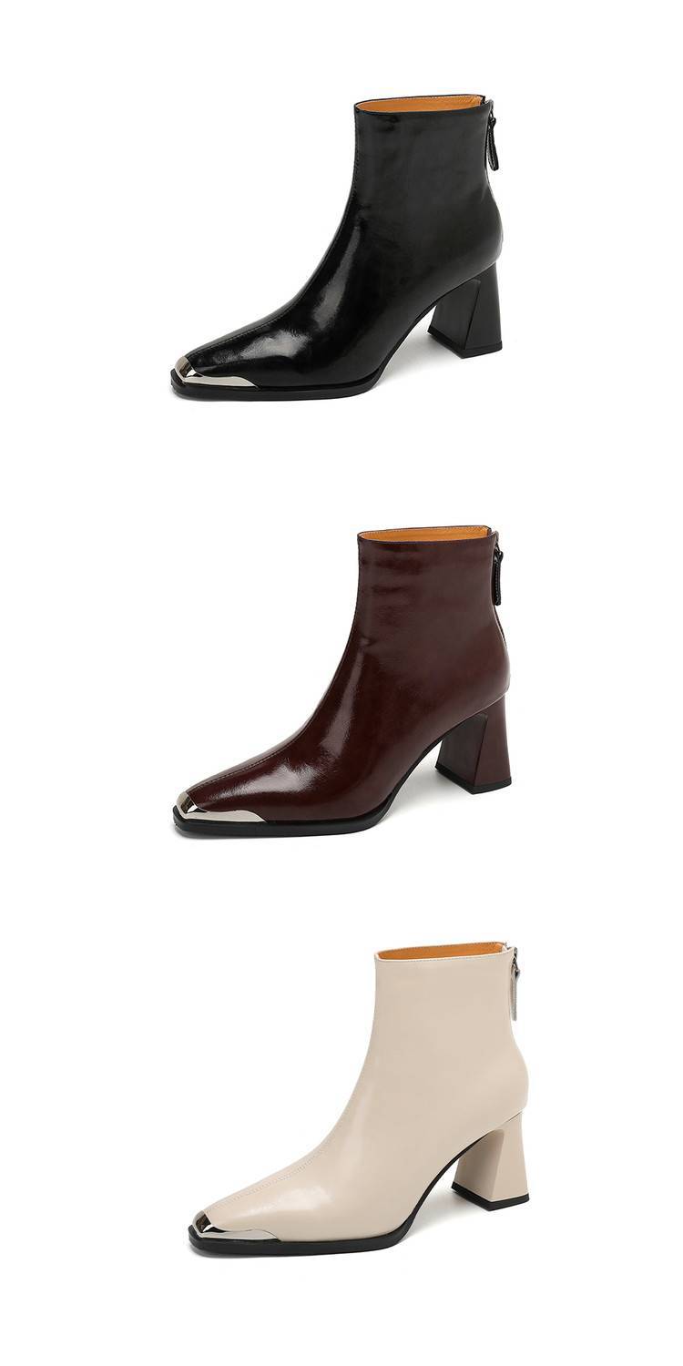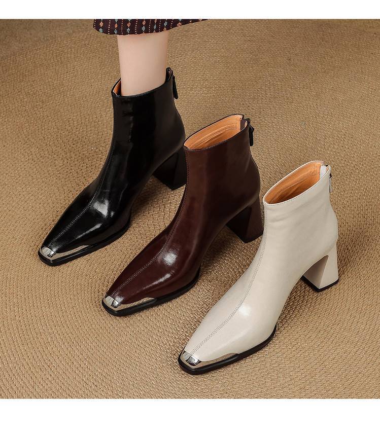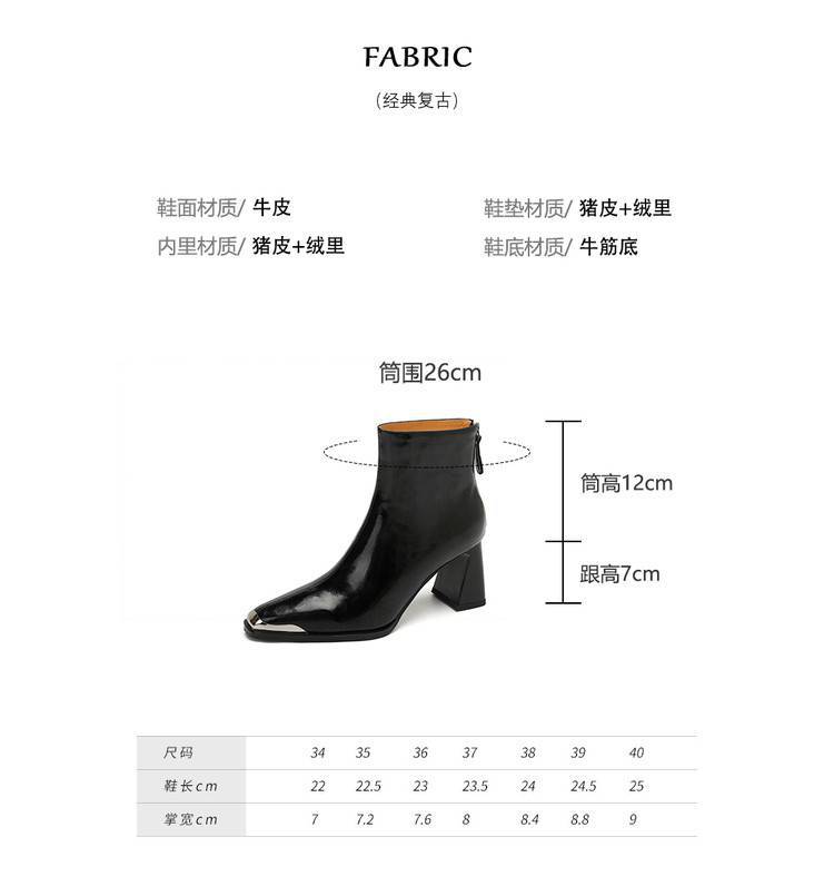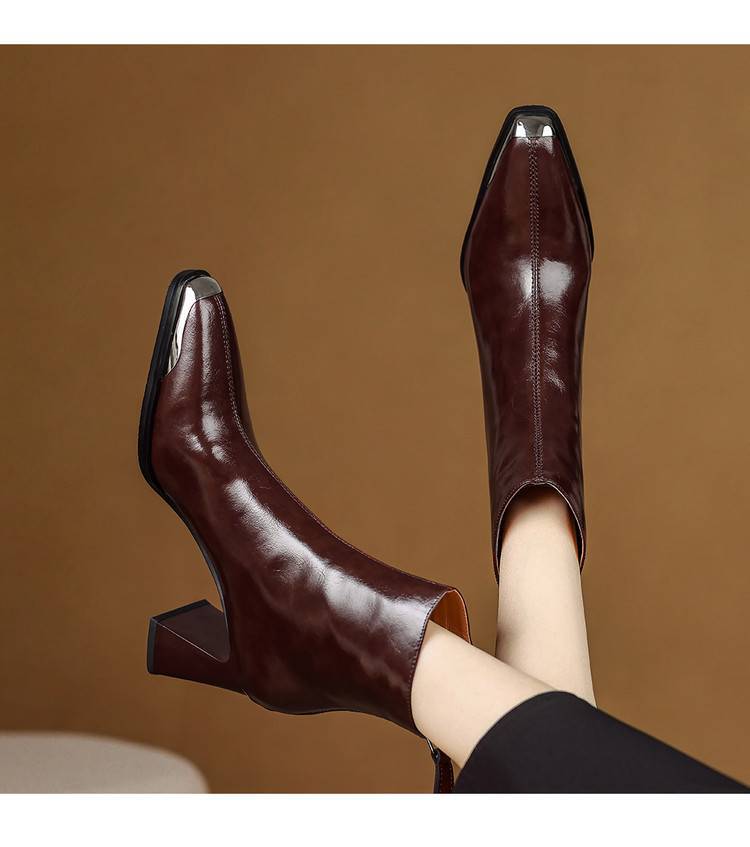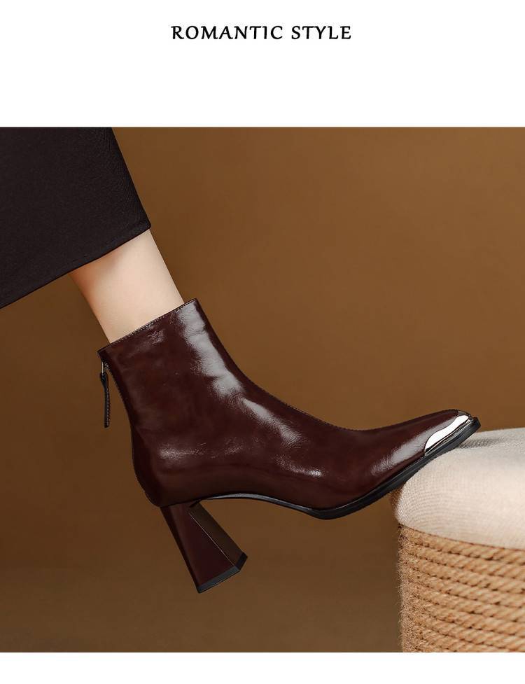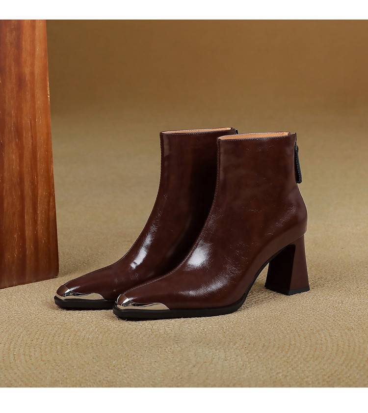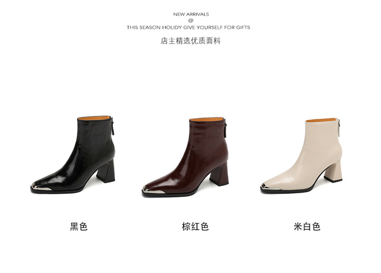 【预售5天】里外全皮轻奢风金属小方头粗跟厚拉链及踝靴法式高跟棕色短靴&sl-8151