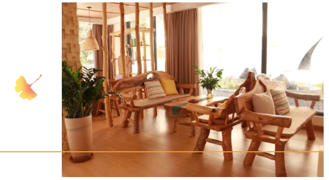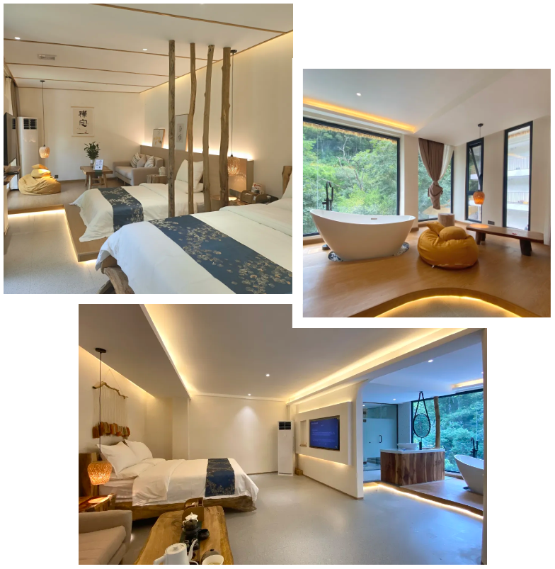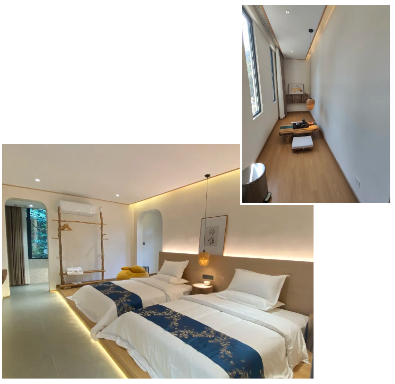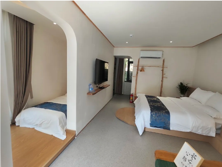 民宿以“慢生活”的自然情怀为设计理念,以山林原生态为景观理念,以舒适生活为内装配套,环顾四周,装修风格自然。大大的落地窗,将户外的景色尽收眼底,紧靠窗子的榻榻米,让人端着一杯茶可以坐上一整天而不厌倦。