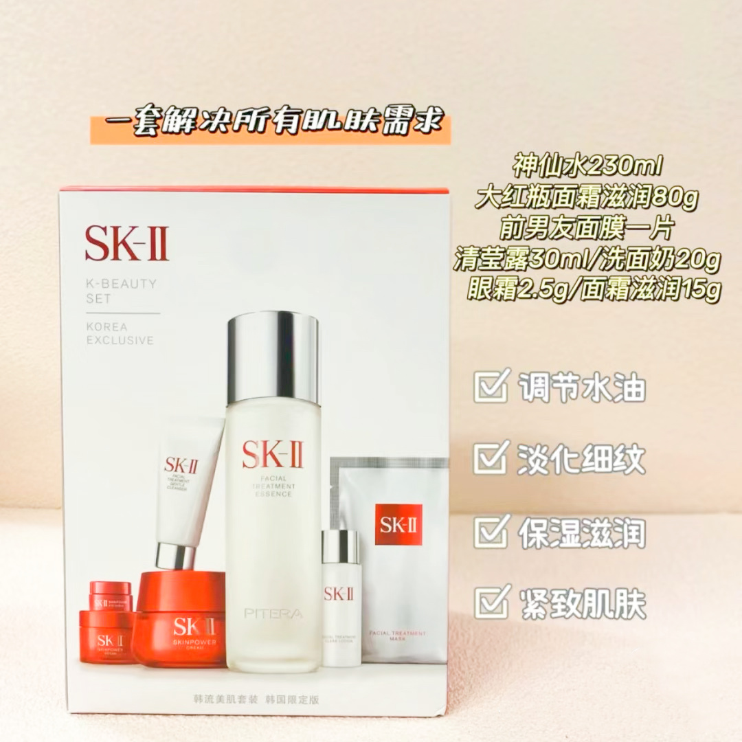 【懒人逆龄】SK-ⅡSK2 神仙水美肌套装 七件套「神仙水230ml+面霜80g+前男友面膜1片+滋润面霜15g+清莹露30ml+洗面奶20g+眼霜2.5g」【香港直邮】