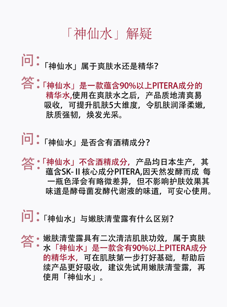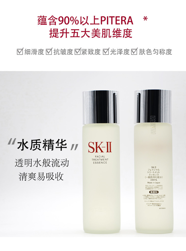 【商品名称】:SK2神仙水美肌套装 【商品规格】:神仙水230ml+面霜80g+前男友面膜1片+滋润面霜15g+清莹露30ml+洗面奶20g+眼霜2.5g。 【包装方式】:套盒。 【发货时效】:正常72小时内。 【发货地区】:广东/香港。 【配送快递】:四通一达。 【运费说明】:全国包邮,非偏远地区除外。 【注意事项】:避免阳光直射,存放阴凉干燥处。 |