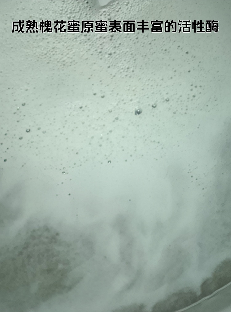 (上图)全熟的枇杷蜜波美度接近44度,全熟蜜摇出来后最主要的特征是表面布满了活性酶,如啤酒沫状态,这是上乘的天然成熟蜜必须有的特征,无法造假。蜂蜜运输过程中的剧烈晃动,蜂蜜中的气泡会上浮到瓶体表面,形成泡沫状的凝结泡沫状,是非常正常的情况。