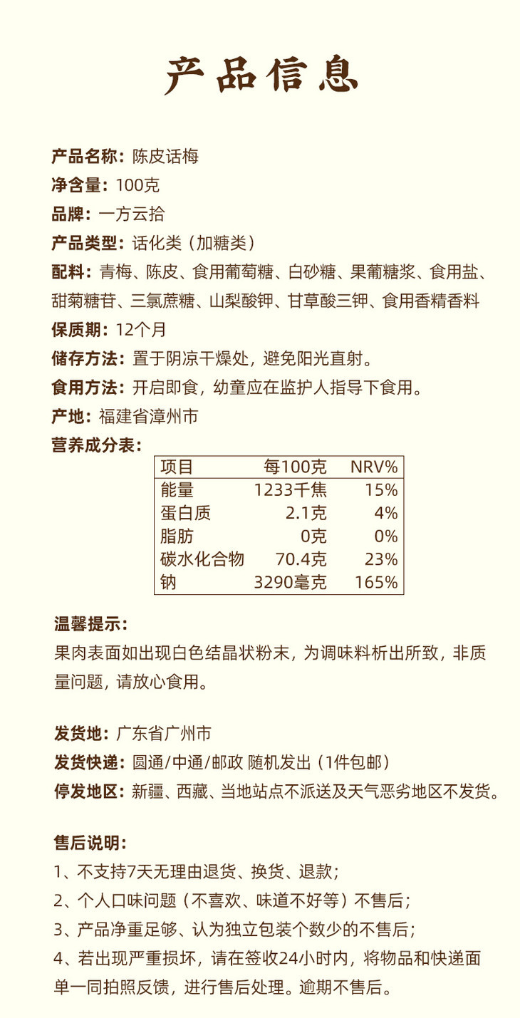 品名:福建陈皮话梅 规格1:100g/袋*2袋(赠送爆浆陈皮糖1袋100g) 规格2:100g/袋*4袋(赠送爆浆陈皮糖2袋100g),拍几份发几个包裹,不一定能同时到达,请耐心等待 发货地/产地:广东@福建 包装方式:袋装 物流信息:默认邮政/韵达/圆通快递,不支持指定快递 发货区域:新疆、西藏不发; 物流详情:周六、周日及节假日除外,正常48小时内发货,到货时间约为2~5天,请耐心等待 售后说明:收到货后有质量问题,在24小时内都可以拍照(坏果+快递单面箱子一起拍)上传,申请按坏果比例理赔或联系客服,生鲜食品性质特殊,不支持7天无理由退换货;因地址错误,手机号联系不上,拒收等造成的损失无法售后;请理解; |