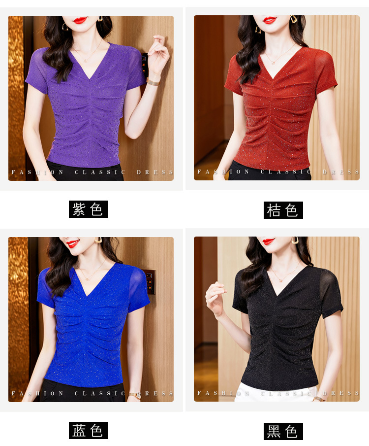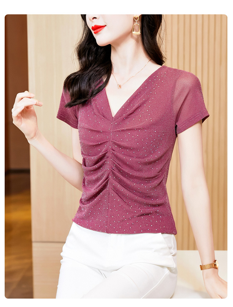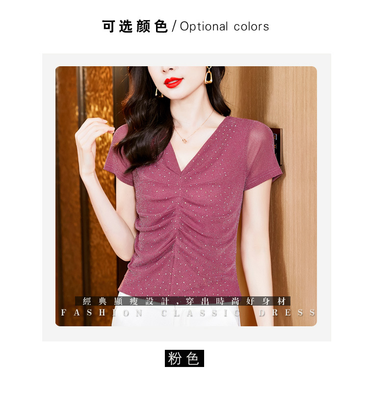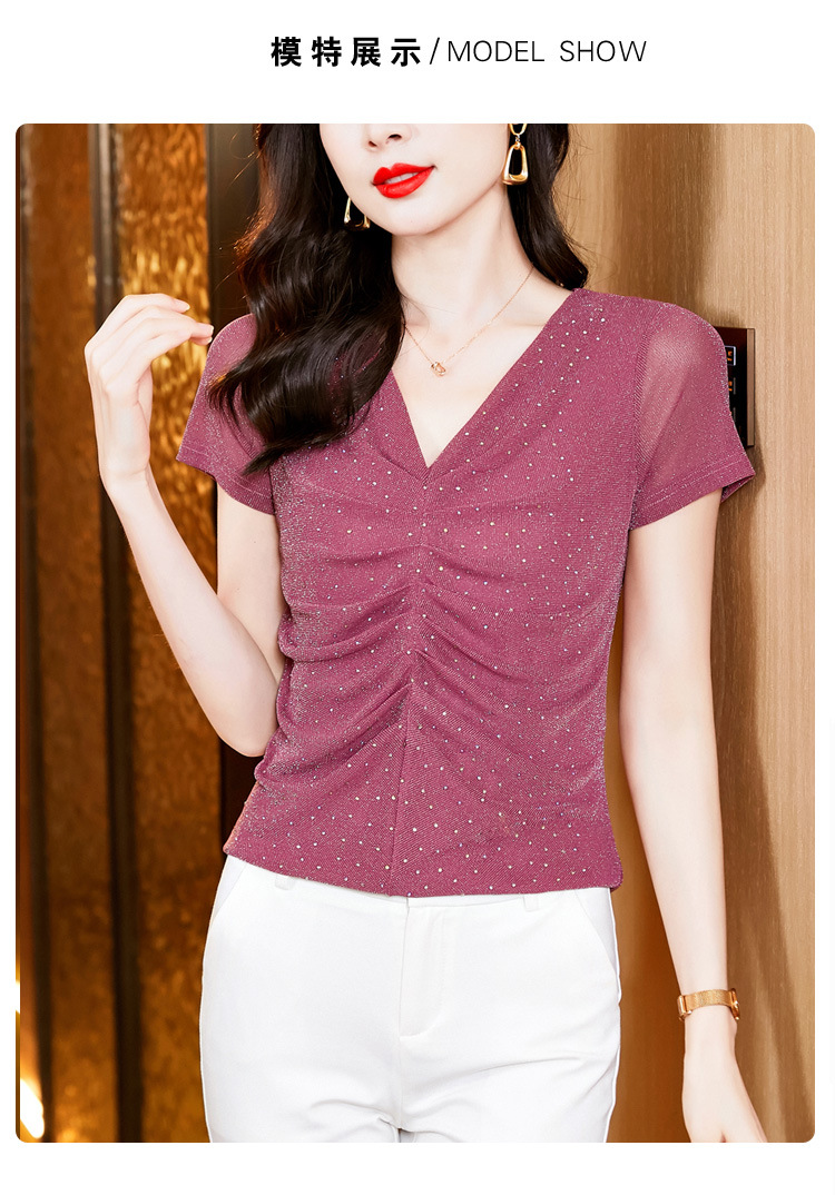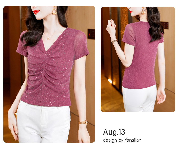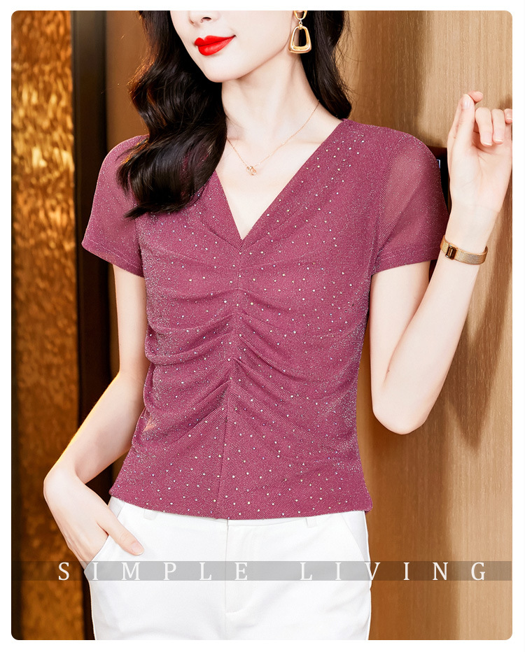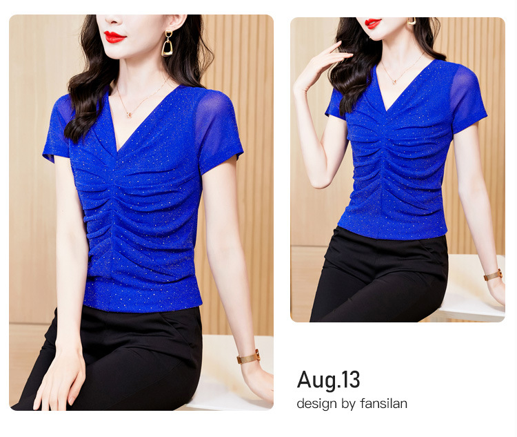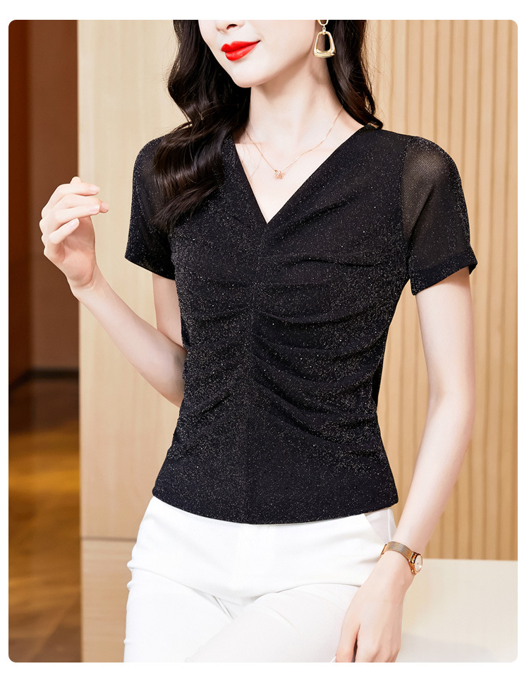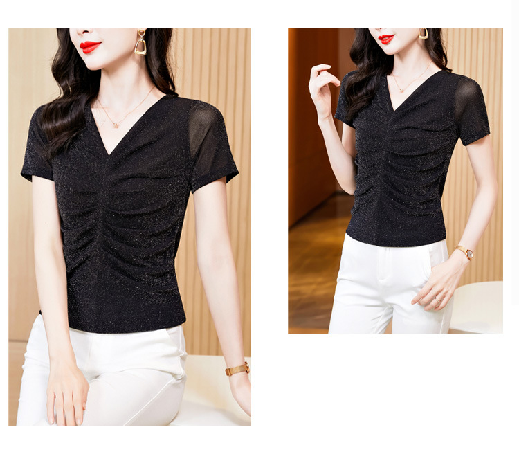 KQL4683气质V领褶皱亮丝网纱修身显瘦小衫