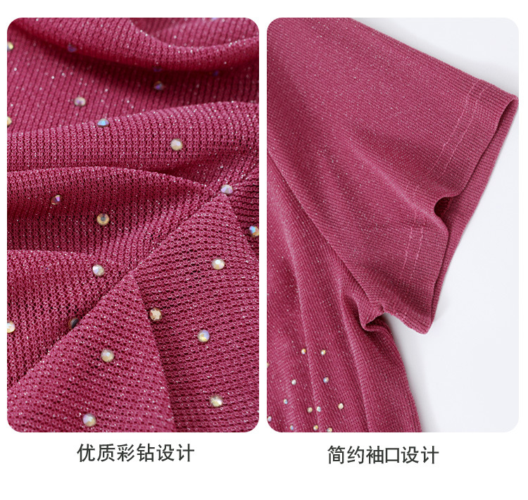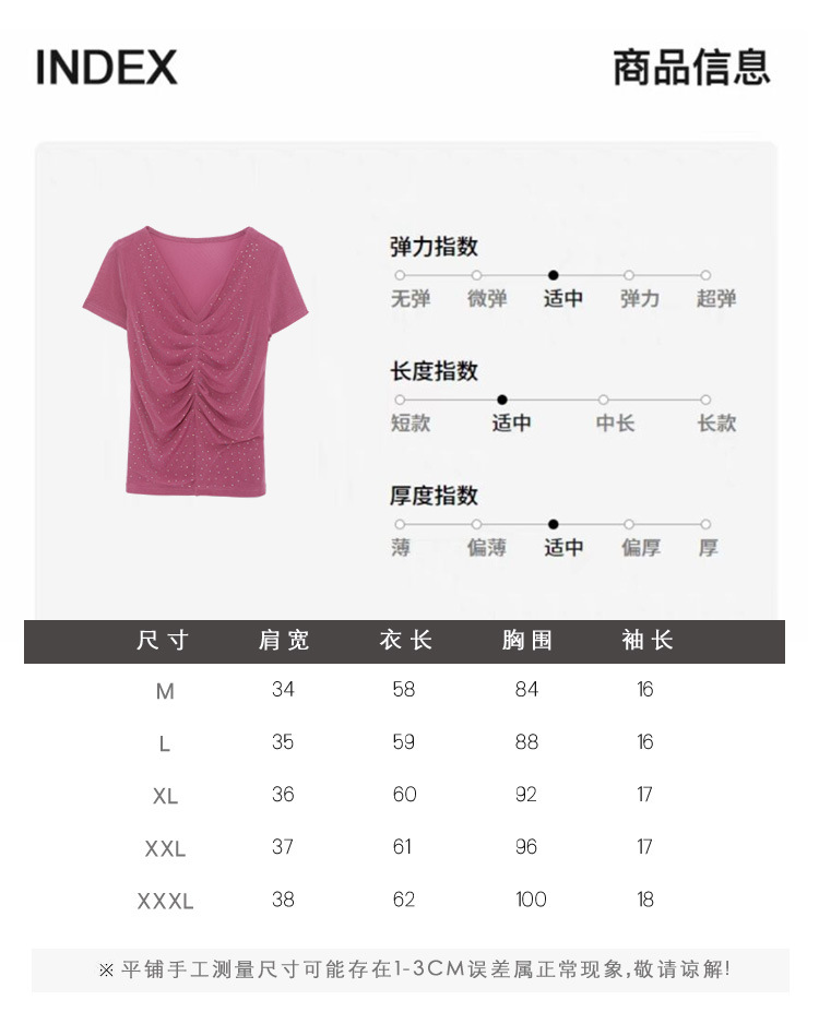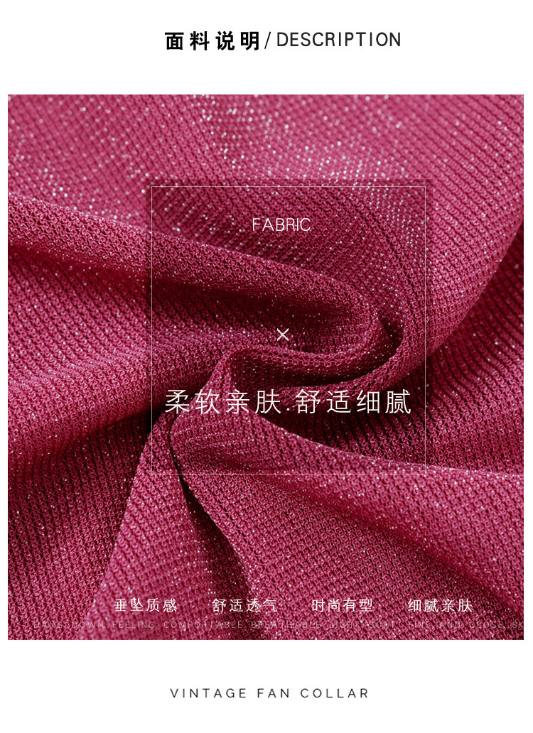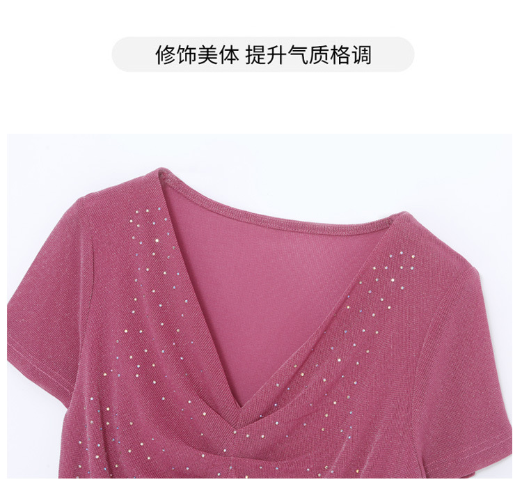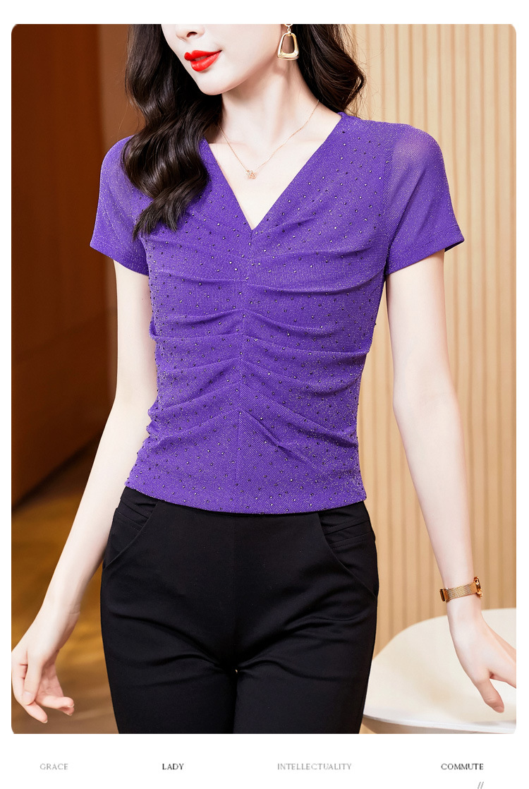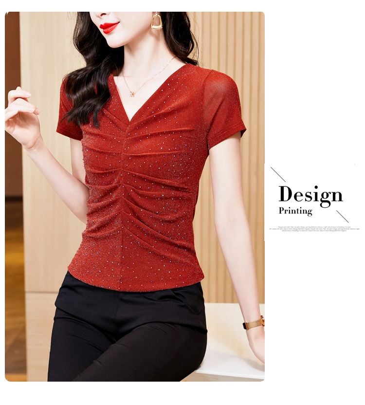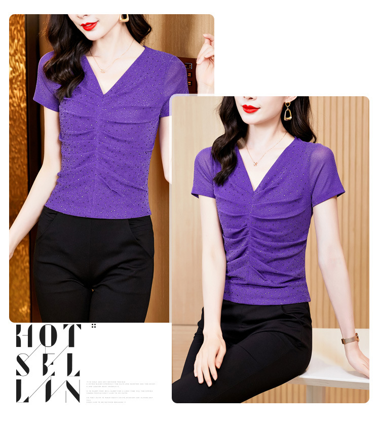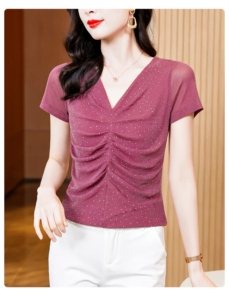 KQL4683气质V领褶皱亮丝网纱修身显瘦小衫