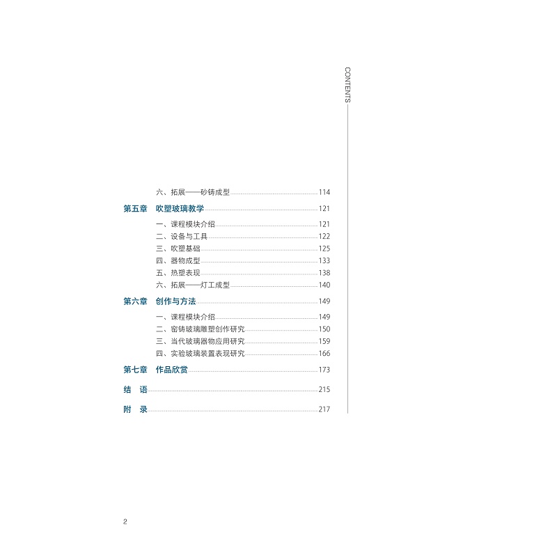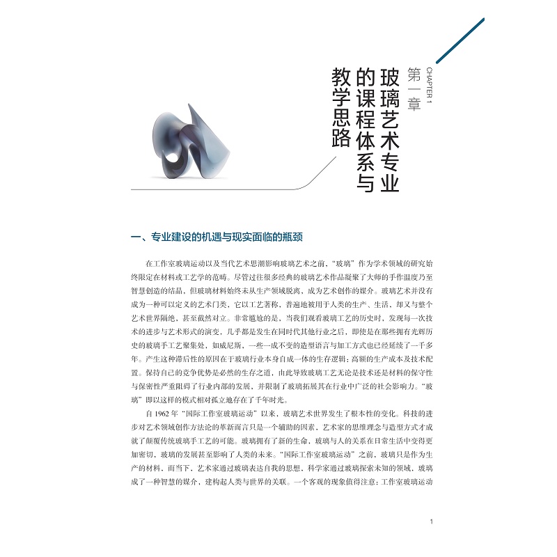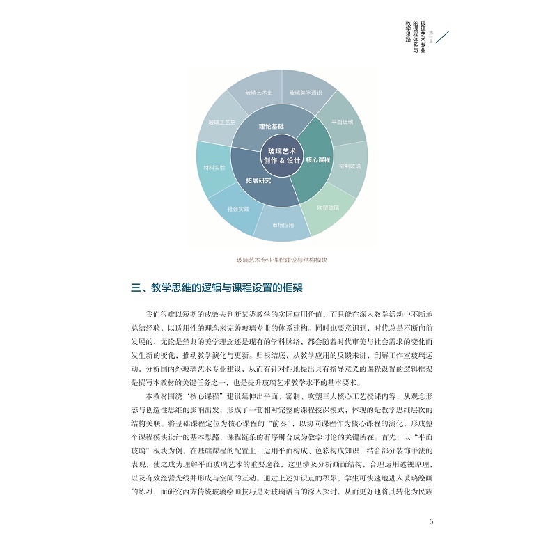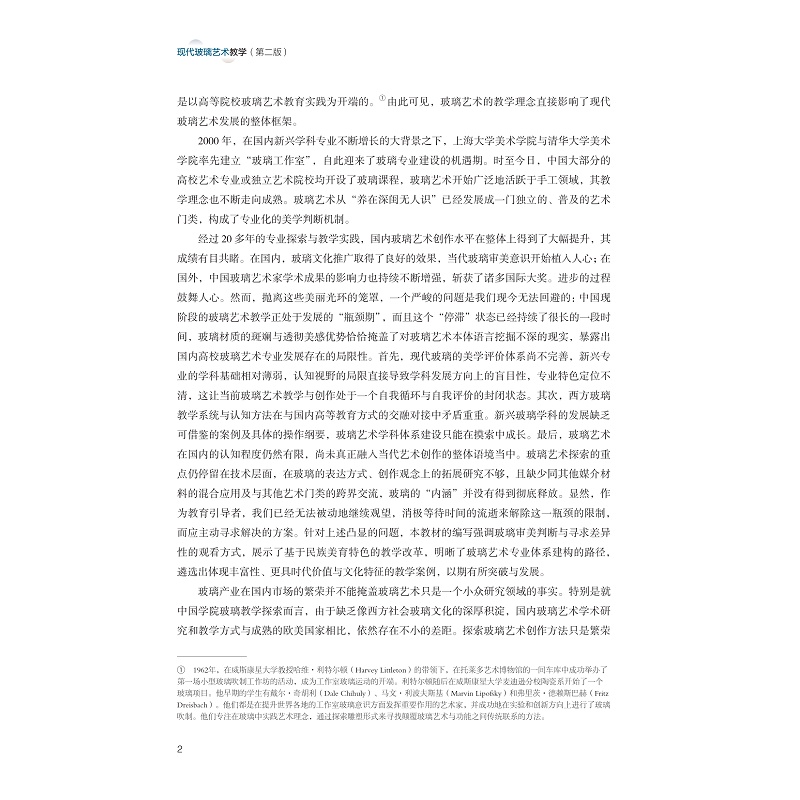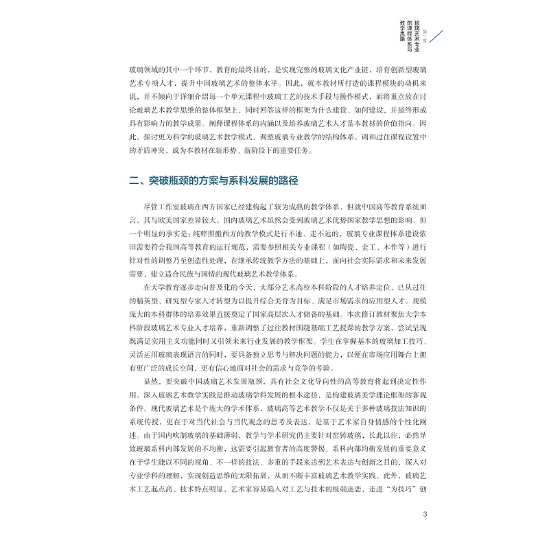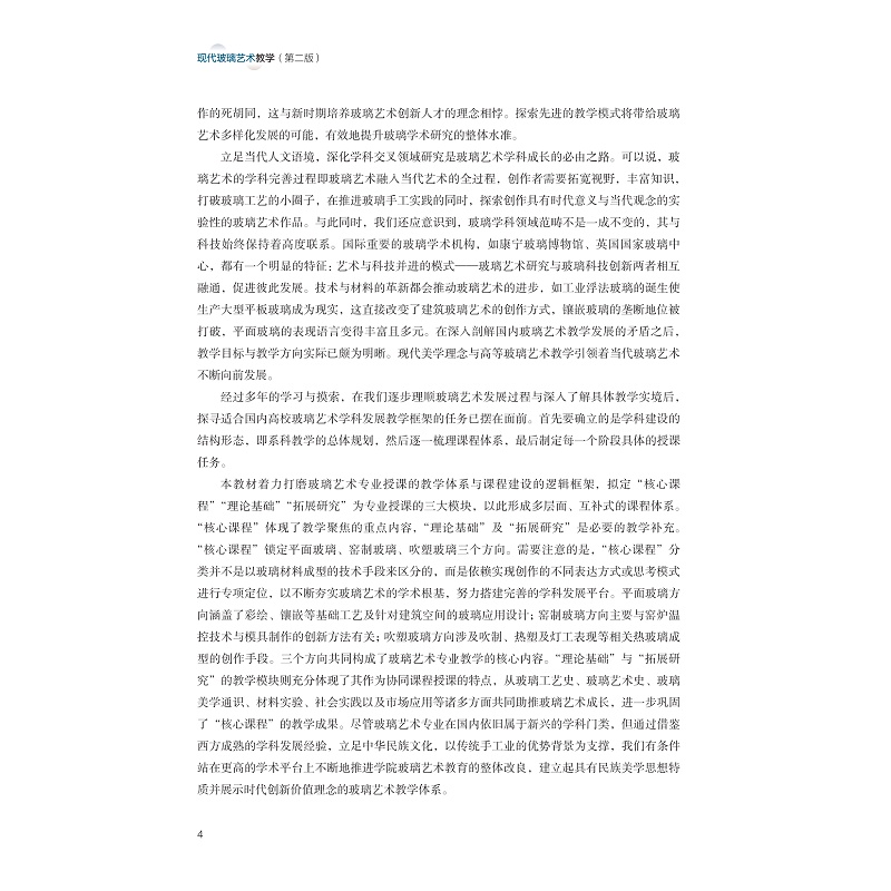 《现代玻璃艺术教学(第二版)》对已出版的《现代玻璃艺术教学》进行了全面改版。新版教材聚焦“手作”本体,强化“观念”指向,从“上手实践”和“方法梳理”两个维度来构建玻璃工作室教学链状课程模块。教材偏重教学思想体系的梳理和应用实践能力的拓展,即在相关基础工艺训练中,重视手工劳作体验的“智慧”因素,以逻辑思维范式来规范实践操作的流程,提升学生的综合审美能力、分析与解决问题的能力。新版教材进一步完善了玻璃艺术专业教学的课程结构,紧扣平面、窑制、吹塑三大“核心课程”授课内容,结合手工理论的会通学习,探讨“工匠精神”的造物理念,挖掘玻璃艺术的民族语言,向世界推广中国学院玻璃的优秀成果。