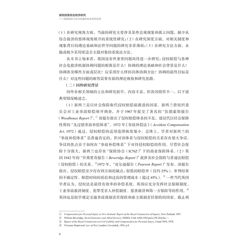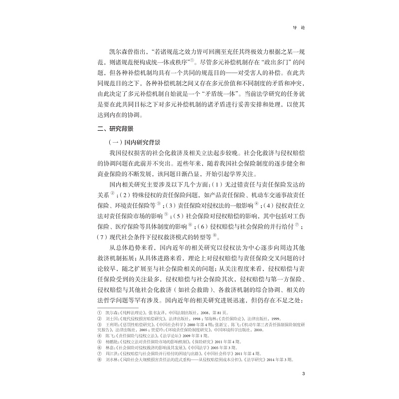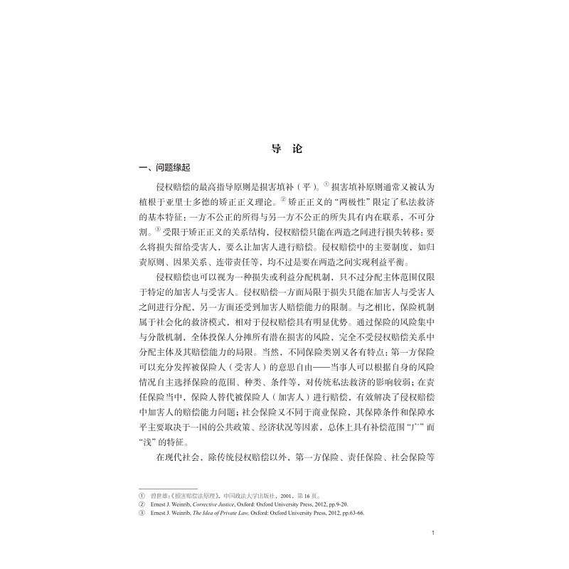 基于系统论的方法,本书拟在分析侵权损害救济演进历史的基础上,对各救济机制的基本功能、补偿机制、补偿项目、追偿关系等方面展开分析,探讨侵权损害综合救济系统内在整合和协调的路径。从单一侵权赔偿到多元补偿机制,再到综合救济系统的内在协调,是法律制度因应社会风险形势变化不断进化的过程。系统性风险,系统性救济。在现代社会风险背景下,对多元补偿机制进行协调使之真正成为以侵权受害人为中心的综合救济系统是侵权损害救济法演进的必然方向。