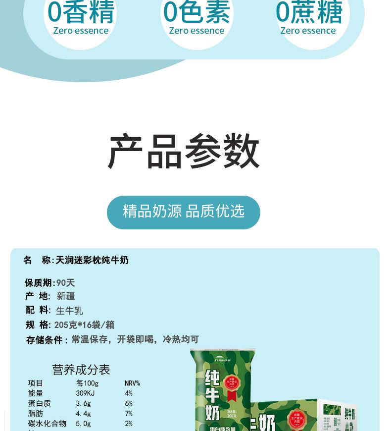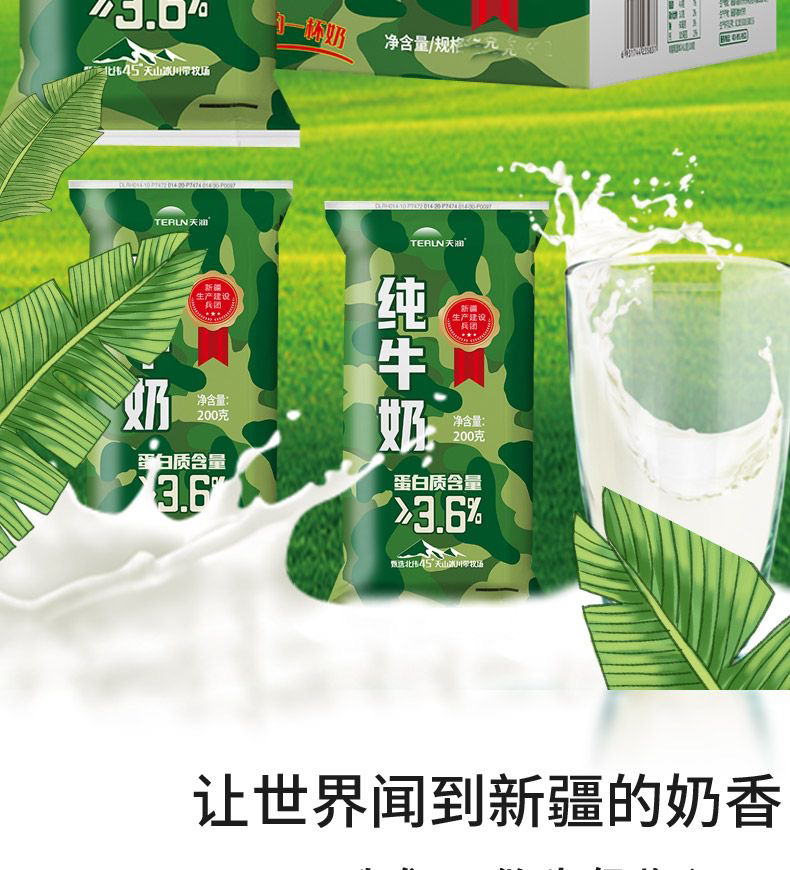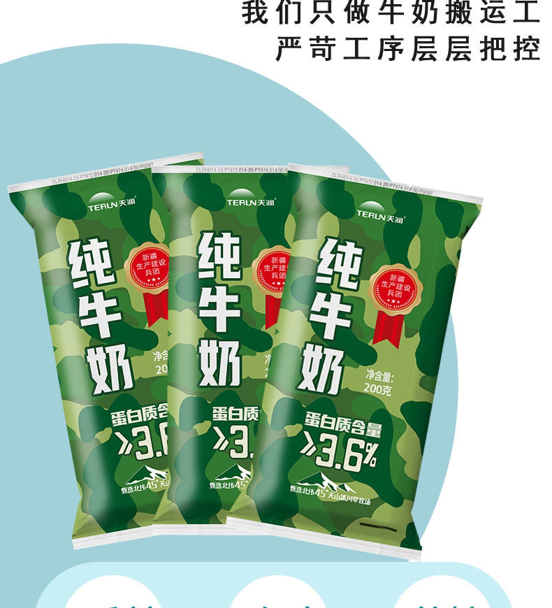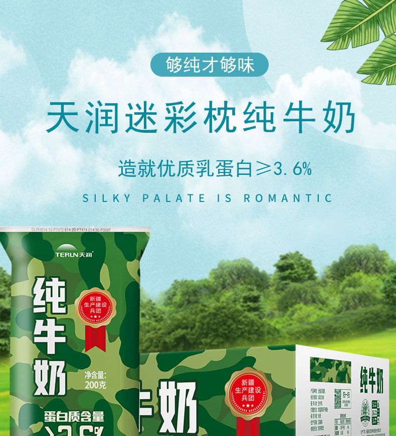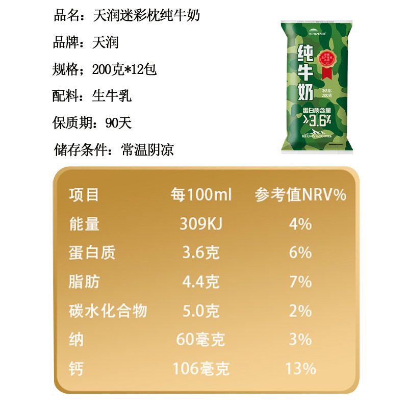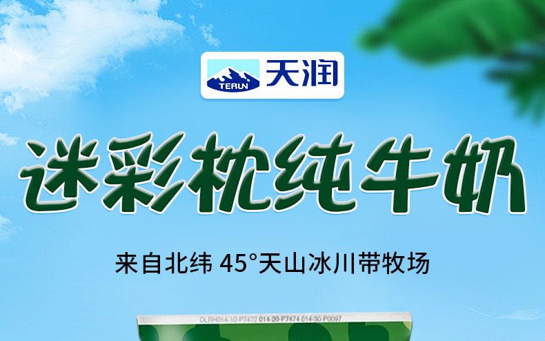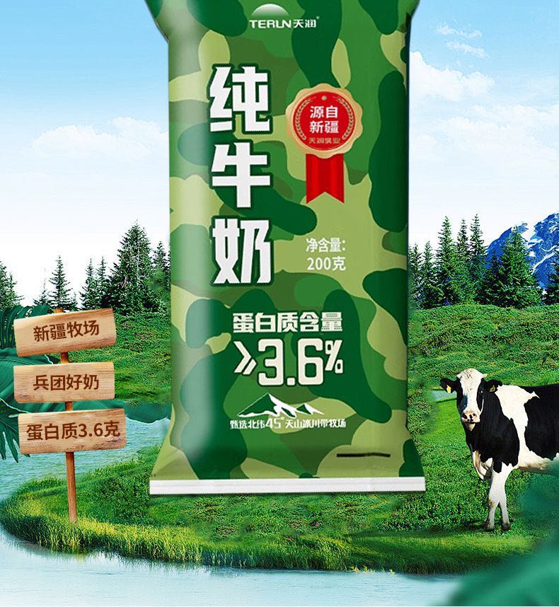 新疆天润迷彩枕全脂纯牛奶生牛乳全脂灭菌乳200ml*12袋装整箱