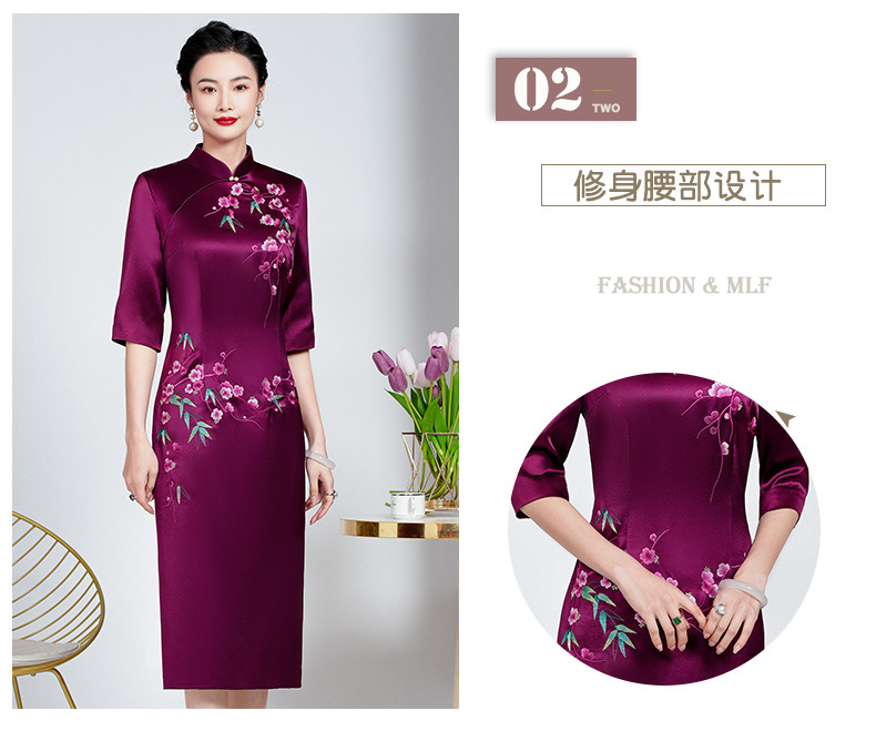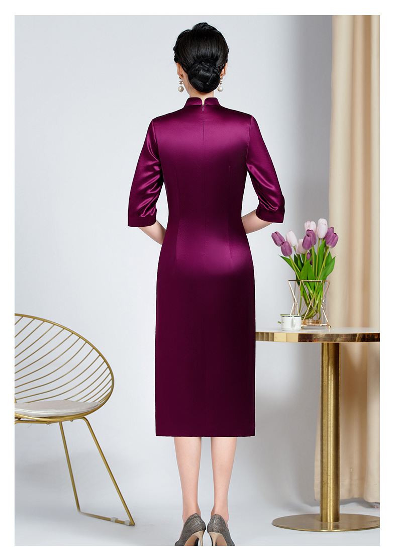 MLY醋酸缎改良妈妈岳母婚宴立领旗袍礼服过膝刺绣气质喜婆婆紫色礼服