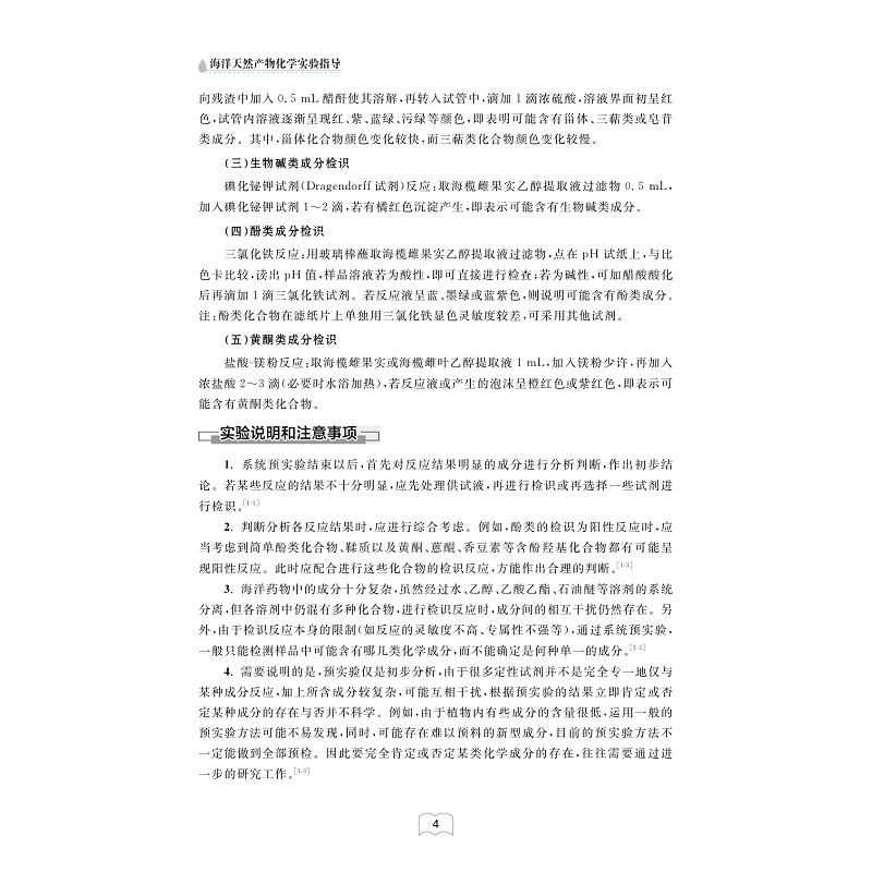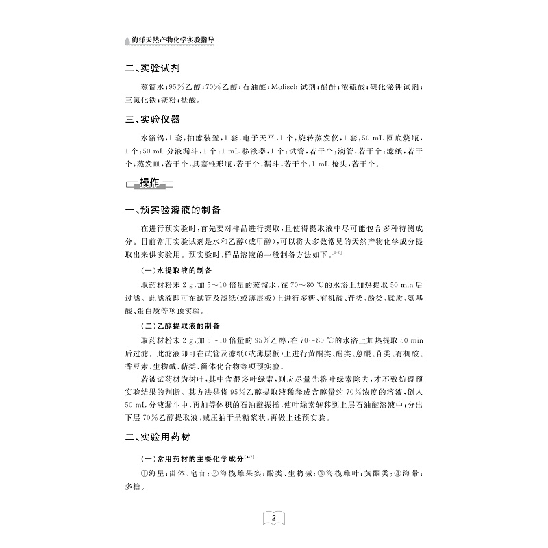 《海洋天然产物化学实验指导》为马忠俊教授主编《海洋天然产物化学》的配套教材,适用于海洋药学、海洋化学、海洋科学等专业的本科生。 实验教学在海洋天然产物化学教学中占据着重要地位。为了配合海洋天然产物化学的理论教学,提高和增强学生的创新能力,动手能力和自学能力,适应开设海洋天然产物化学实验课程和药学相关院校的需求。目前市场上尚未有其相关海洋天然产物化学实验课程。本书将在总结相关开设院校实验的基础上,统一编写,为海洋天然产物化学提供第一本配套实验教材。