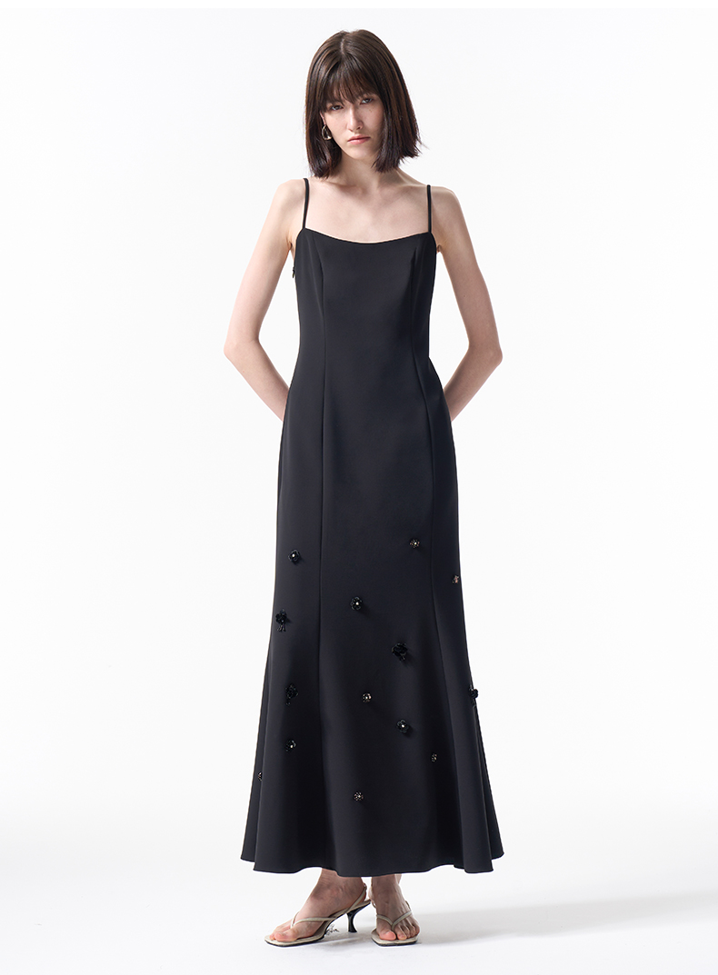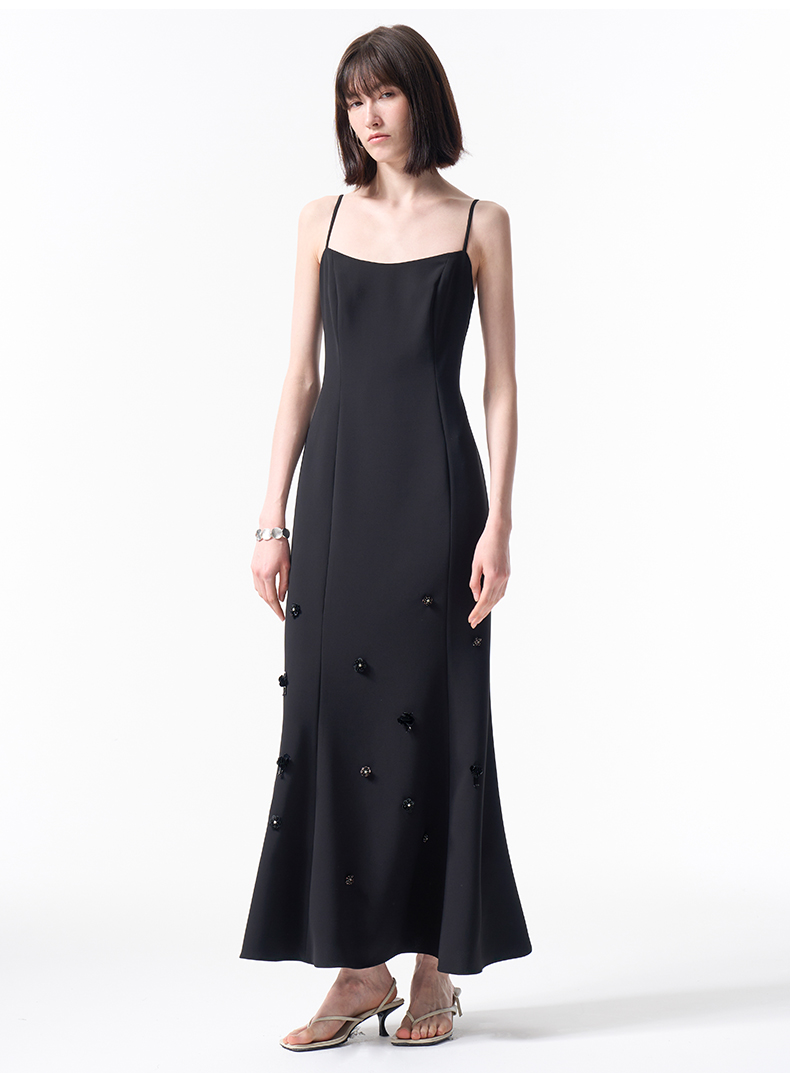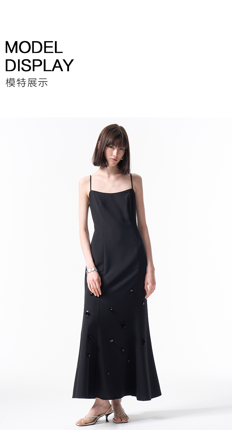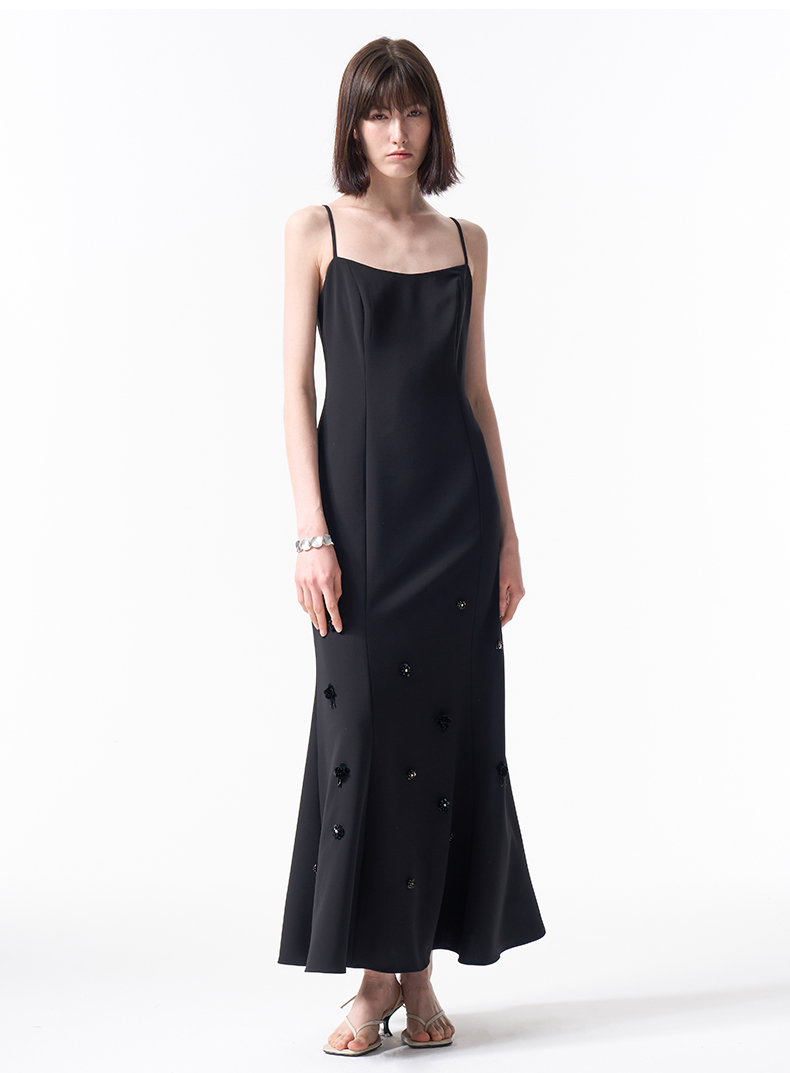 VIMAGE纬漫纪气质小黑裙收腰显瘦优雅钉珠立体花鱼尾裙摆吊带连衣裙2026春季新款V2507204