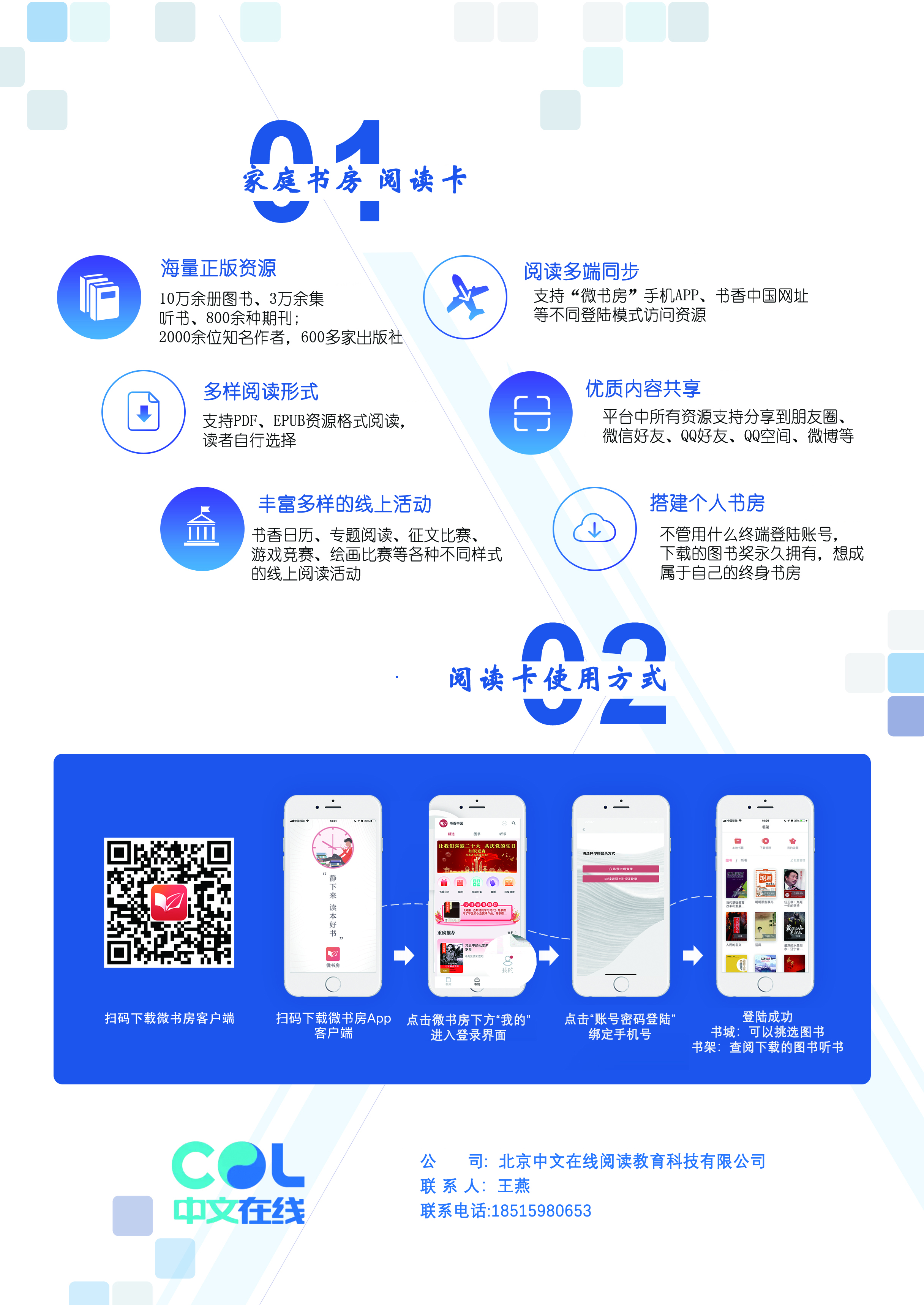 使用卡片上的账号及密码,登陆中文在线“书香中国”阅读平台或微书房APP ,即可享受:
