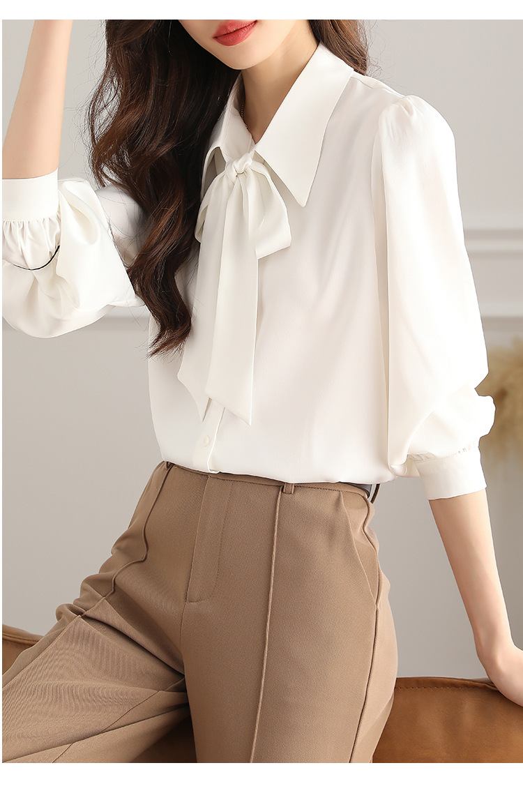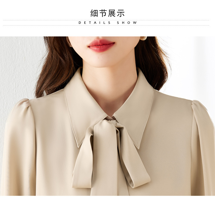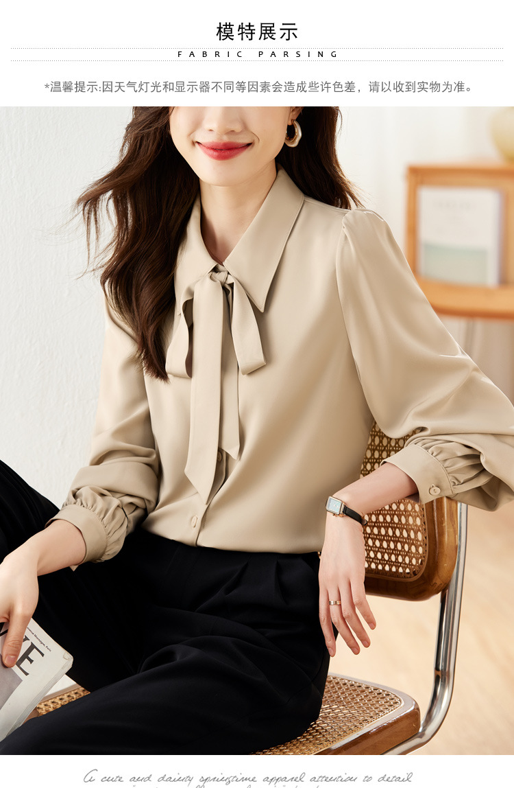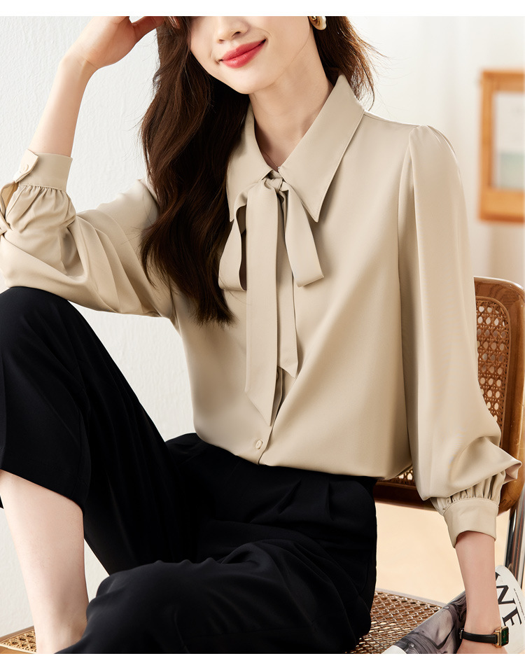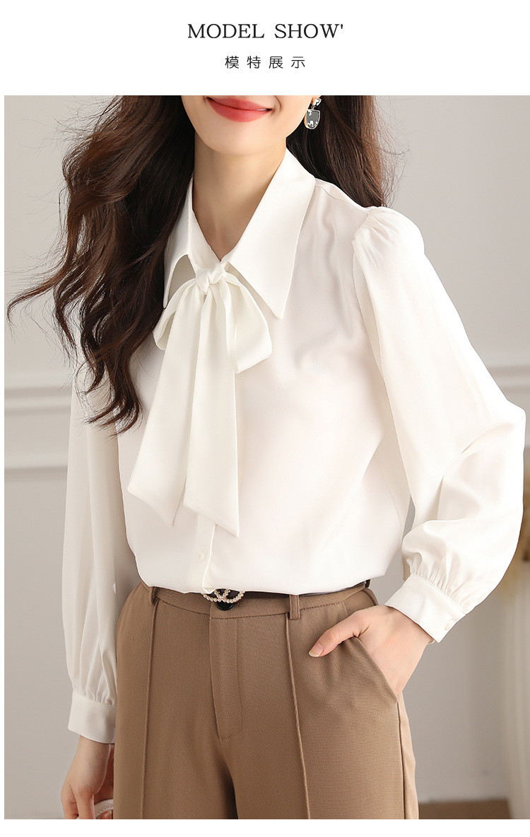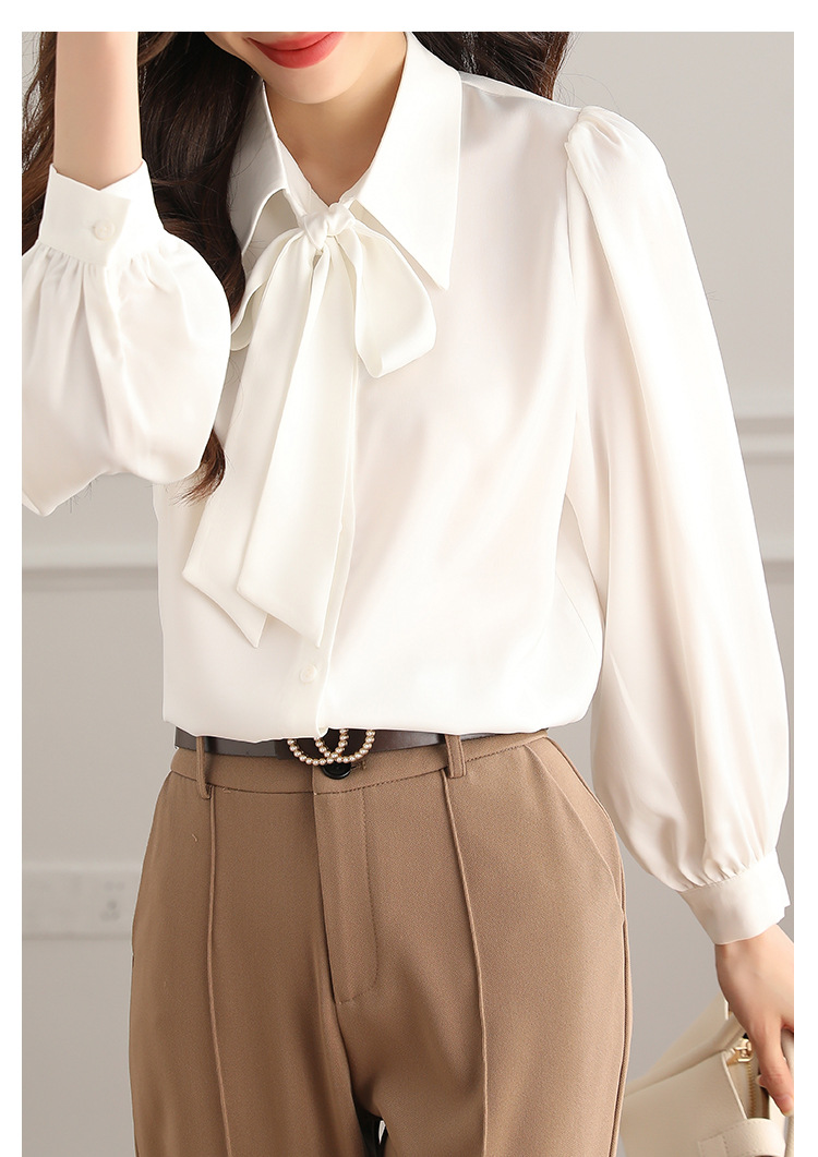 KQL645T8389 灯笼袖春夏新款蝴蝶结衬衫白色内搭衬衣女正装系带设计感职业上衣