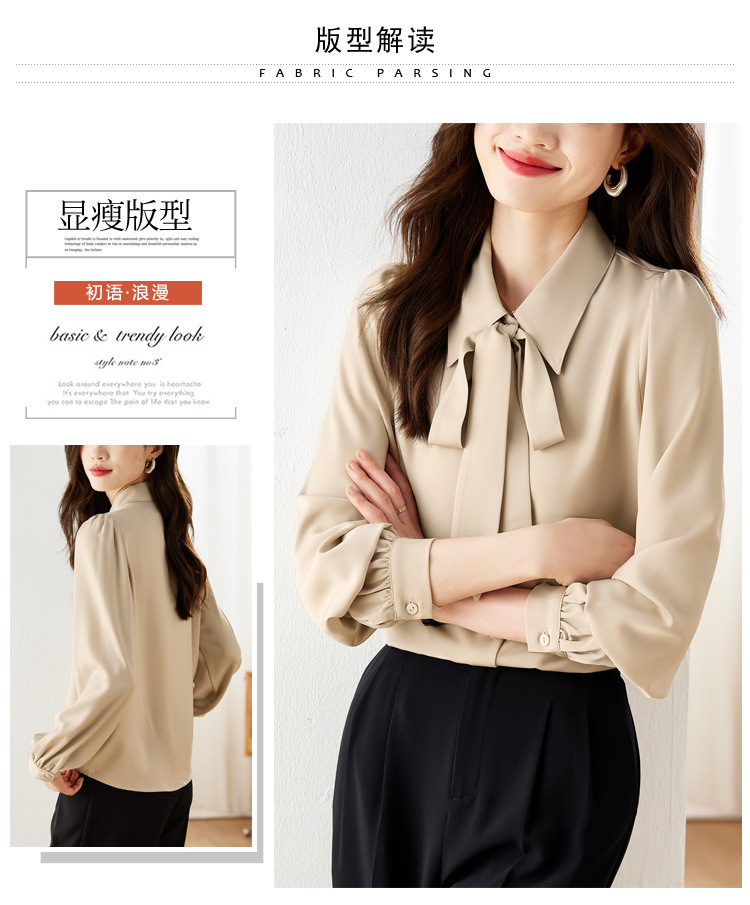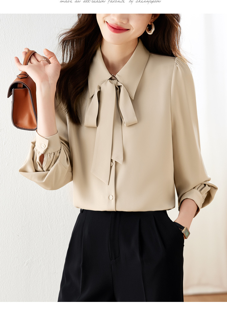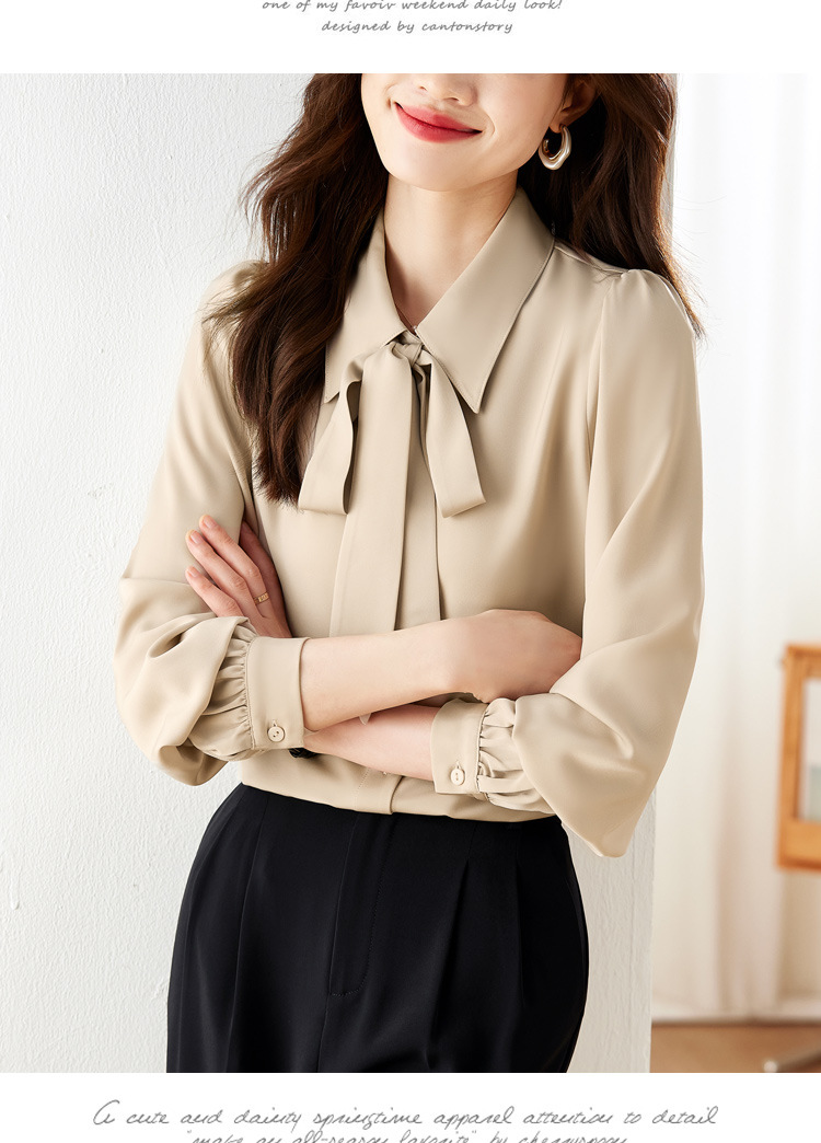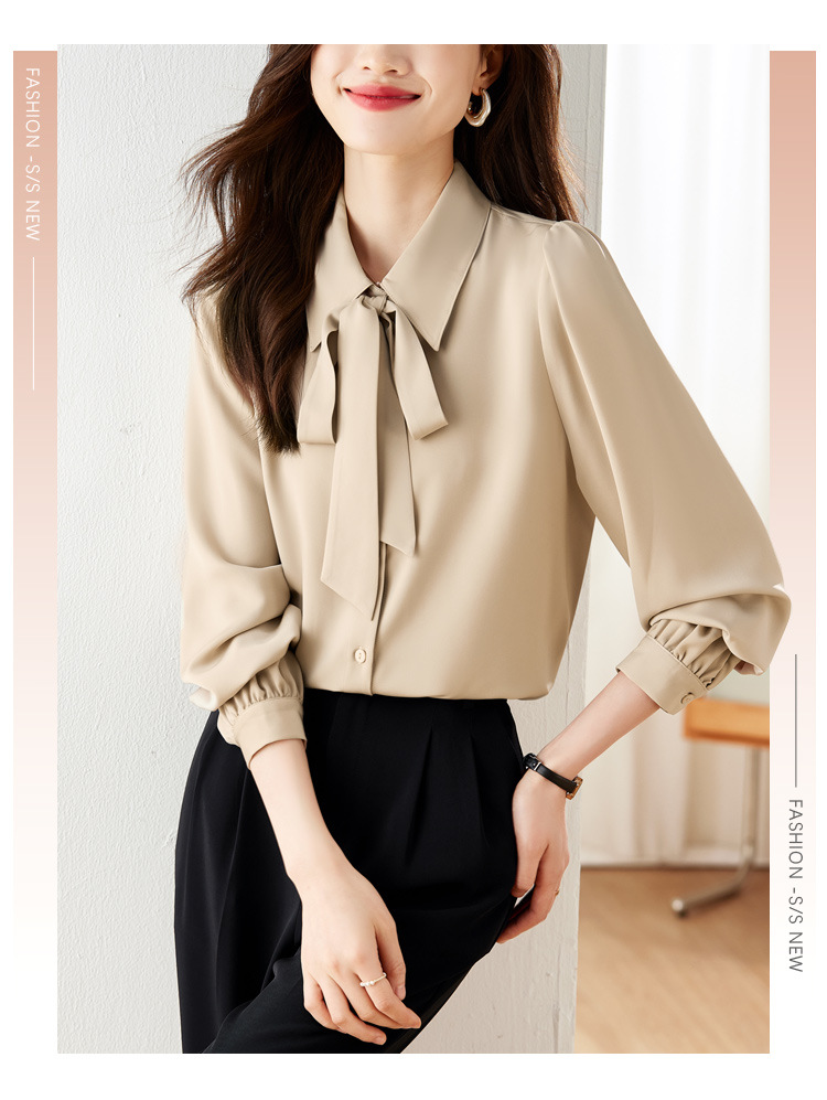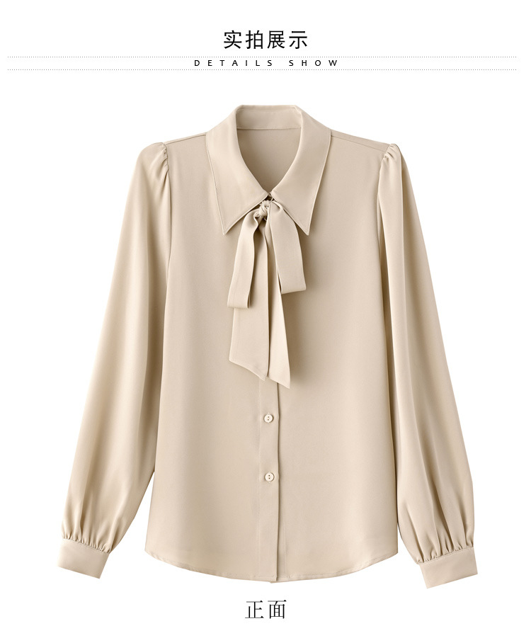 KQL645T8389 灯笼袖春夏新款蝴蝶结衬衫白色内搭衬衣女正装系带设计感职业上衣