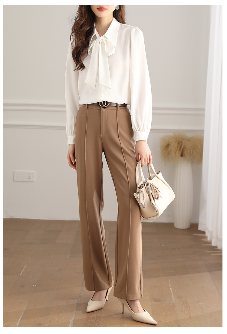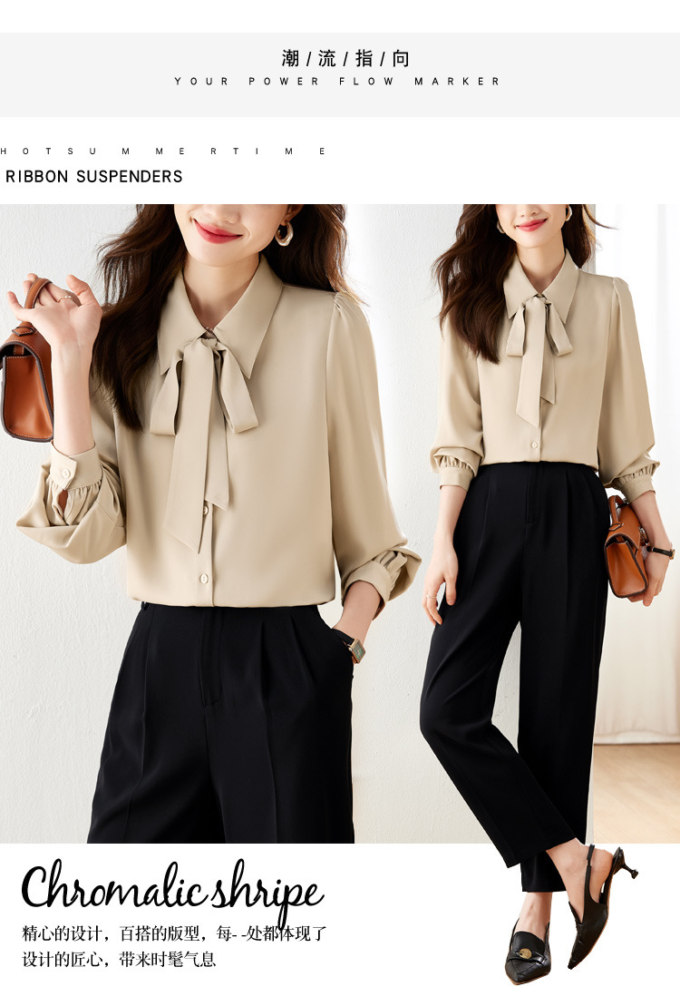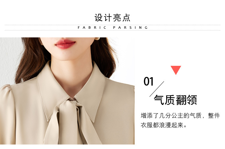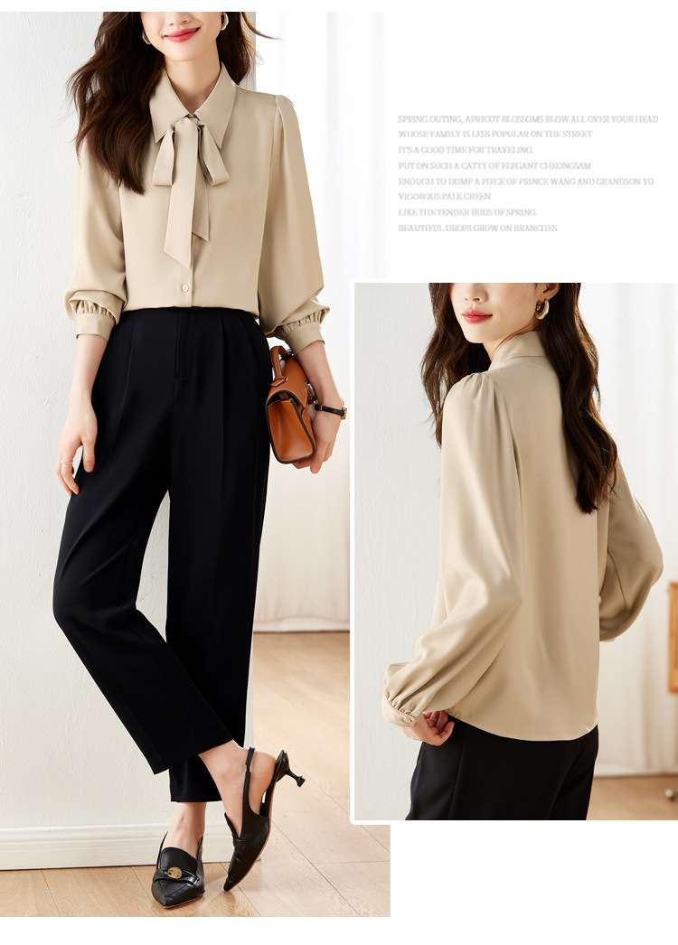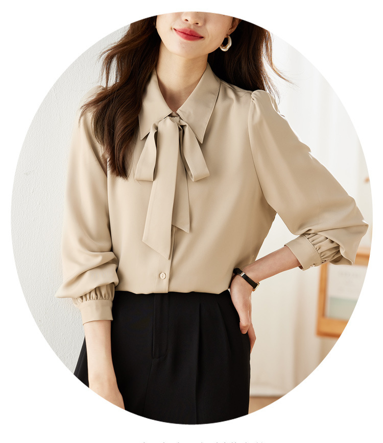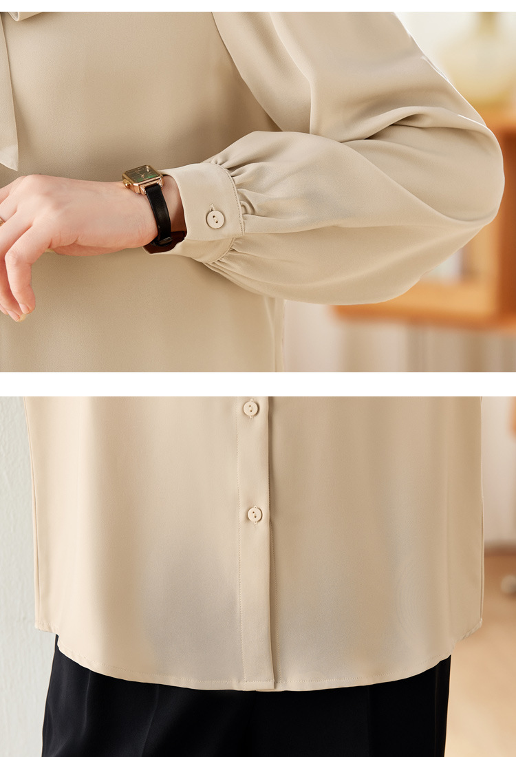 KQL645T8389 灯笼袖春夏新款蝴蝶结衬衫白色内搭衬衣女正装系带设计感职业上衣