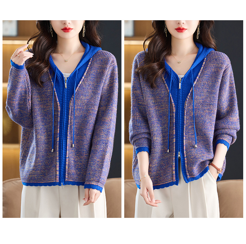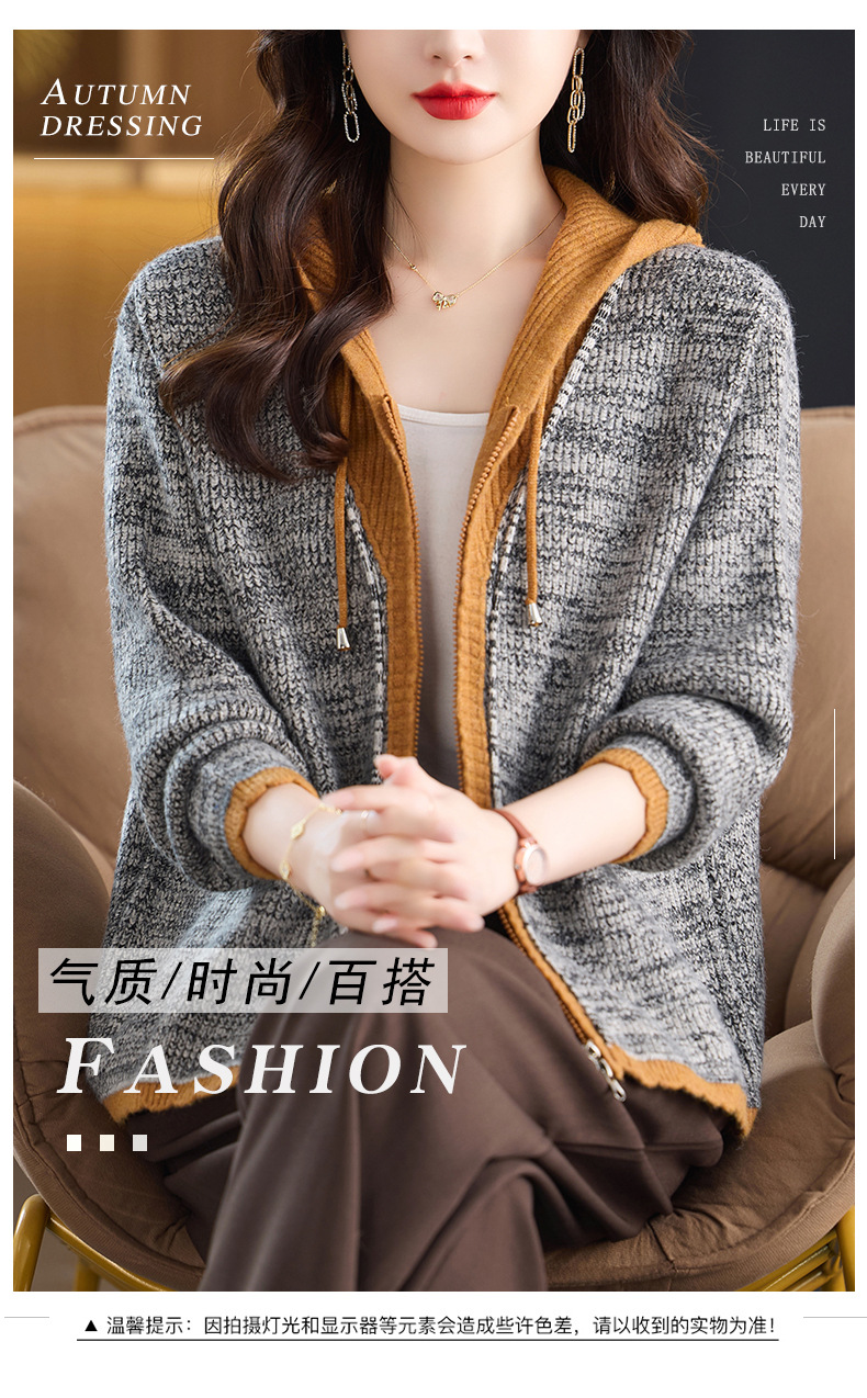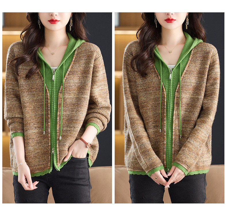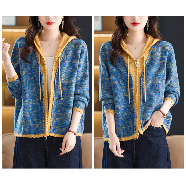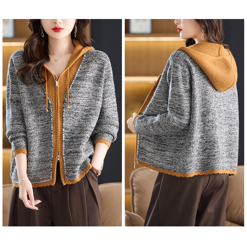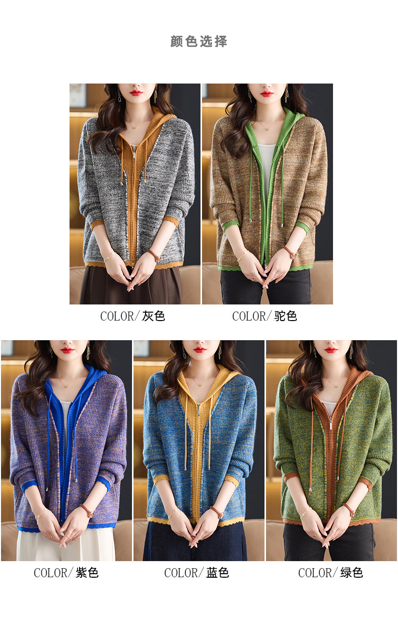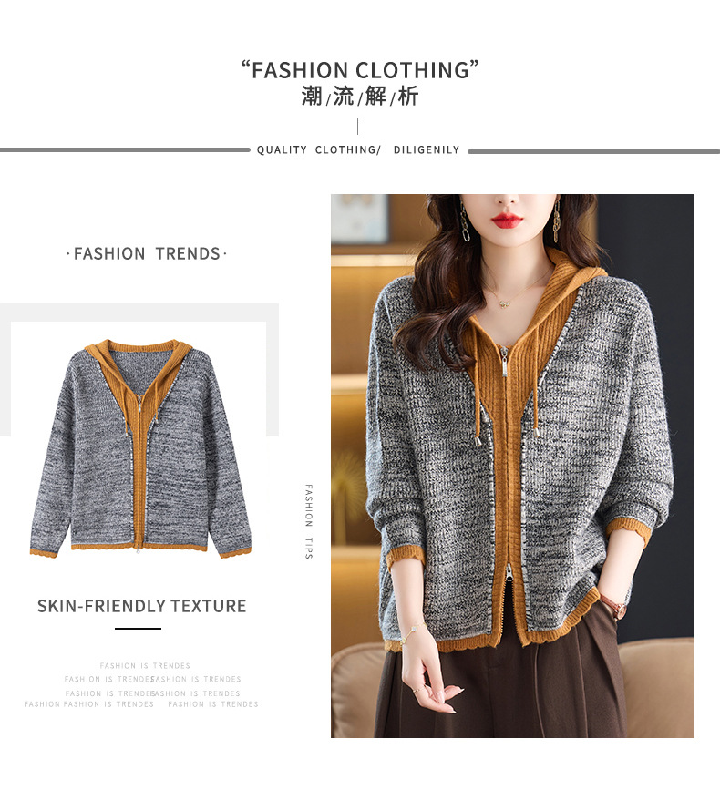 CC假两件连帽针织开衫外套女2025春秋新款时尚撞色卫衣休闲短款毛衣
