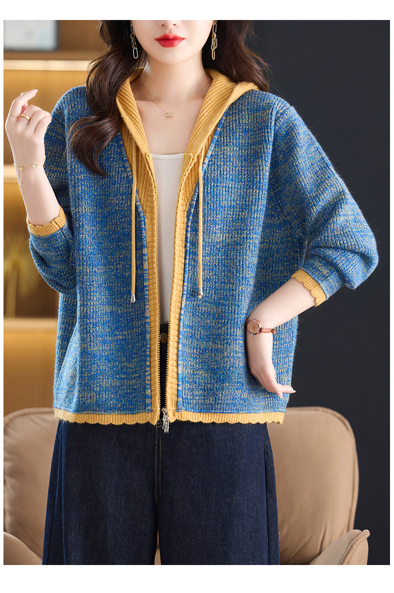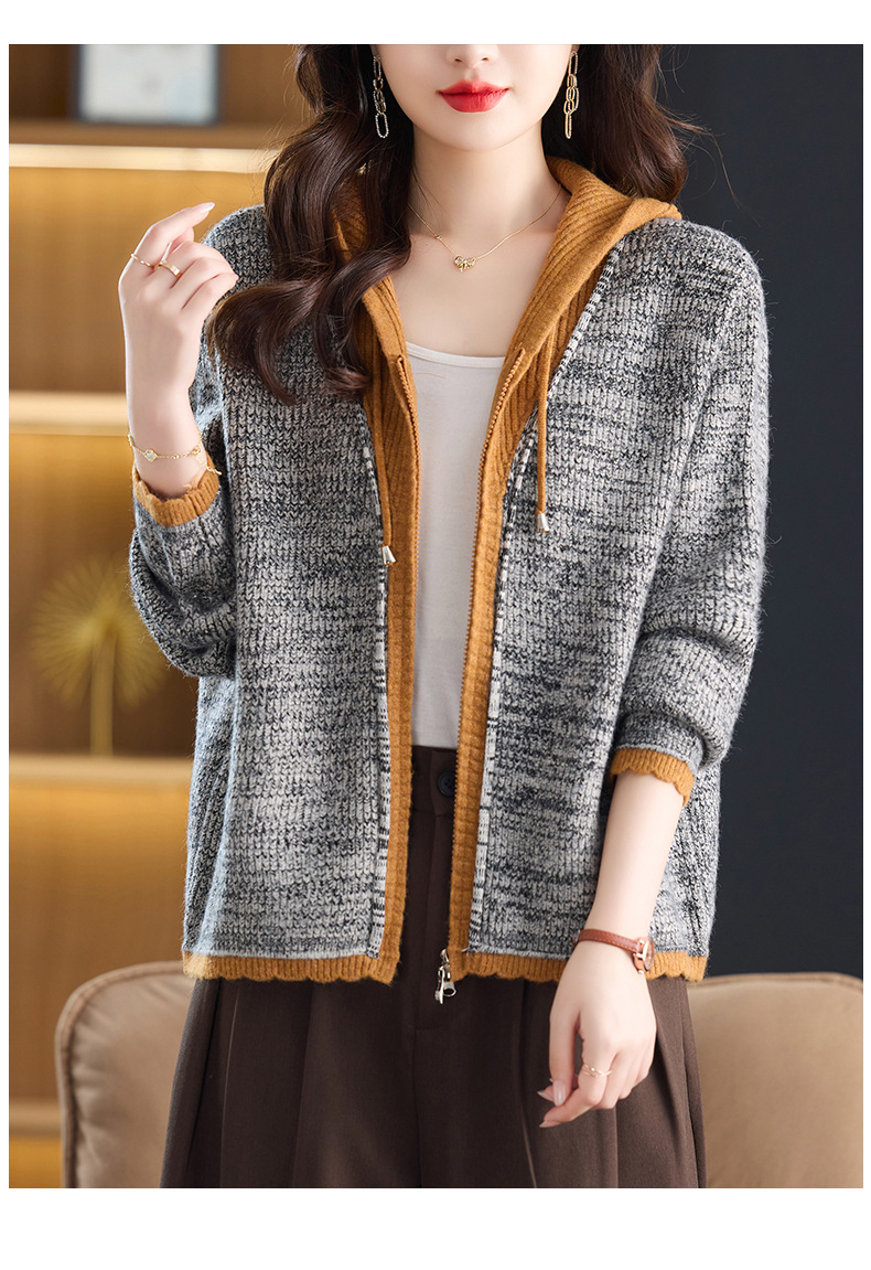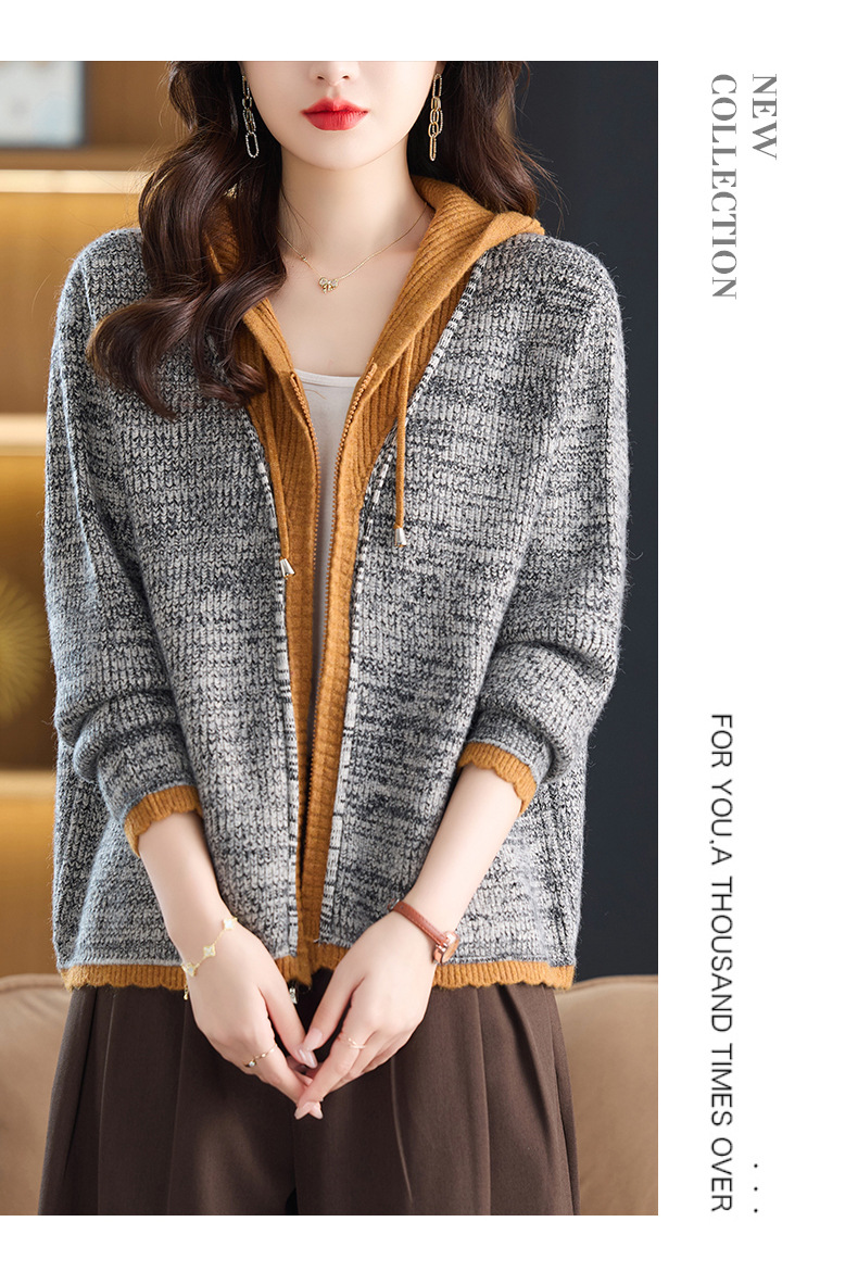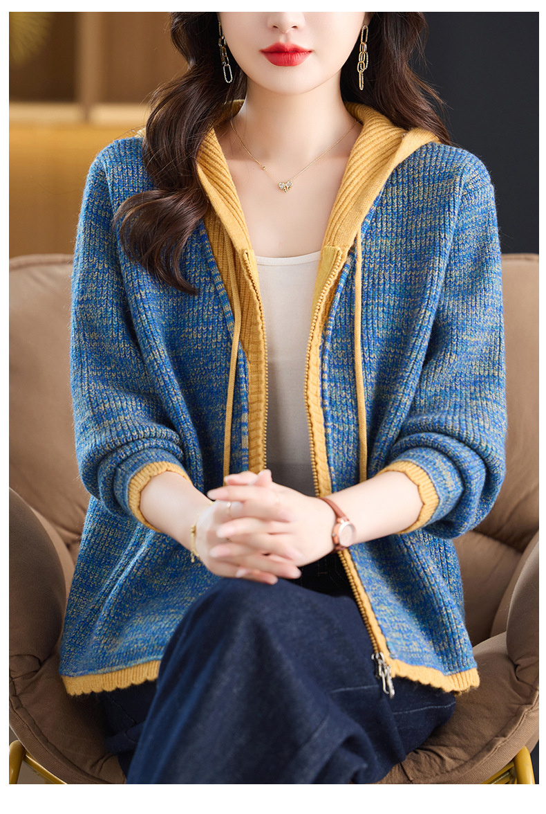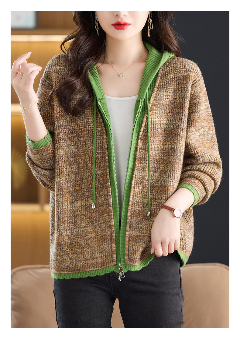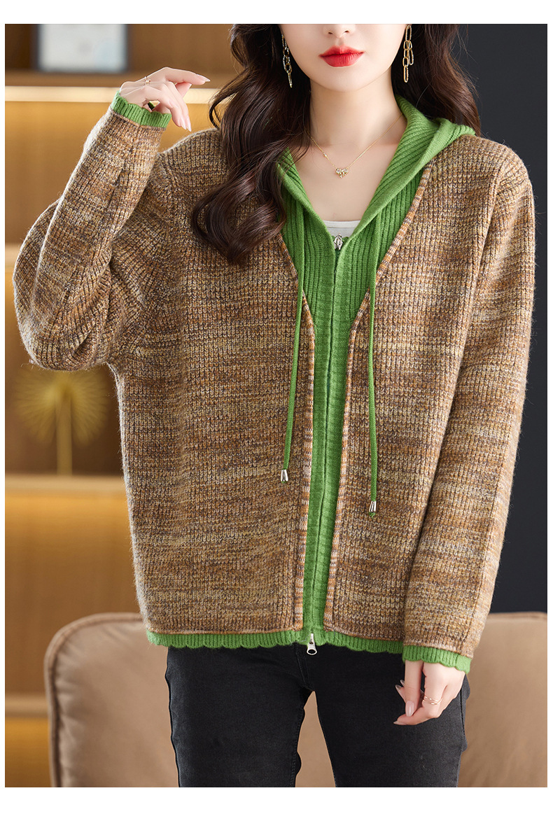 CC假两件连帽针织开衫外套女2025春秋新款时尚撞色卫衣休闲短款毛衣