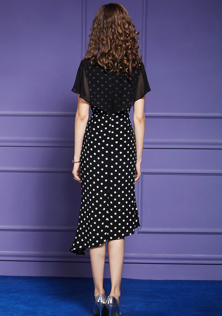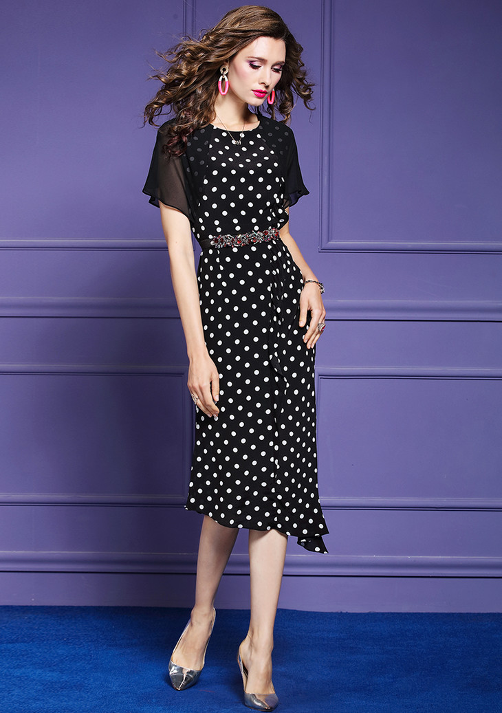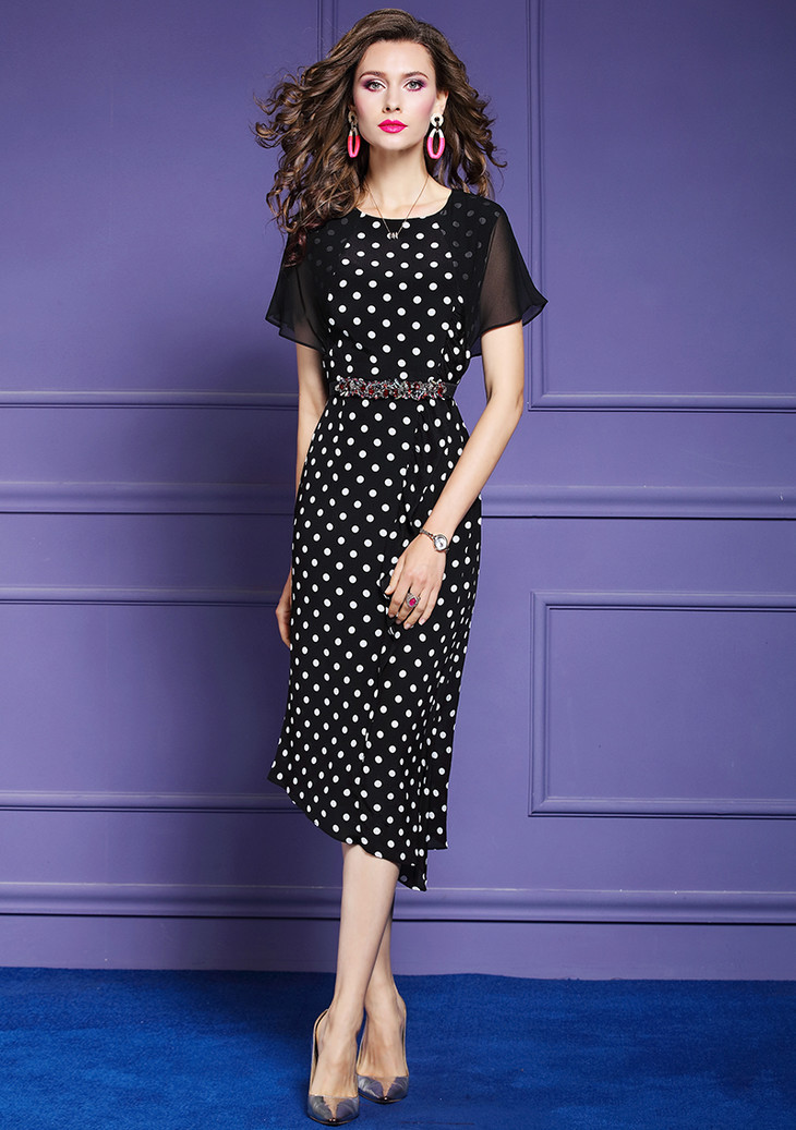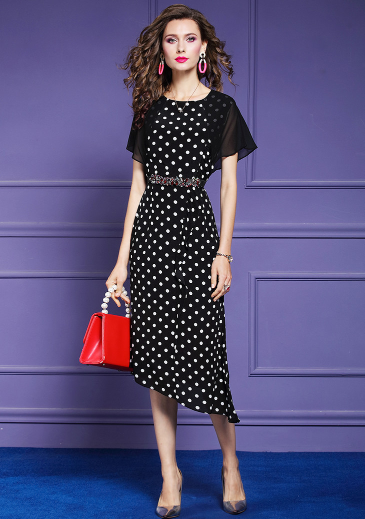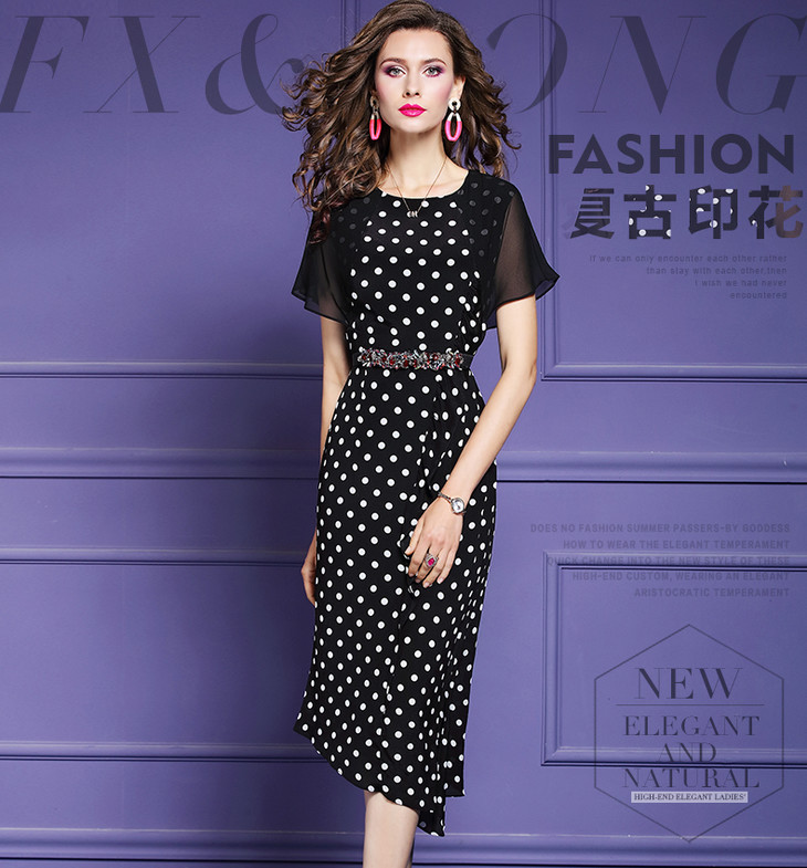 FMY-F20XL30728夏装新款气质显瘦修身拼接不规则波点雪纺连衣裙