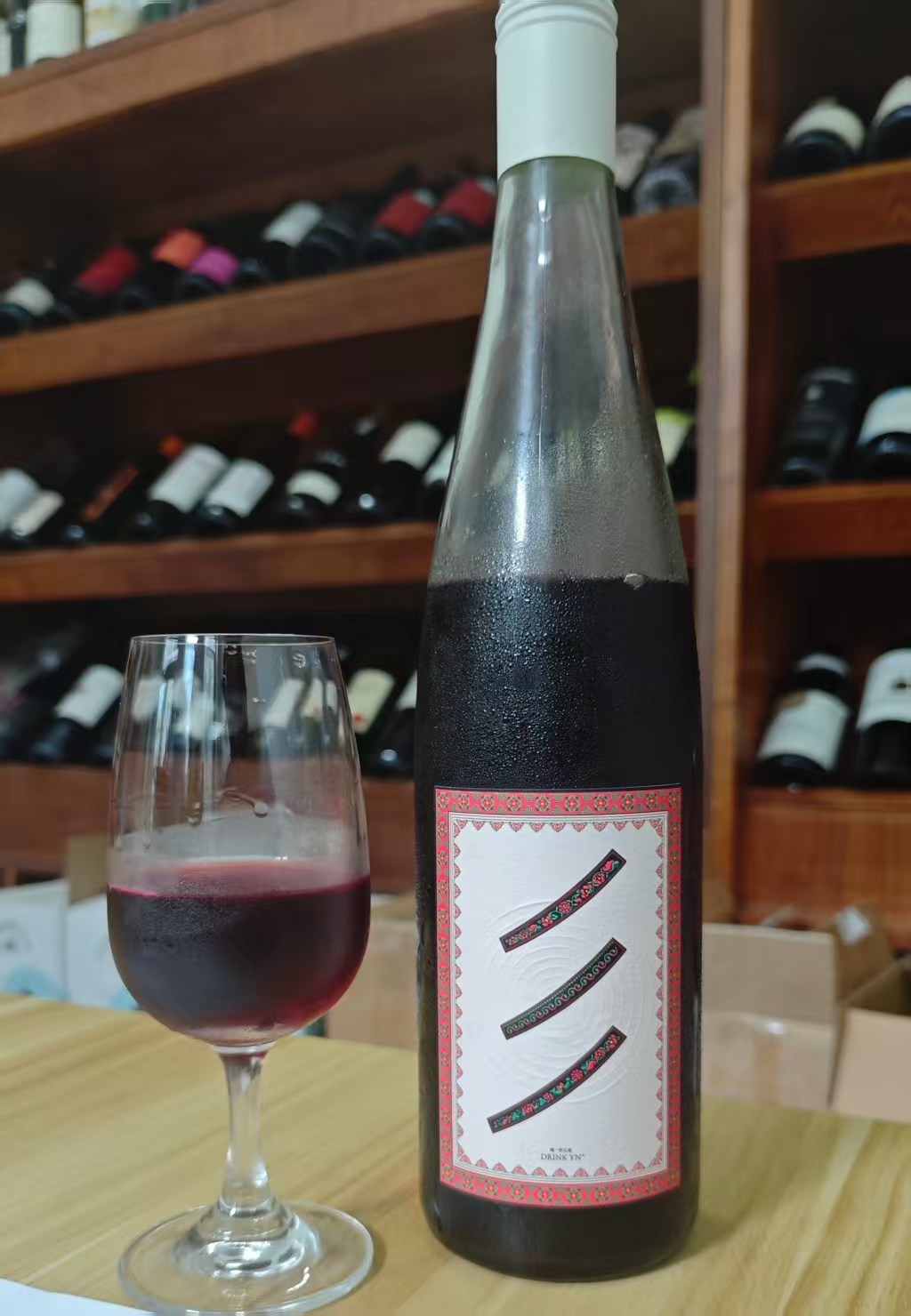 这是一瓶极其附有云南特色的酒款,是一款采用墨红玫瑰鲜花和云南特有的玫瑰蜜葡萄一起来酿造的鲜花加香甜红葡萄酒。