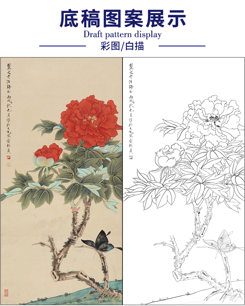 俞致贞花鸟牡丹工笔画白描底稿《牡丹飞蝶》临摹勾线高清打印稿ZZ42