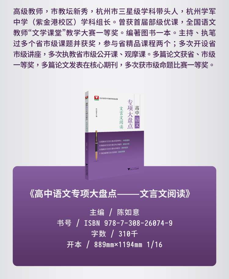 陈如意,高级教师,市教坛新秀,省网络名师工作室学科带头人,现任职于杭州学军中学。曾获教育部“优课”、全国语文教师“文学课堂”教学大赛一等奖;多次开设省市级讲座,多次执教省市级公开课、观摩课。多篇论文获省、市级一等奖,多篇论文发表在核心期刊,出版编著一本。主持、执笔过多个省市级课题并获奖,参与省精品课程两门,自主研发过选修课程;命题多次获得市级一等奖。