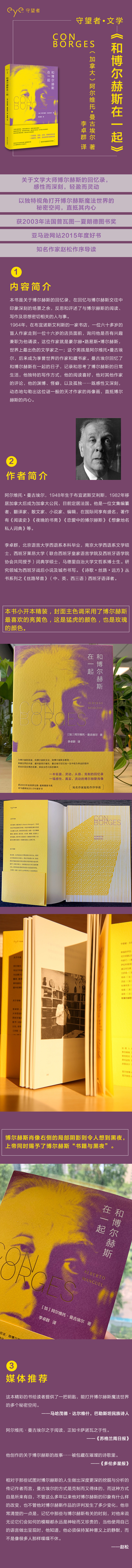 ★在这本薄薄的小册子中,享誉世界的作家、藏书家阿尔维托·曼古埃尔回忆和评述了他一生中最为幸运的陪伴——当他还是个十六岁的少年,他有幸兼职为大文豪博尔赫斯朗读,与他交谈,陪他去影院,因而得以走近这位神秘的天才作家,感受他的日常生活,聆听他的心声,了解与他的阅读、写作相关的人和事。和那些巨鲸般的博尔赫斯传记相比,这部回忆录视角独特,轻盈灵动,从容克制,是我们得以窥见博尔赫斯魔法世界的一个秘密窗口。