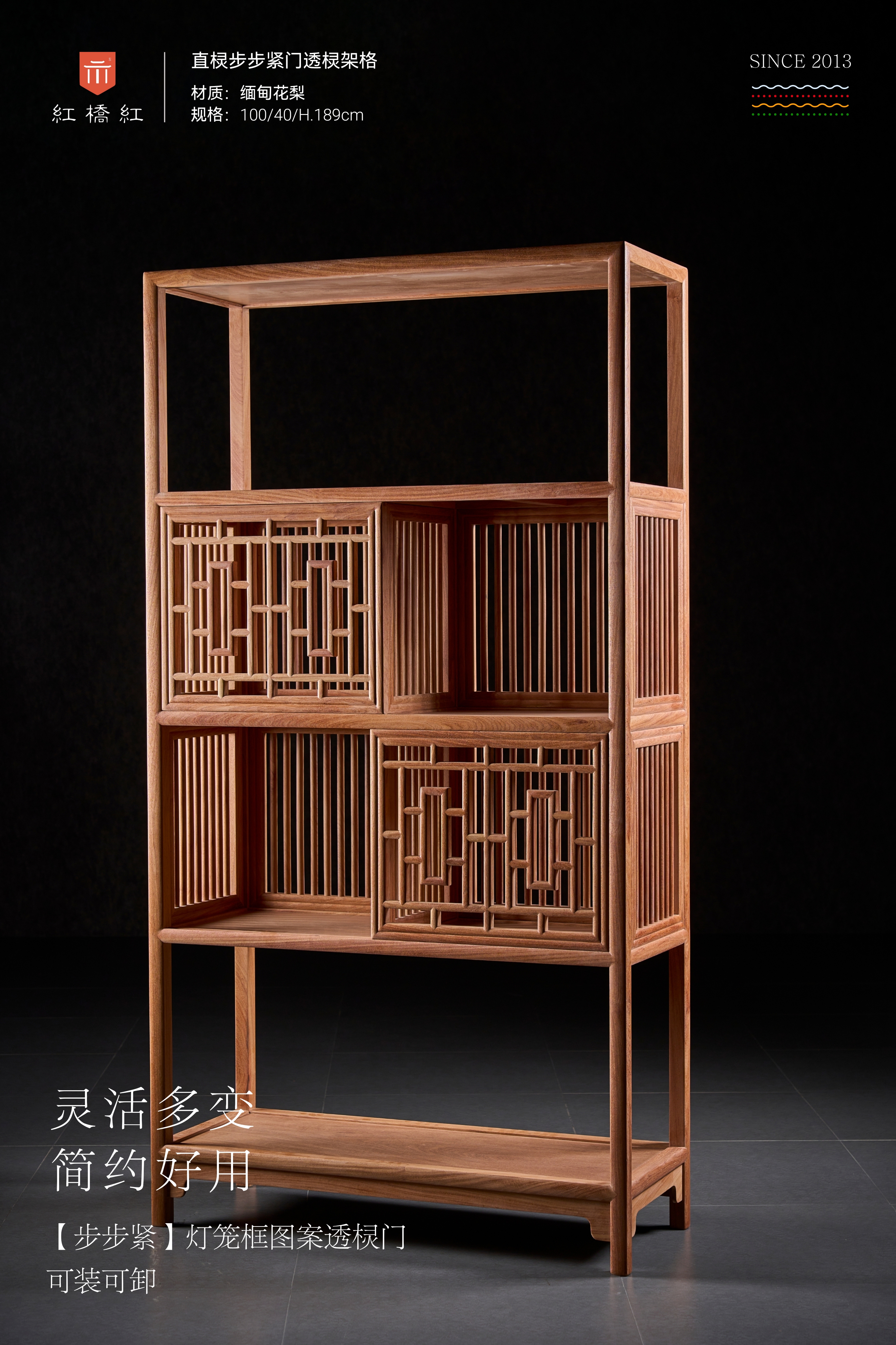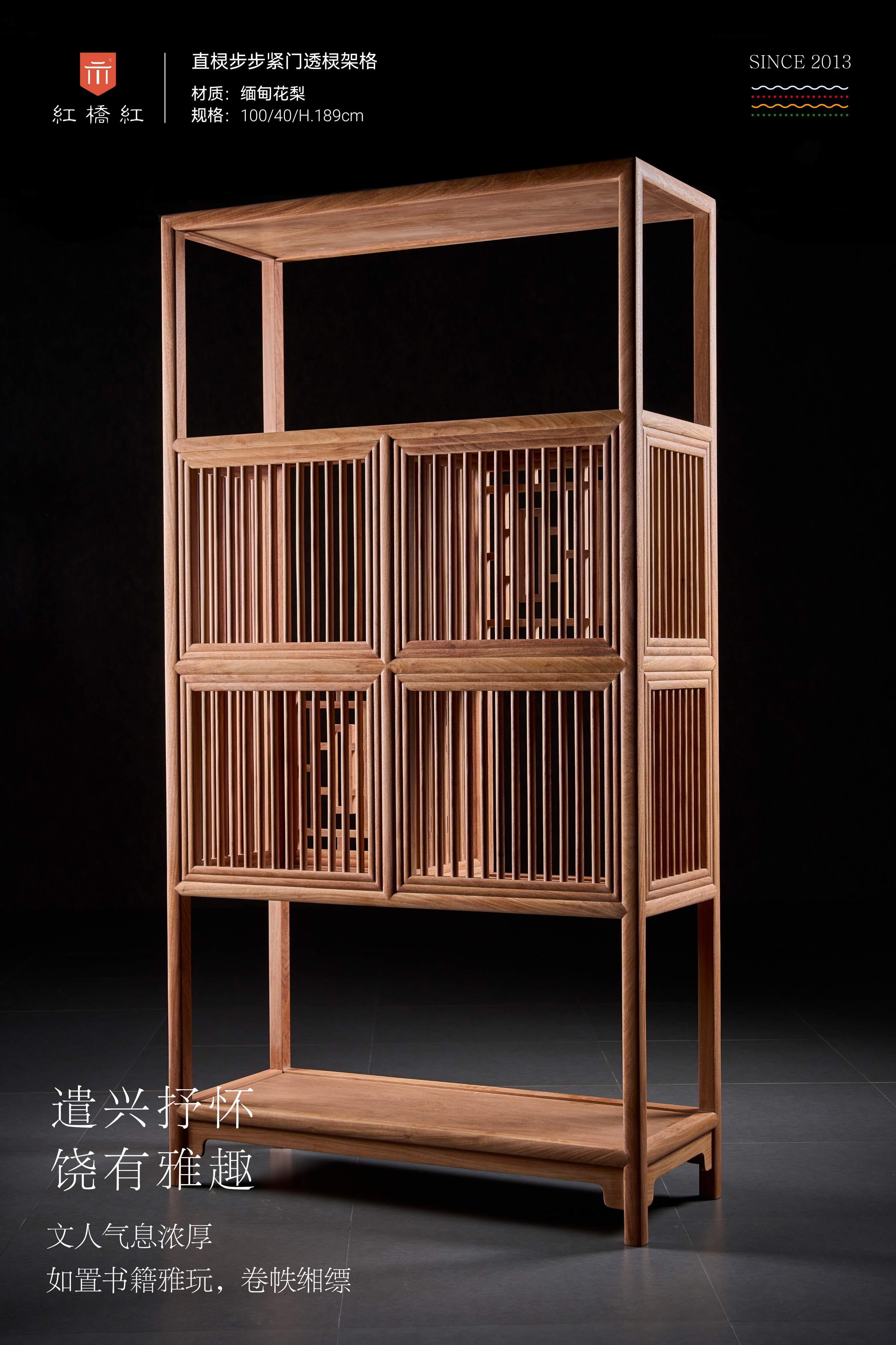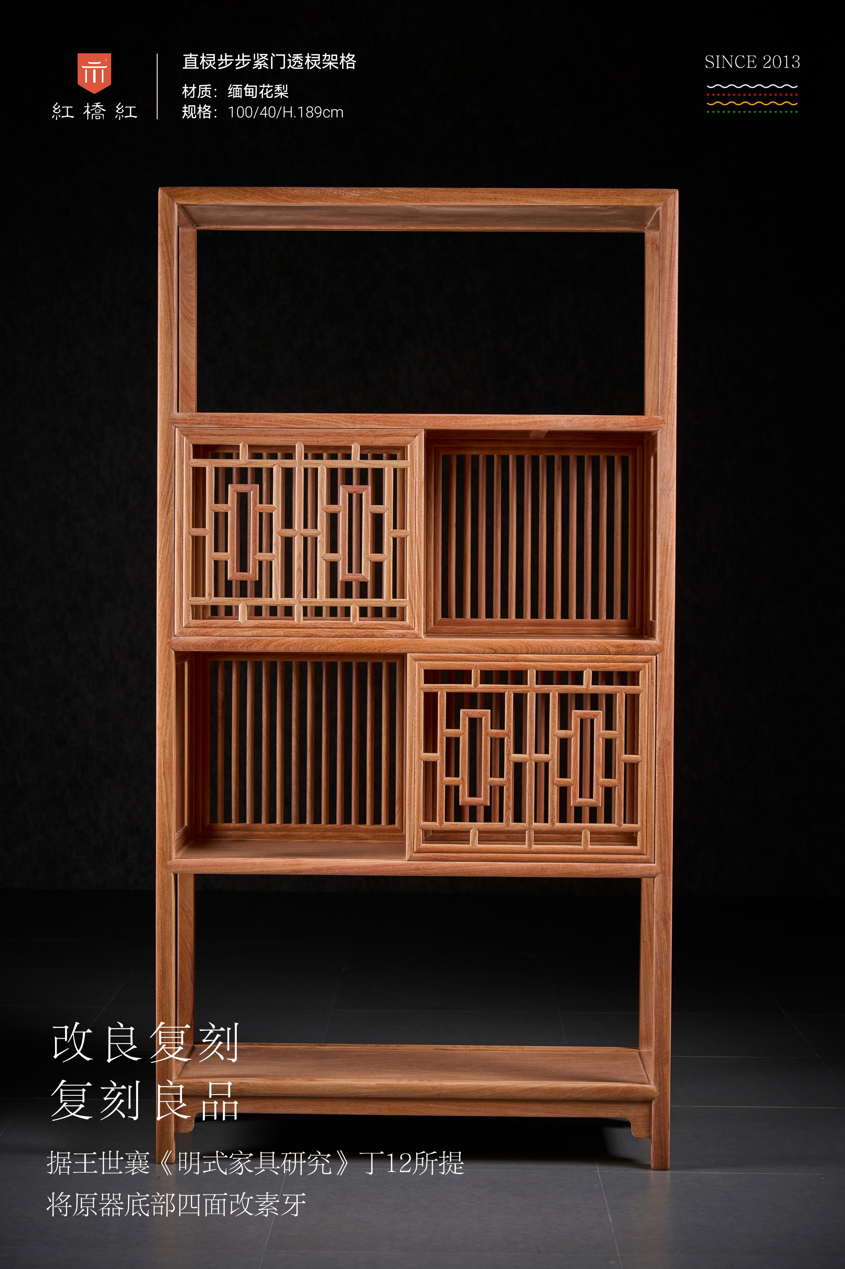 此器原型似例来自《明式家具研究》丁12一件直棂步步紧门透棂架格。改良复刻,据王世襄《明式家具研究》丁12所提:“正面底层使用了两块相当宽的角牙,未能令人惬意。如四面都采用最常见的素牙条和素牙头,效果定会好一些。”红桥红将原器底部四面改素牙款。此器汲取了王老见地,器型更为典雅、轻盈。