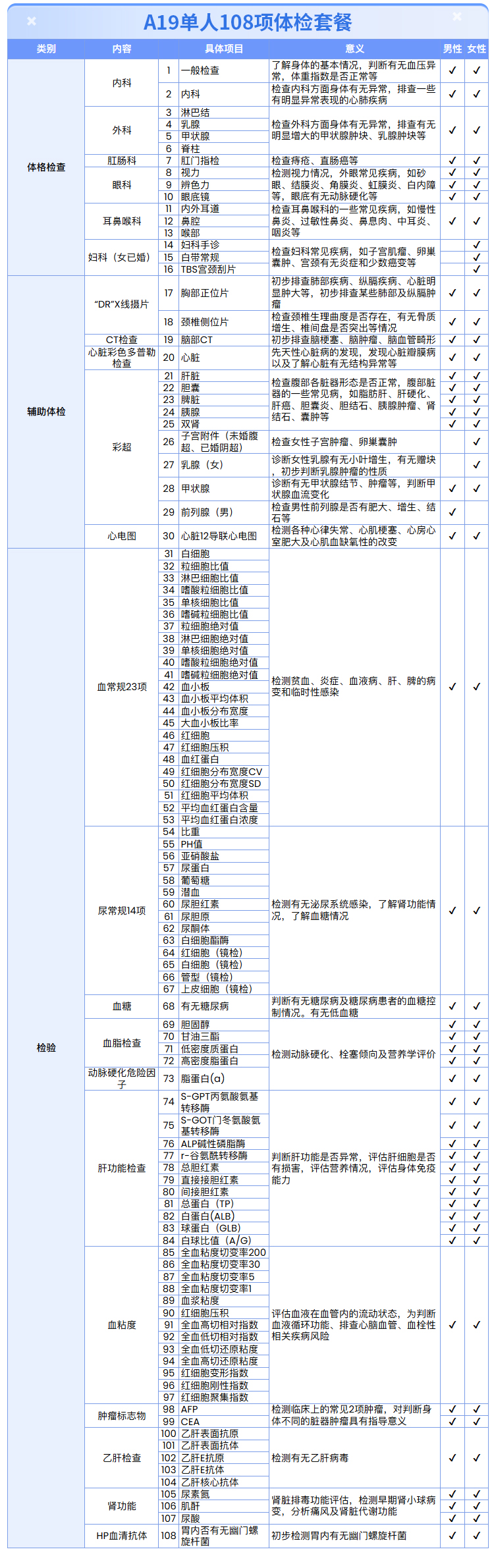【男女通用|优选全面108项】含脑部CT+胸部/颈椎DR+心脏多普勒+七彩超+肝功全套 A19