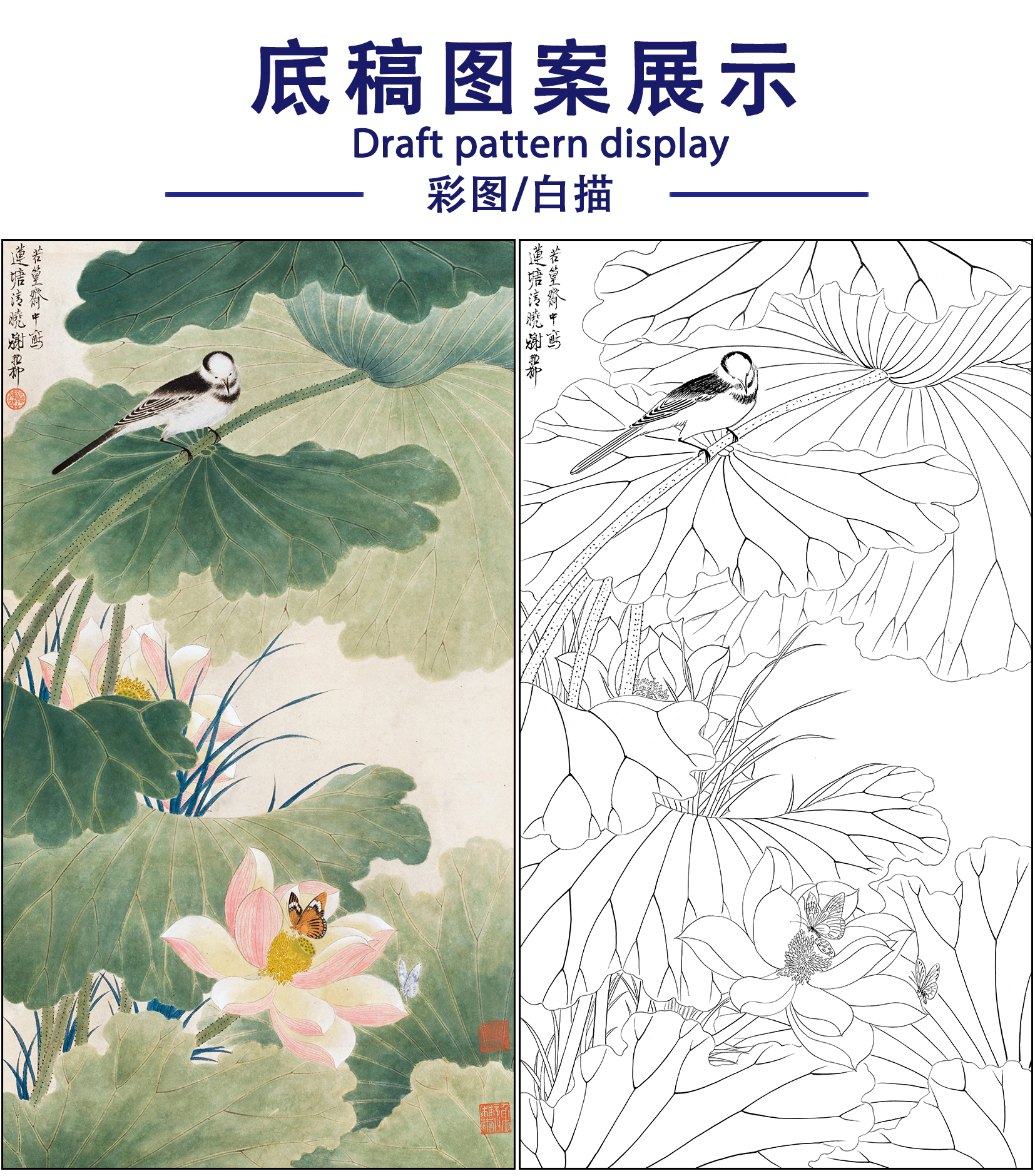谢稚柳花鸟工笔画白描底稿《莲塘清晓》临摹勾线高清打印稿XZ14
