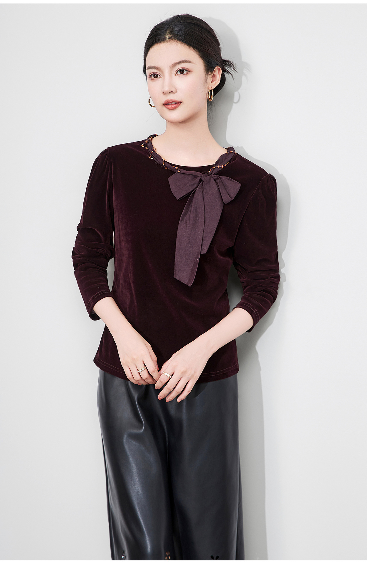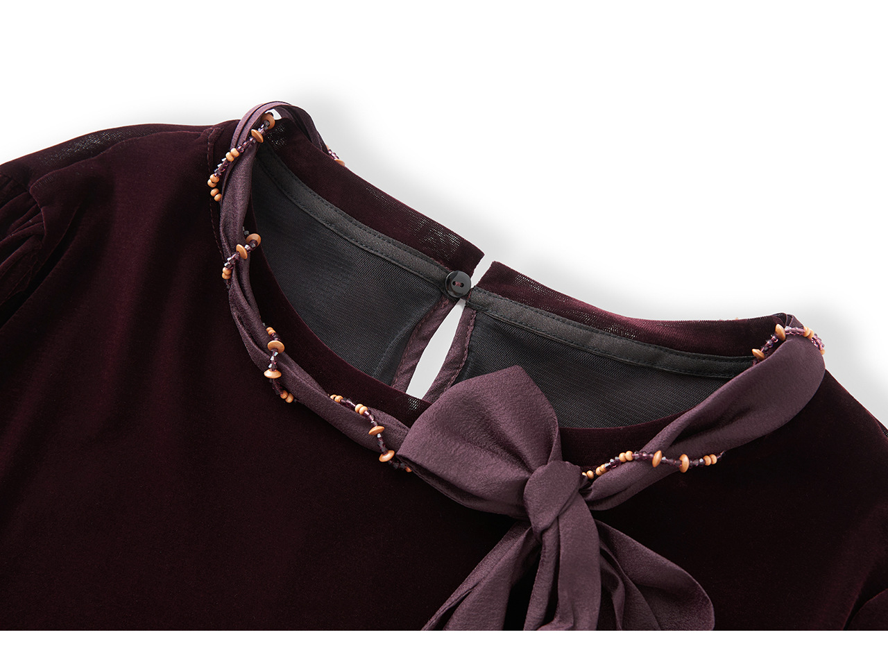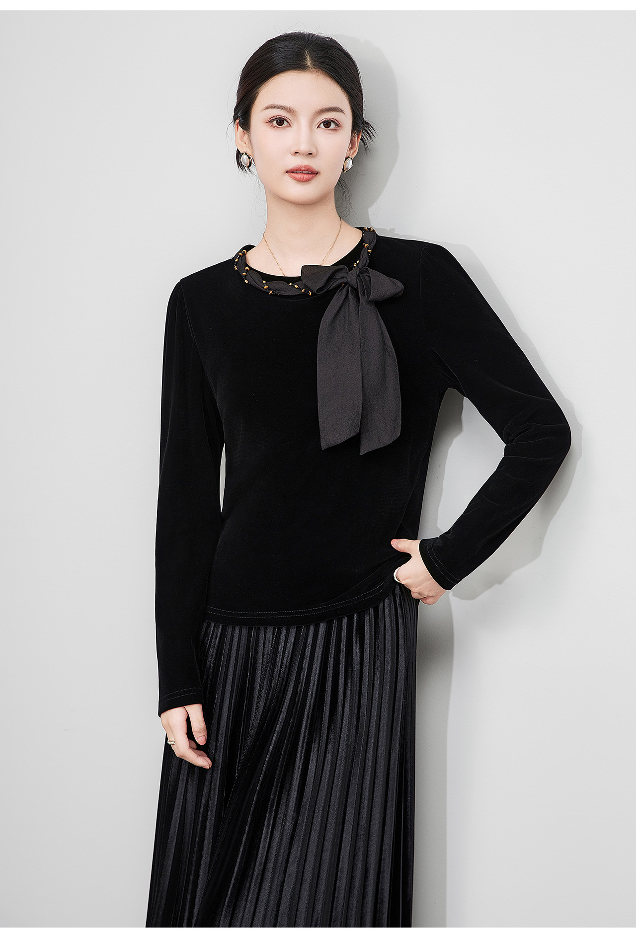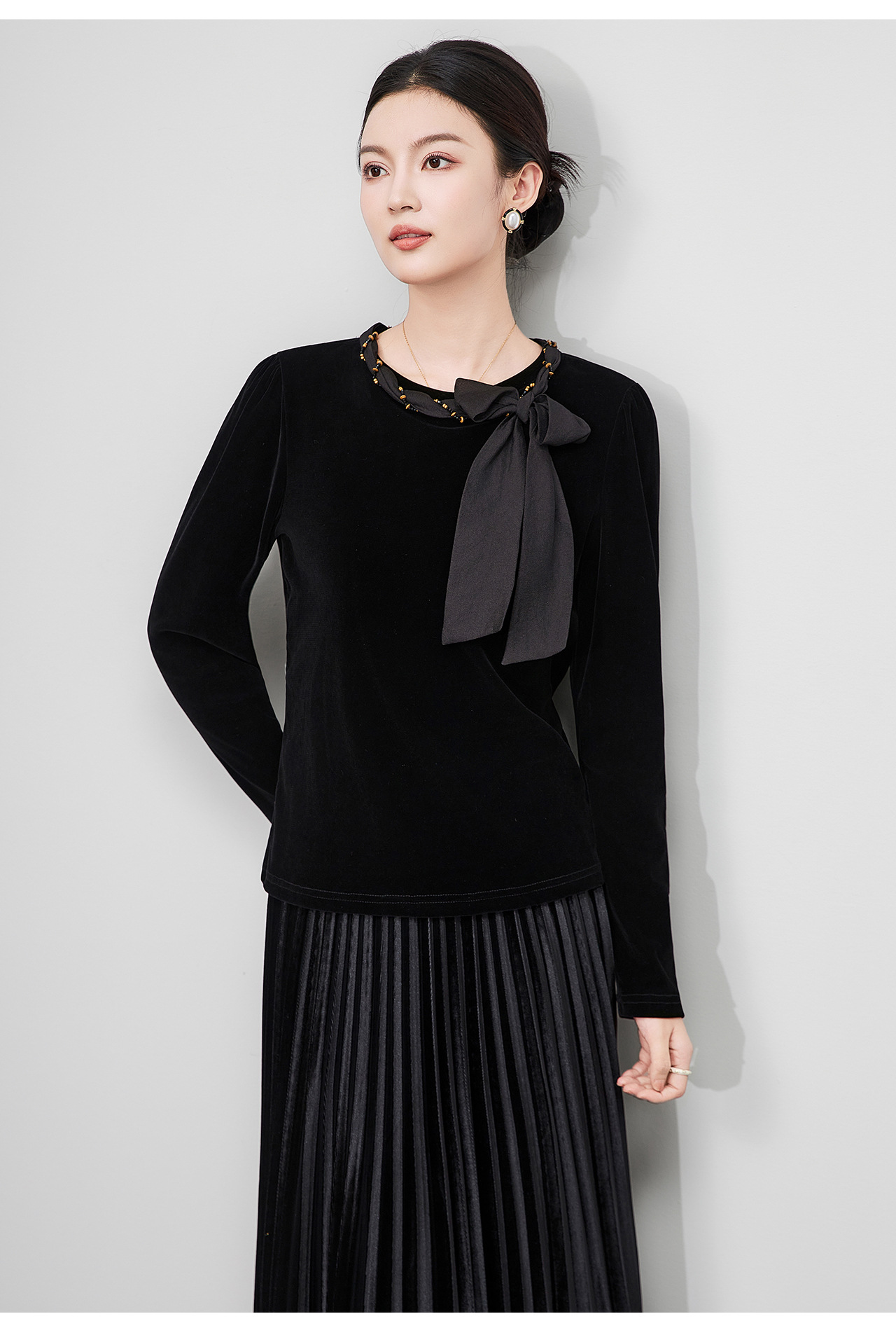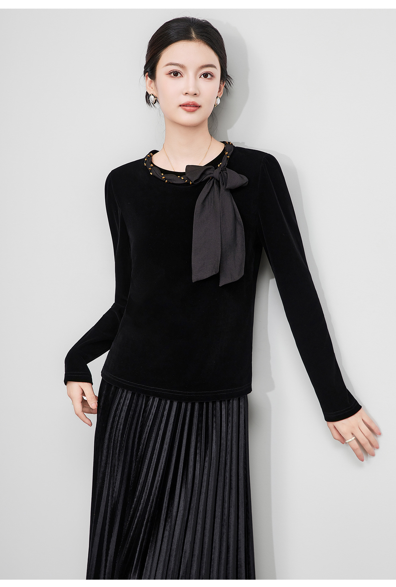 「高货wl」全新升级【铂金会员266/天猫359/差价93】(03804)洛诗琳2025秋季气质链条系脖蝴蝶结飘带修身显瘦丝绒上衣