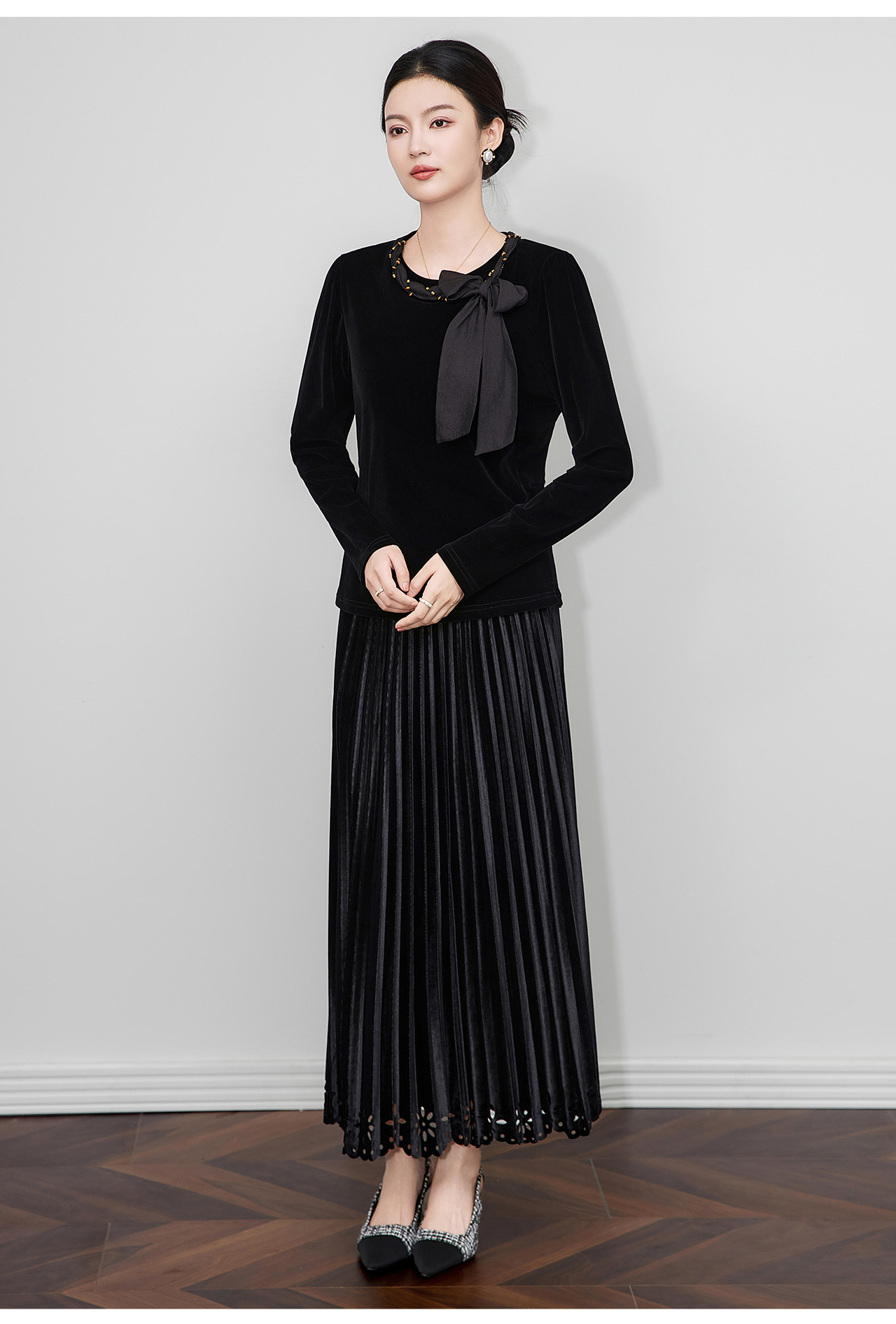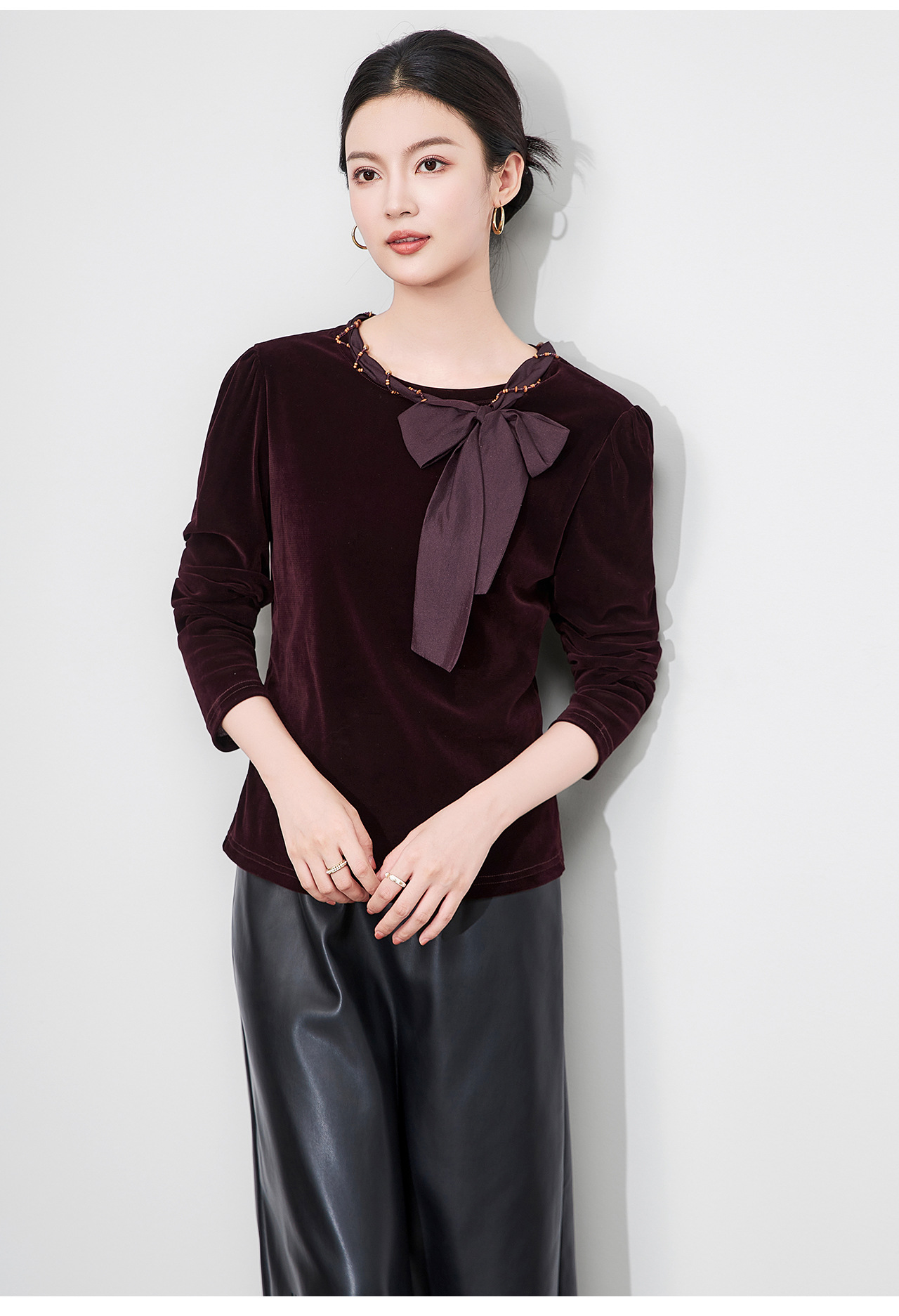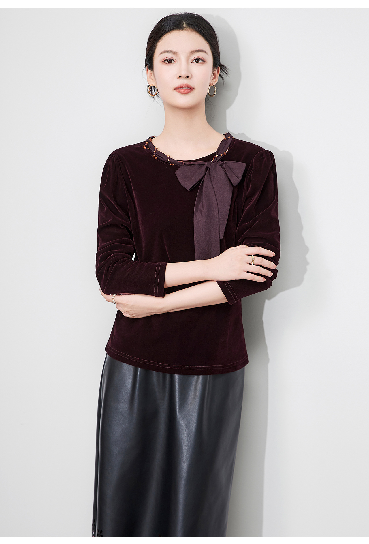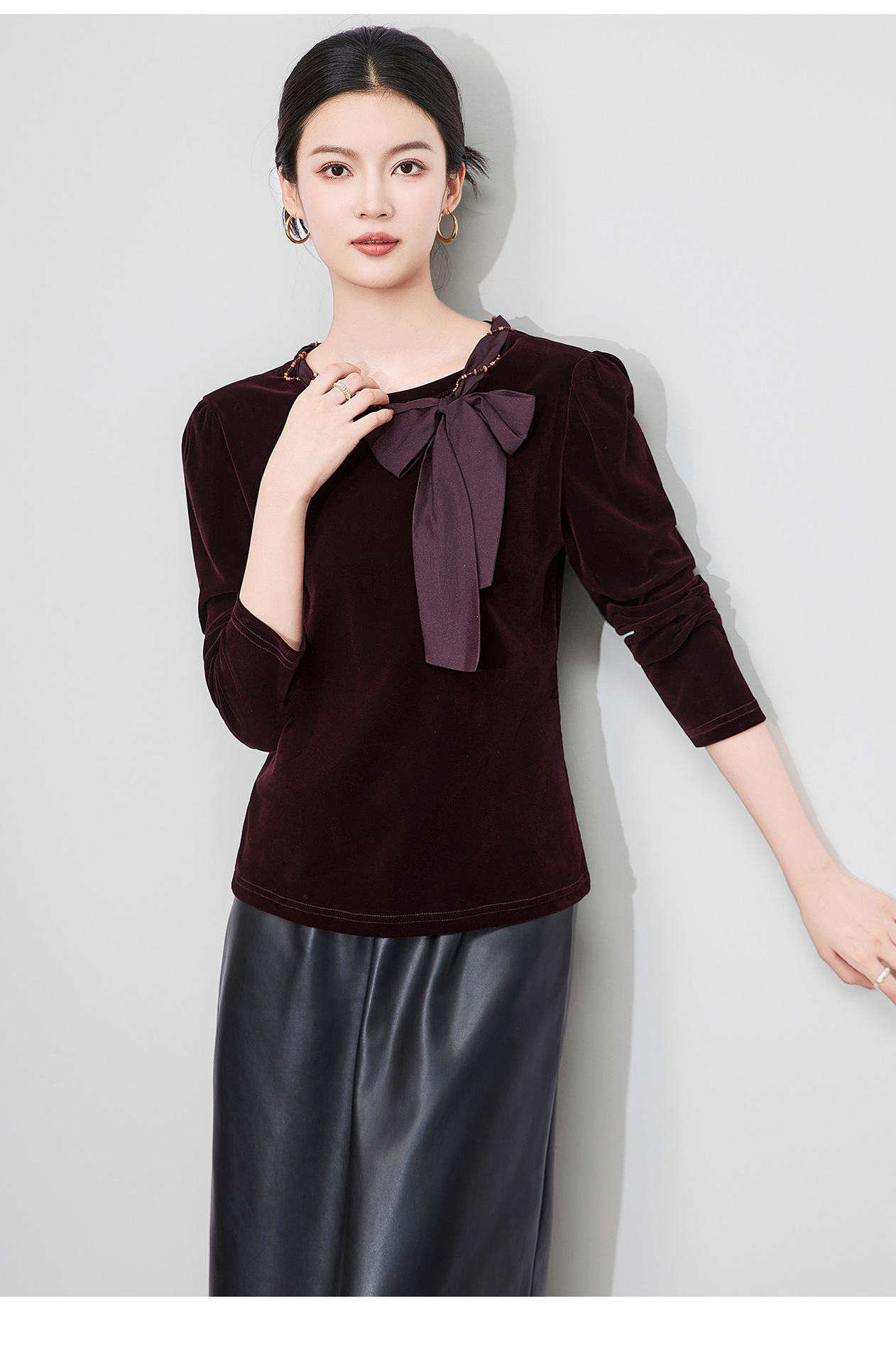 「高货wl」全新升级【铂金会员266/天猫359/差价93】(03804)洛诗琳2025秋季气质链条系脖蝴蝶结飘带修身显瘦丝绒上衣