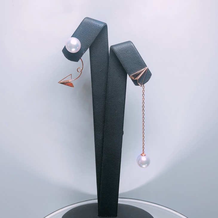 「童心.折纸」之纸飞机,用18K玫瑰金金手工精制成折纸飞机的造型,其中一侧耳上是8mmAkoya珍珠,耳背是带看飞行轨迹的折纸飞机正向前飞来,动感十足;另一侧的耳钉是折纸飞机,机翼特意做成镂空效果,平添趣味;一粒8毫米直径无瑕Akoya珍珠吊在飞机下方,灵动飘逸;珍珠耳钉及飞机可以可以单独佩戴,耳背的飞机和垂落的珍珠也可以与其它耳钉搭配,一物多用,与不同场合或着裝搭配,清新自然。