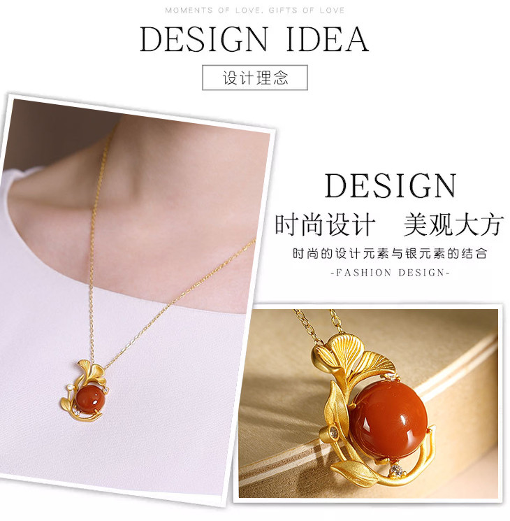 CW001-77S925纯银镀金南红玛瑙个性银杏叶高档气质女士复古吊坠套链