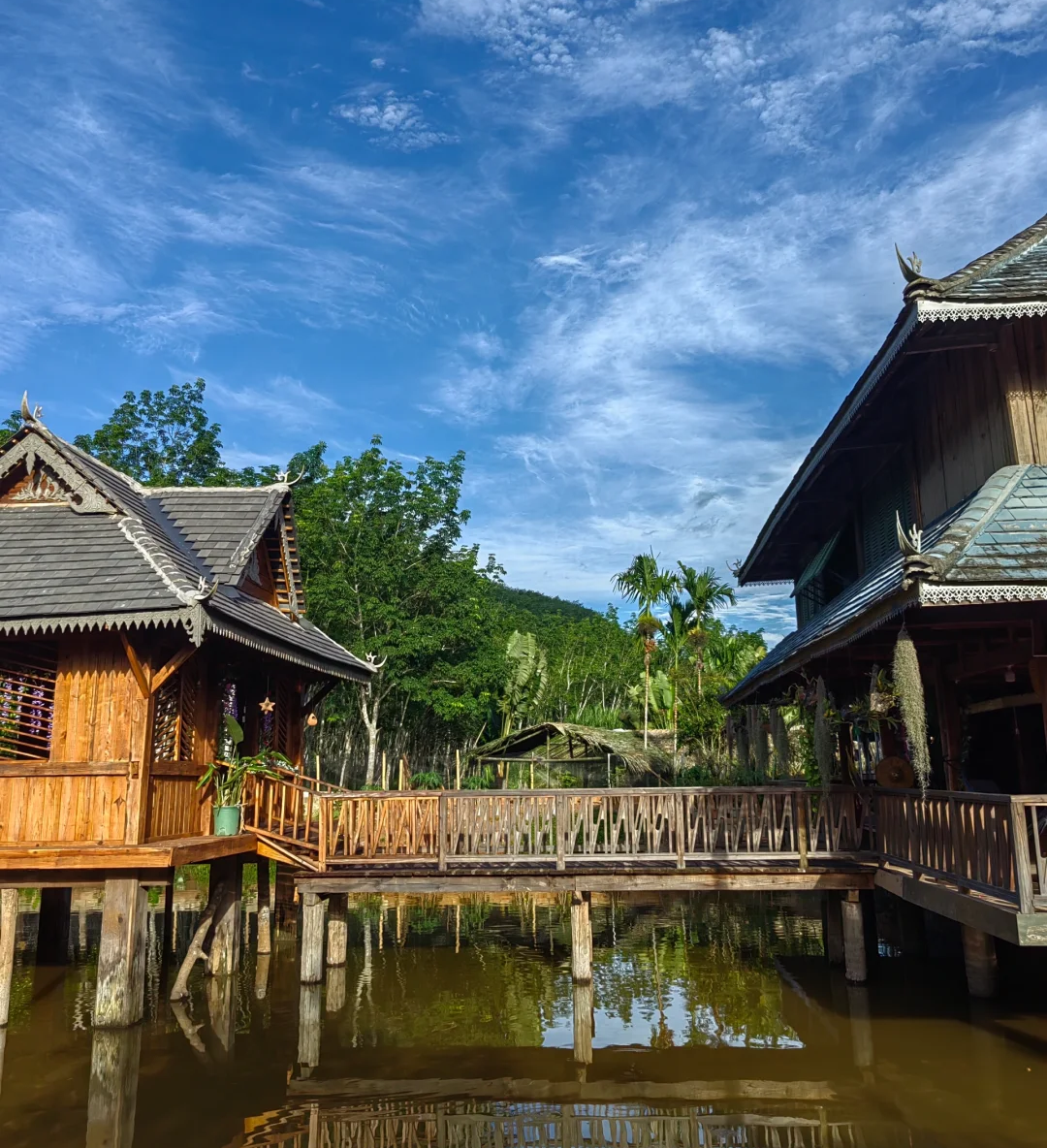 游玩结束后前往热播剧《边水往事》取景拍摄地—【曼掌村】,打卡主要拍摄地点—曼掌村哈哈之家。观赏傣族传统建筑以及热带植物,周围被茂密的热带雨林环绕,村里也种满了各种热带植物,村里游客很少,环境静谧且舒服,在村里可以自费参与非遗文化体验:制作傣陶、造纸等。
