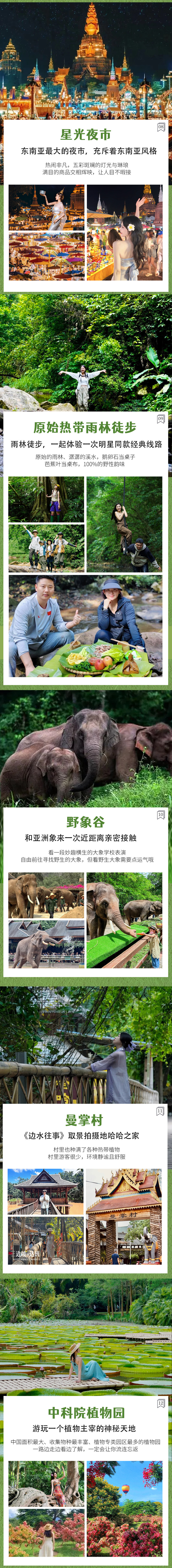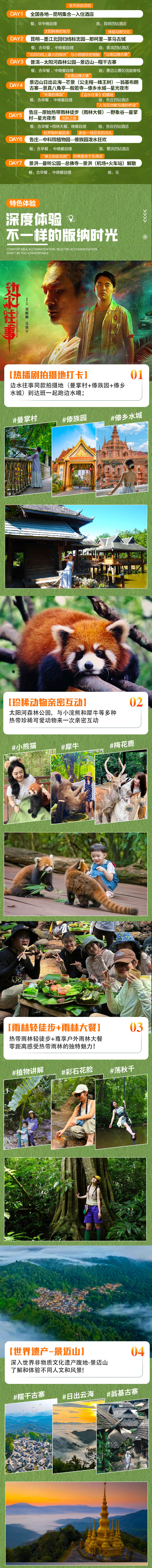 【特别体验】:1)户外体验:特别安排体验热带雨林轻徒步+尊享户外雨林大餐,零距离感受热带雨林的独特魅力;2)世界遗产:深入世界非物质文化遗产腹地-景迈山,了解和体验不同人文和风景;3)民族人文体验:体验民族普洱茶文化和傣族同胞泼水狂欢;