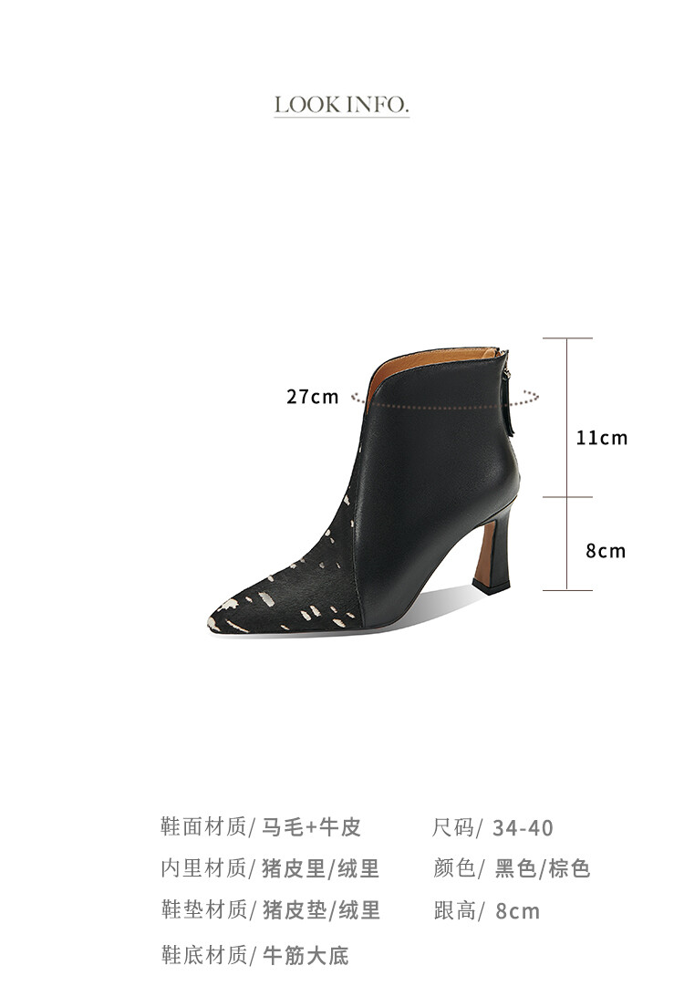 【货 号】:6028【颜 色】:黑色 棕色【鞋面材质】:牛皮+马毛【内里材质】:绒里 猪皮【尺 码】: 34-40(大小定制不退换)【鞋底材质】:牛筋底【跟 高】:8cm