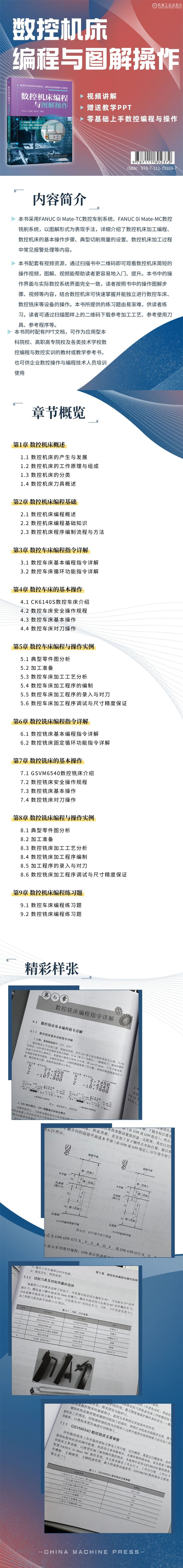 本书采用FANUC 0i Mate-TC数控车削系统、FANUC 0i Mate-MC数控铣削系统,以图解形式为表现手法,详细介绍了数控机床加工编程、数控机床的基本操作步骤、典型切削用量的设置、数控机床加工过程中常见报警处理等内容。同时,本书在编写过程中结合机床操作内容融入思政要素,主要体现在精益求精的大国工匠精神、团队合作精神、职业素养、劳动教育等方面。