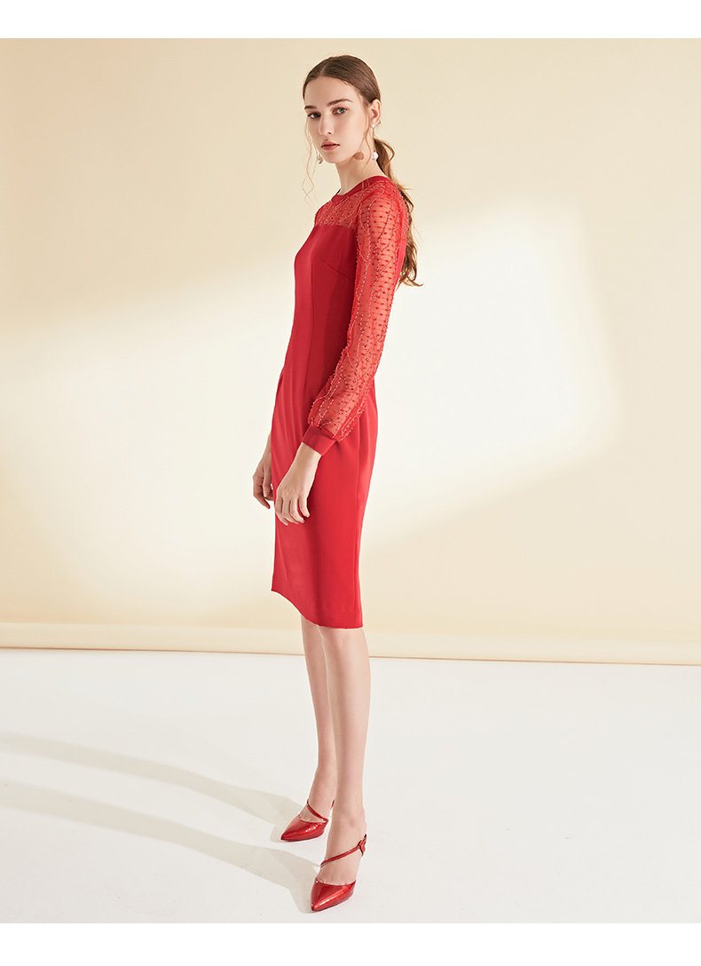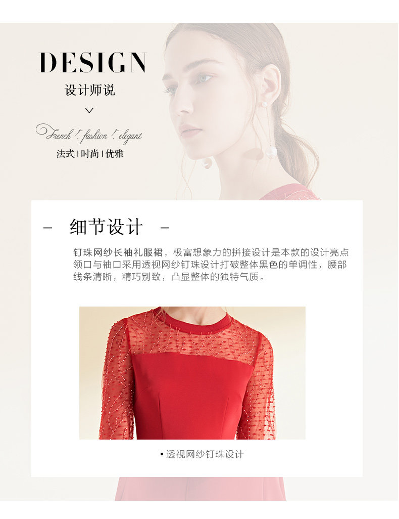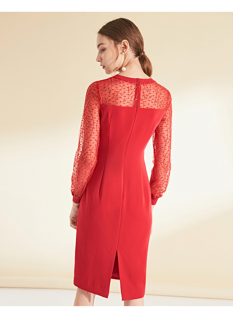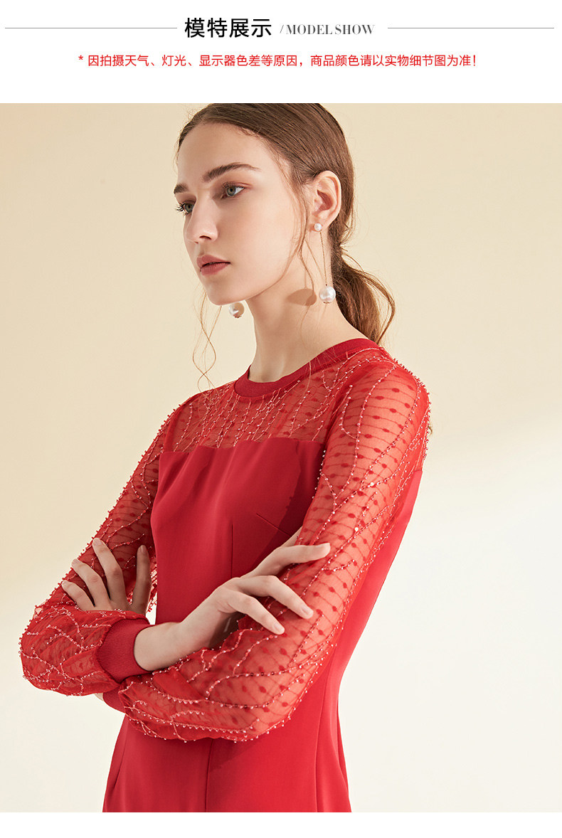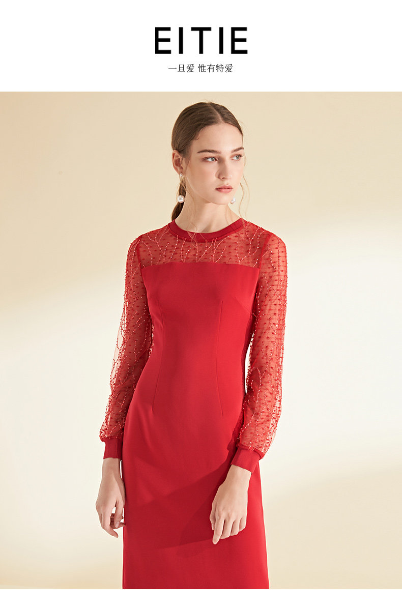 EITIE爱特爱女装初秋长袖红色网纱钉珠晚装小礼服连衣裙宴会6077705