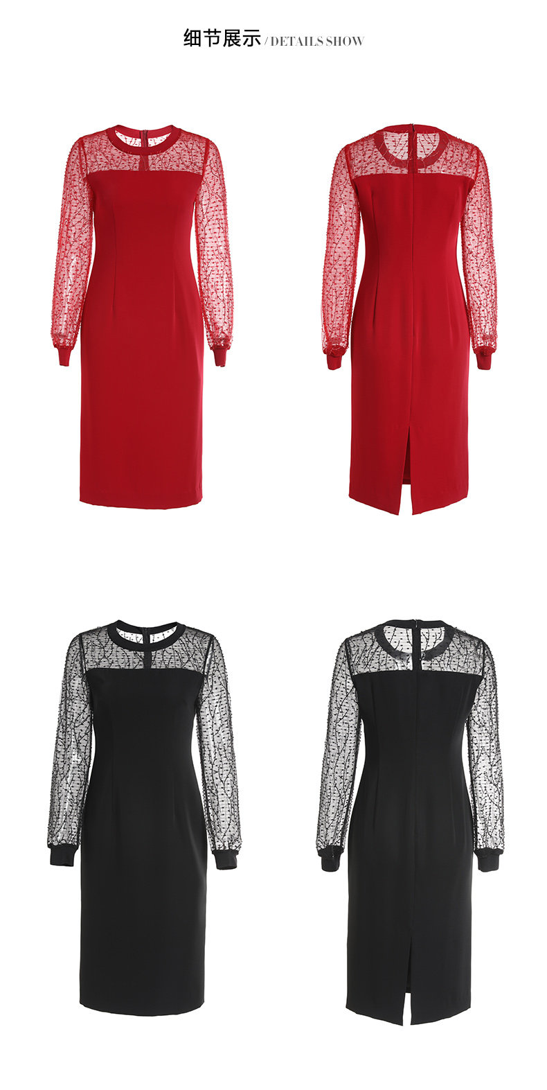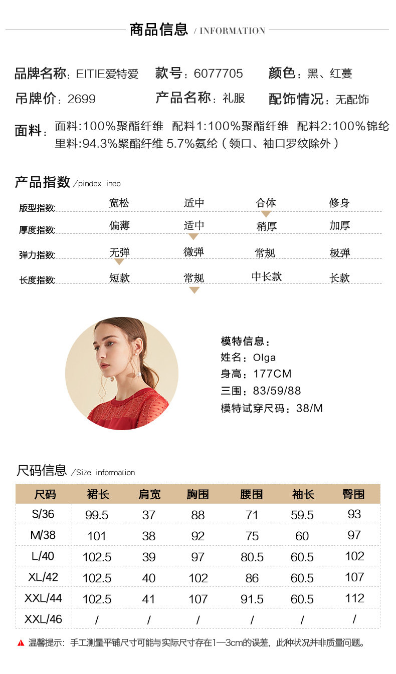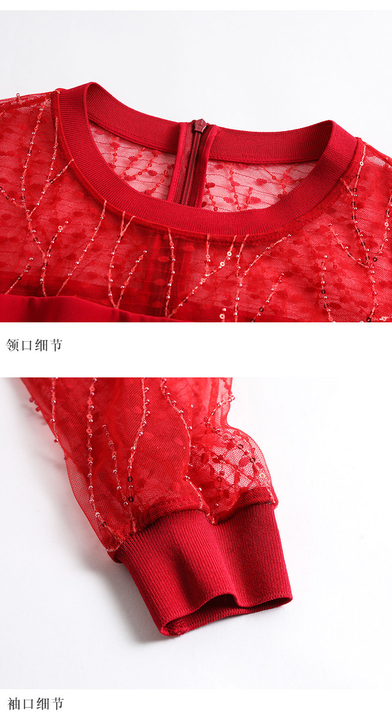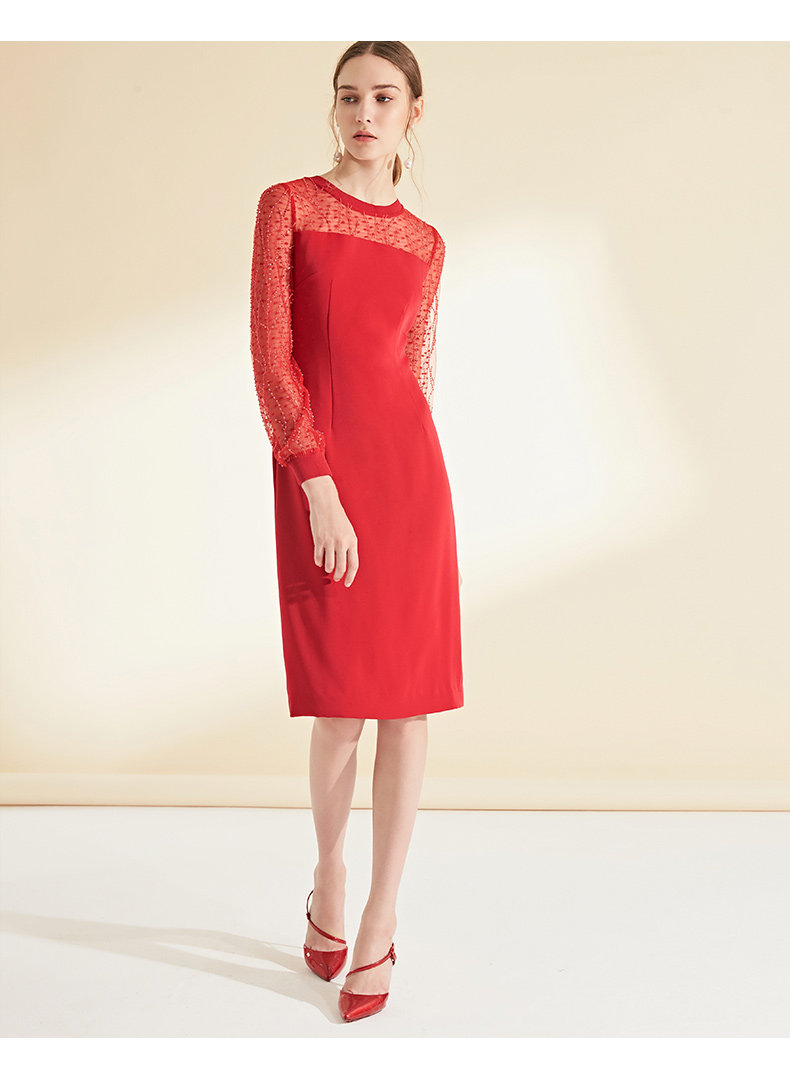 EITIE爱特爱女装初秋长袖红色网纱钉珠晚装小礼服连衣裙宴会6077705