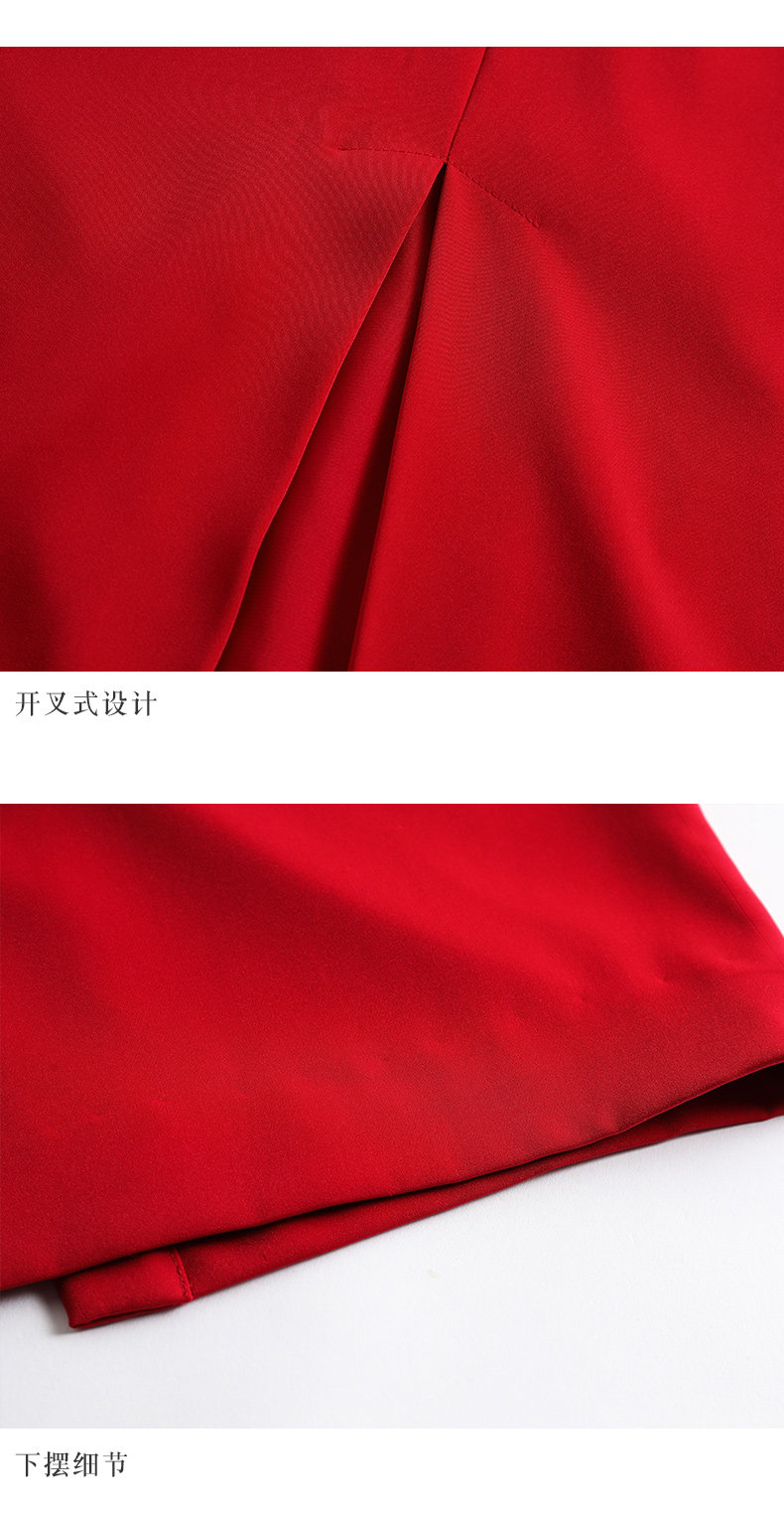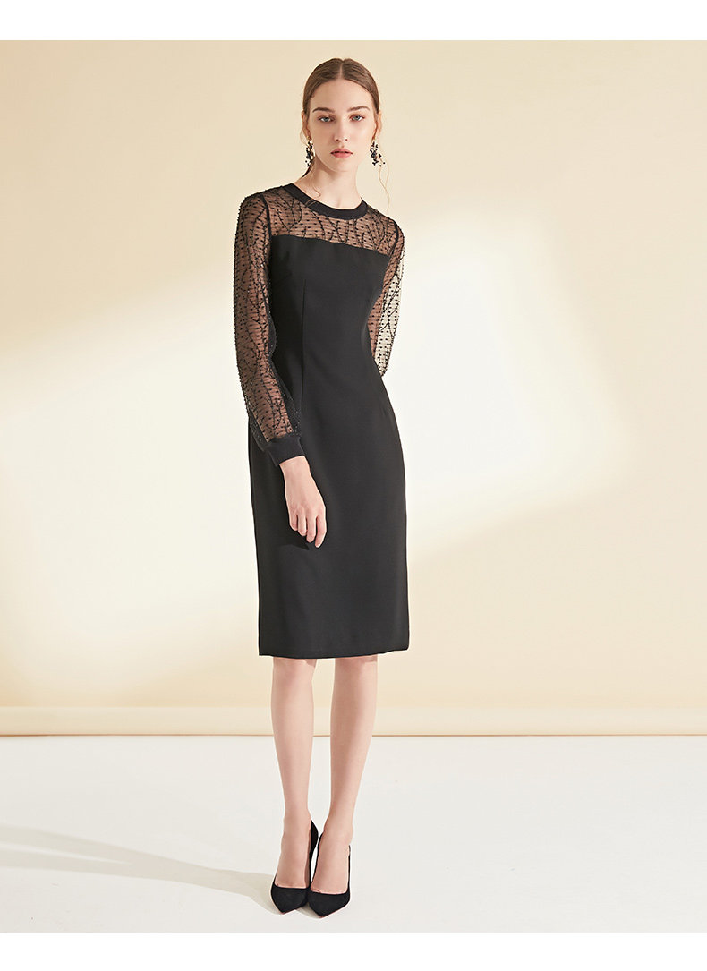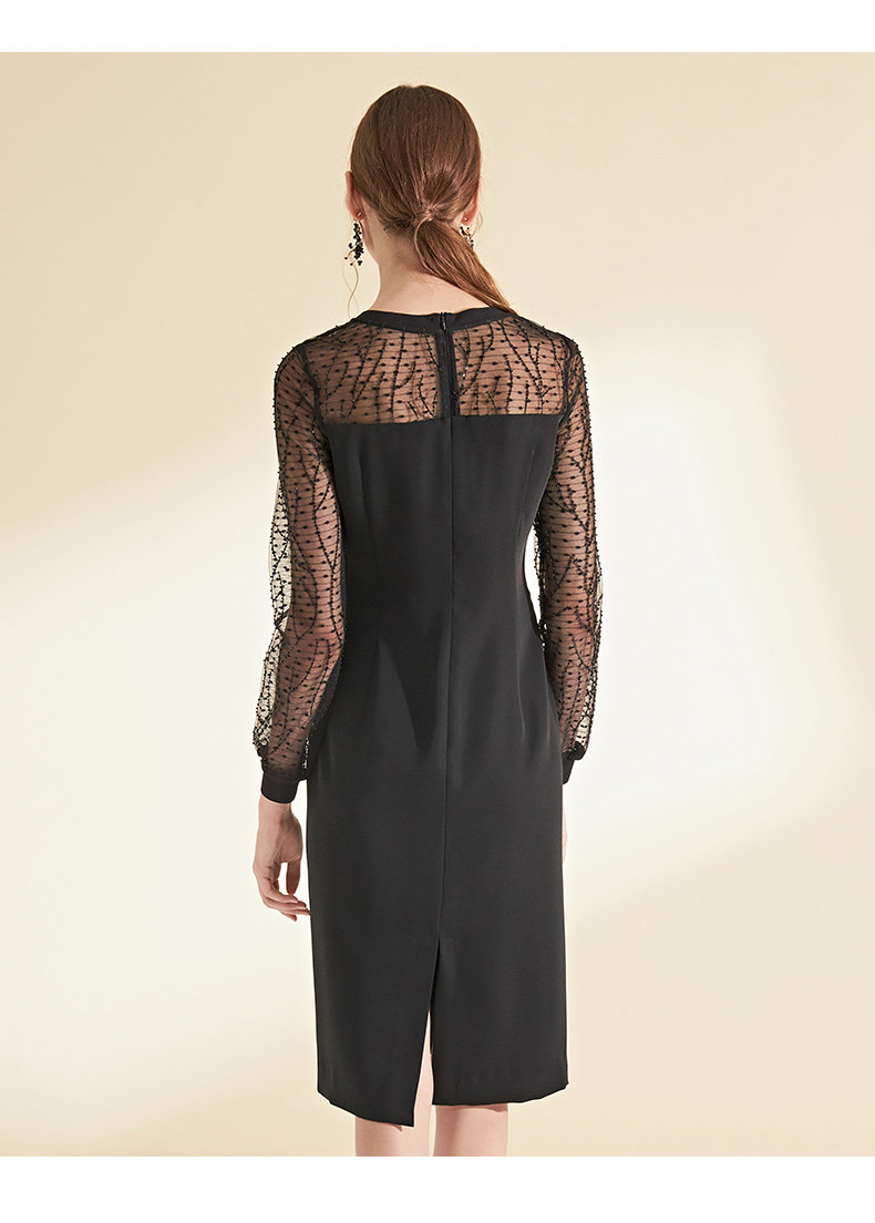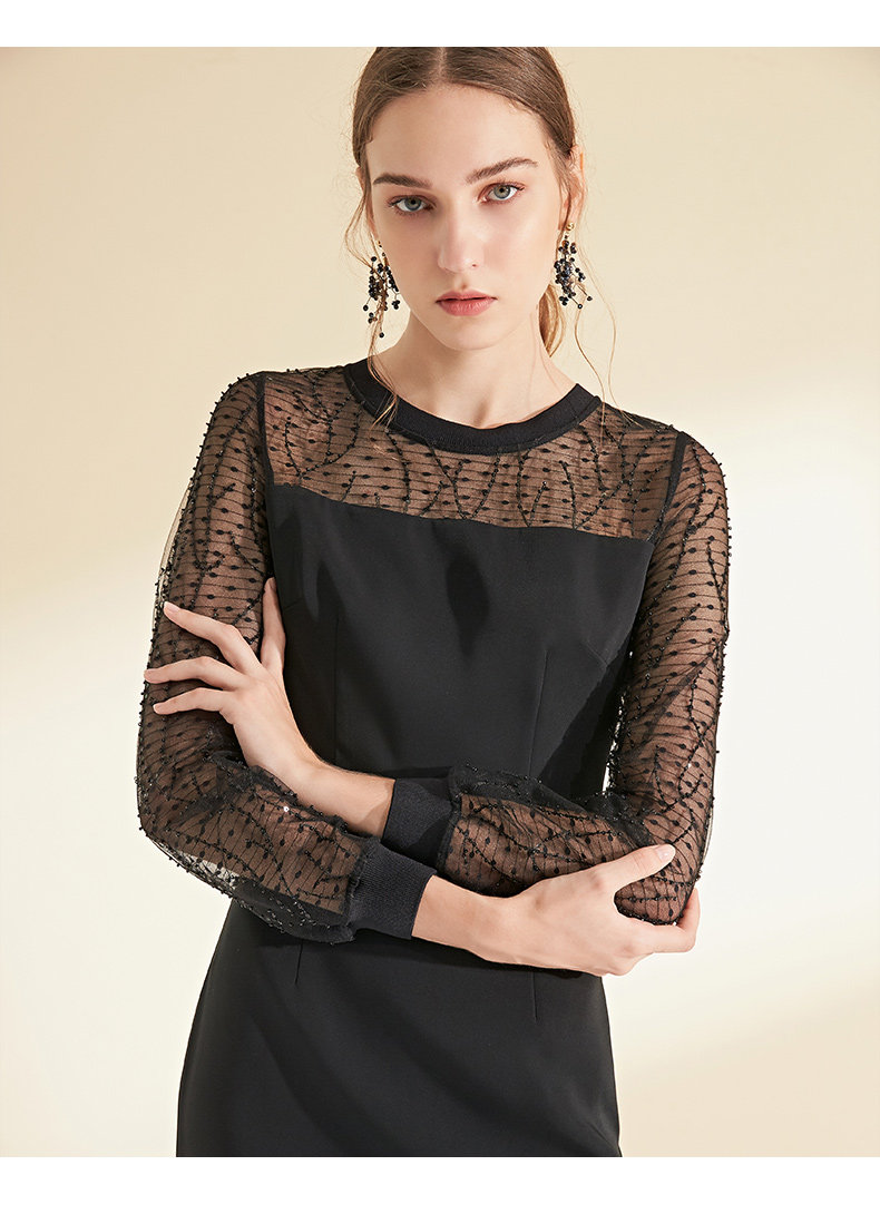 EITIE爱特爱女装初秋长袖红色网纱钉珠晚装小礼服连衣裙宴会6077705