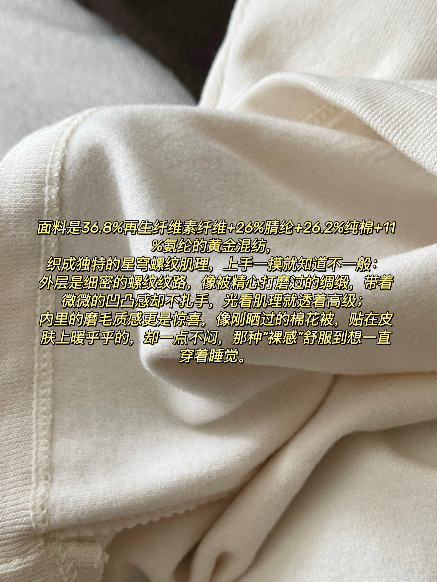 织成独特的星穹螺纹肌理,像被精心打磨过的绸缎,带着微微的凹凸感却不扎手,光看肌理就透着高级;内里的磨毛质感更是惊喜,像刚晒过的棉花被,贴在皮肤上暖乎乎的,却一点不闷,那种“裸感”舒服到想一直穿着睡觉。